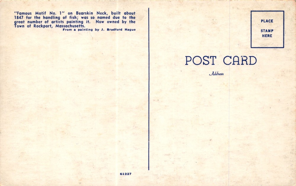 MAKE AN OFFER. THE MORE YOU BUY THE BETTER DEAL I WILL ACCEPT The postcard features a painting of Famous Motif No. 1 on Bearskin Neck in Rockport, Massachusetts. This building, constructed around 1847 for fish handling, earned its name due to the numerous artists who painted it. It is now owned by the Town of Rockport. The image on the postcard is from a painting by J.