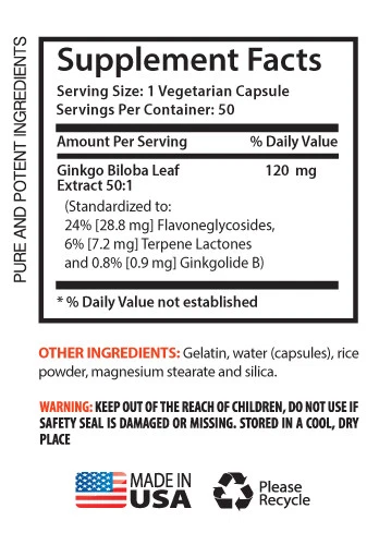 VISIT OUR STORE Ginkgo Biloba Anti-Aging Properties, Improve Vision Health, Stimulate Blood Flow, Helps Memory Enhancemen, Powerful Antioxidant (1 Bottle, 50 Capsules) Distributed by Sport Nutrition & Vitamins LLC (Manufactured in USA) History of Ginkgo Biloba: Ginkgo biloba is the oldest known living tree species with fossils dating back 270 million years. It literally grew when dinosaurs roamed the earth, making it truly a living fossil. You can now find these extraordinarily hardy trees growing in cities throughout the world. They are resistant to disease, insects, and modern day air pollution. Some living specimens are over 2,500 years old. A handful of ginkgos were at the Hiroshima atomic bomb blast epicenter … and they survived. Amazingly, these trees are still alive today. Within this time, the ginkgo biloba tree has been used by numerous cultures as a traditional medicine and a source of healing food. Of more than 40 different components in the ginkgo biloba tree, scientists have identified two that they believe are responsible for its health benefits: flavonoids and terpenoids. These two components are credited with everything from boosting memory and mental sharpness to improving blood flow. Benefits Of Ginkgo Biloba: Bladder Problems Intestinal Worms Increasing Sex Drive Cognitive Enhancementand Other Uses Effectively Enhance Memory Helping To Increase Blood Flow Sleep Better Combat Stress Improved Blood Flow To The Brain Increase The Release Of Nitric Oxide Improve Athletic Performance Powerful Antioxidant Ginkgo Biloba Improve Vision Health: The common reason for using ginkgo biloba is its powerful effect on vision. Not only do the antioxidants in ginkgo biloba help to keep the ocular system clear of oxidative stress, thereby preventing macular degeneration and cataracts, but for people who suffer from glaucoma and other vision issues, GBE has actually been shown to improve vision and increase long-distance sight capacity. Ginkgo Biloba May Decrease Pain Relief: There are mild analgesic qualities to ginkgo biloba, likely resulting from anti-inflammatory properties in the organic compounds. In other words, when inflammation decreases, so too does the pain it causes. This makes it a popular option for people recovering from injuries or wounds, as well as those who suffer from chronic headaches. Ginkgo Biloba Stimulate Blood Flow: Research has definitively shown that ginkgo biloba extract is able to increase blood vessel dilation and stimulate blood flow to extremities in the body, including the skin and essential organs, properly oxygenating the entire body and boosting energy and strength. This increase in blood flow also helps people who suffer from claudication or poor circulation, allowing them to walk longer distances without pain. Ginkgo Biloba Anti-Aging Properties: One of the most “pop culture” uses of ginkgo biloba is as an anti-aging secret. While many of the claims are a bit exaggerated, the antioxidants in GBE do help the skin remain tight and healthy, slowing the appearance of wrinkles and other age spots, as well as helping to speed up wound healing and lessen the appearance of scars. Ginkgo Biloba May Helps Memory Enhancemen: Memory enhancement is front and center on the list of Ginkgo Biloba benefits. The ability of the supplement to enhance factual recall is well-documented over a thousand year history. Ginkgo also helps to promote intellectual function, stimulate mental clarity, and create the ability to concentrate intensely. It is an energetic supplement, lifting mood and easing symptoms of depression. At the same time, it can bring relief to hyperactive minds by giving them strong control over thoughts without heavy sedation. Ginkgo’s quality of increasing circulation benefits not just the brain, but all of the organs and tissues of the body. This is the reason that ancient Chinese medicine prescribed it for so many different minor ailments. It can reduce bronchial tube inflammation, make breathing easier for asthma patients, ease the symptoms of PMS, and reduce muscle pain throughout the body. Ginkgo Biloba as Powerful Antioxidant: Antioxidants help our body to fight free radicals. Think of free radicals as a web of chemicals which attacks our bodies and damages our tissues. Well, Ginkgo Biloba features an impressive number of antioxidants that can greatly improve your immune system. Ginkgo Biloba Protects Brain Cells: The terpenoids contained by Ginkgo Biloba have a great role in dilating blood vessels from our brain, leading to an increased blood flow in our whole body. After consuming this plant people have reported improved concentration, improved memory, improved learning and improved moods. Serving Size: 1 Vegetarian Capsule Servings Per Container: 50 Supplement Facts: Ginkgo Biloba Leaf Extract 50:1 (Standardized to: 24% [28.8 mg] Flavoneglycosides, 6% [7.2 mg] Terpene Lactones and 0.8% [0.9 mg] Ginkgolide B) 120 mg Other Ingredients: Capsule (cellulose, water), rice powder, magnesium stearate and silica. SUGGESTED USE: As a dietary supplement, take one (1) vegetarian capsule daily with meals, or as directed by your health care professional. Beat Stress - GINKGO BILOBA EXTRACT 120mg - Ginkgo Biloba Antioxidant 1B CAUTION: Do not exceed recommended dose. Pregnant or nursing mothers, children under the age of 18 and individuals with a known medical condition should consult a physician before using this or any dietary supplement. *These statements have not been evaluated by the Food and Dug Administration. This product is not intended to diagnose, treat, cure or prevent any disease. GREAT QUALITY PRODUCT