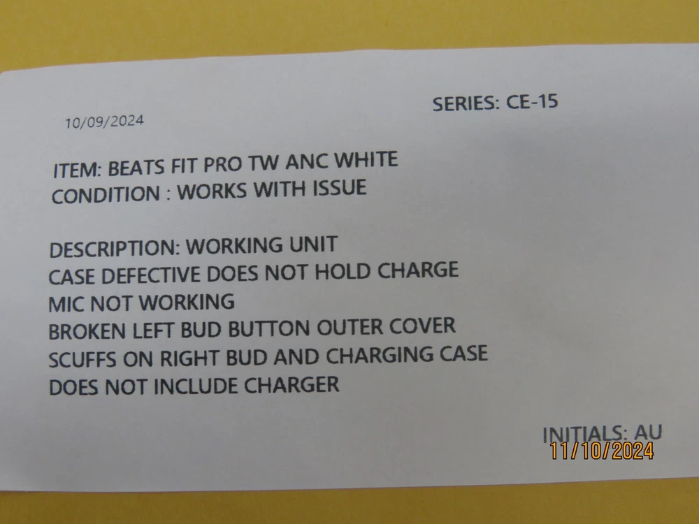 Beats by Dr. Dre Fit Pro True Wireless Earbuds - Beats White (DEFECTIVE) [CE15] Functional Condition: Tested and Functional With Issue. ISSUE: Case Defective. Does Not Hold Charge. Mic Not Working. Broken Left Bud Button Outer Cover. Scuffs On Right Bud & Charging Case. Cosmetic Condition: This is a Used Item and Normal Wear (Scuffs & Scratches) is Expected. Items included in this listing: Headphones Charging Case Ear Tips (1 Pair) Items NOT included in this listing: N/A Thank you for Shopping with Us! ENJOY Free Shipping in USA & Low Cost Shipping to CANADA! Terms of Sale NOTE: Our Listings only include items as pictured - Please do not assume any item is included if its not pictured. We will try our best to picture all items included in this listing as well as its cosmetic condition. We Guarantee & Stand Behind our product and commitment to provide you with o nly Original, Branded, OEM & Genuine Products Shipping A complete and correct shipping address is essential. We cannot guarantee the shipping address can be changed after checkout. Sales Tax will be charged to all Canadian & USA Buyers. Combined shipping is not guaranteed. We are unable to change any content of your order based on the eBay checkout note or PayPal message. Customers with shipping addresses outside of the U.S.A and Canada are responsible for all duties and import taxes. Please contact your customs for information Bidding All items are accurately described and pictured. Please ensure you are consciously bidding on the items as described. Payment Payments are expected at the time of purchase or in case of Auctions, at the end of auctions. Payments are managed via eBay Managed Payments Contact Us Your positive feedbacks are extremely valuable to us. If you have any concerns about your order, please contact us through eBay message to resolve any issues before leaving a negative feedback or opening a dispute. We will reply within 24 Hours Return Policy All items are in used condition unless specified.