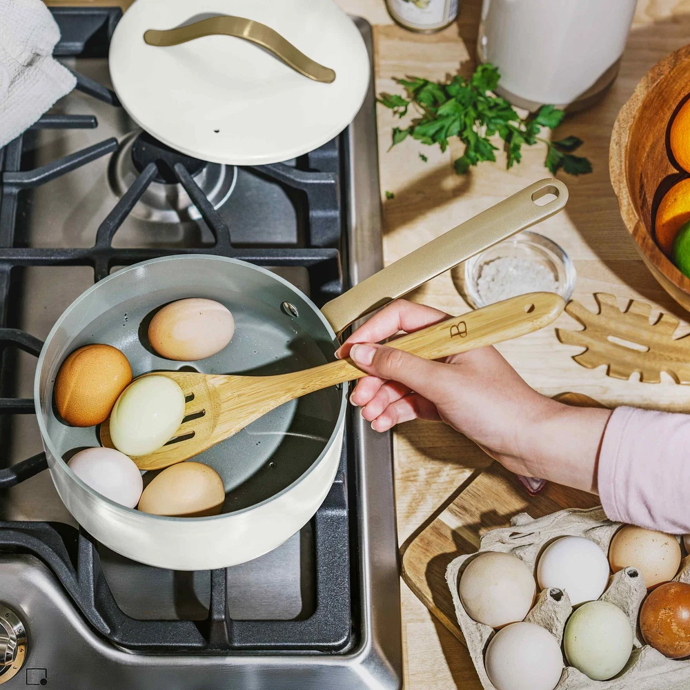 Beautiful 12pc Ceramic Non-Stick Cookware Set, White Icing by Drew Barrymore Made with a non-toxic, ceramic non-stick coating Durable construction for fast and even heating Sleek design with gold pressed forged aluminum lid handles Pressed forged aluminum lid for cohesive look and cooking control Oven safe up to 500°F, including pressed forged aluminum lids lids Dishwasher safe, handwash recommended Compatible with all stovetops, including induction 12-piece cookware set includes: 8" fry pan 10" fry pan 3qt sauté pan 2qt saucepan 5qt Dutch oven 4 cookware protectors 4 cookware protectors