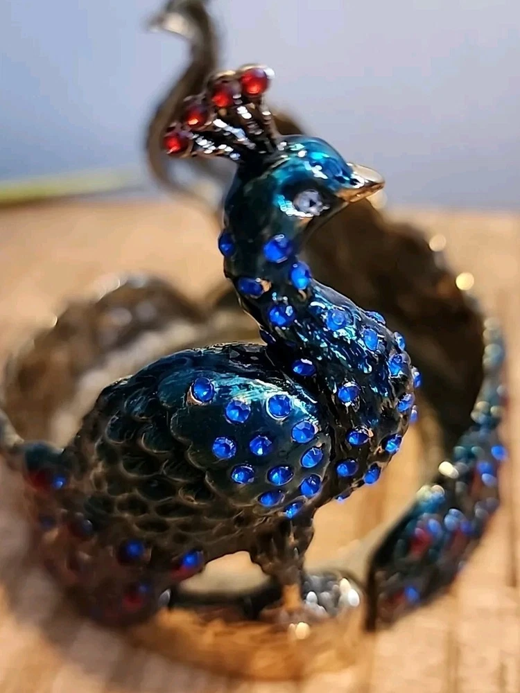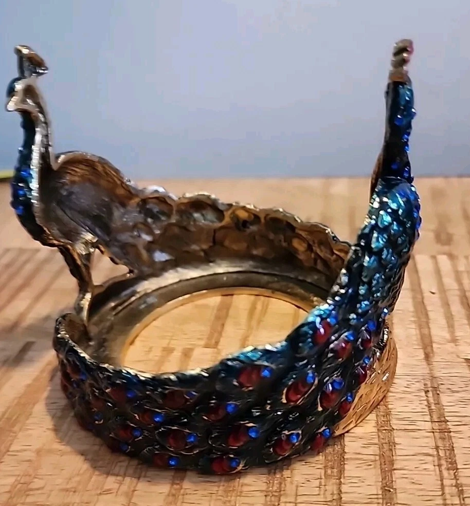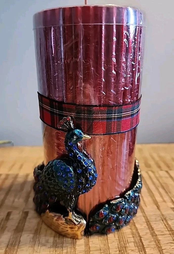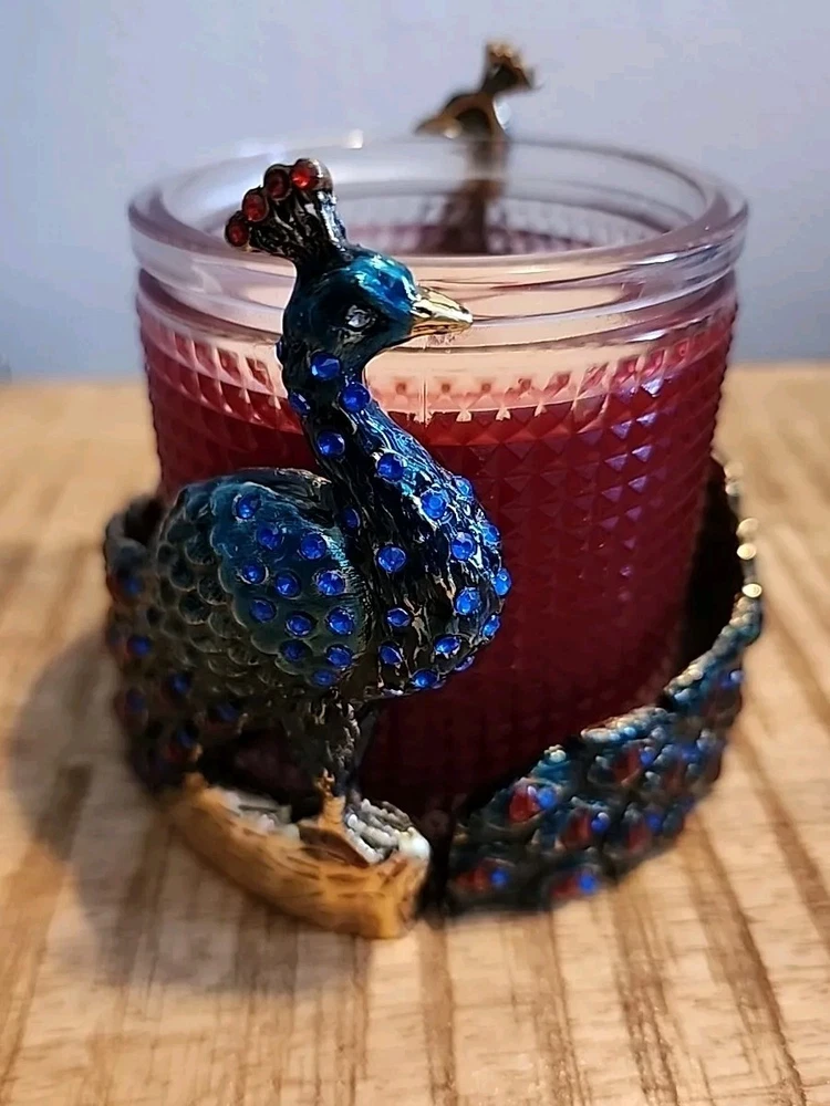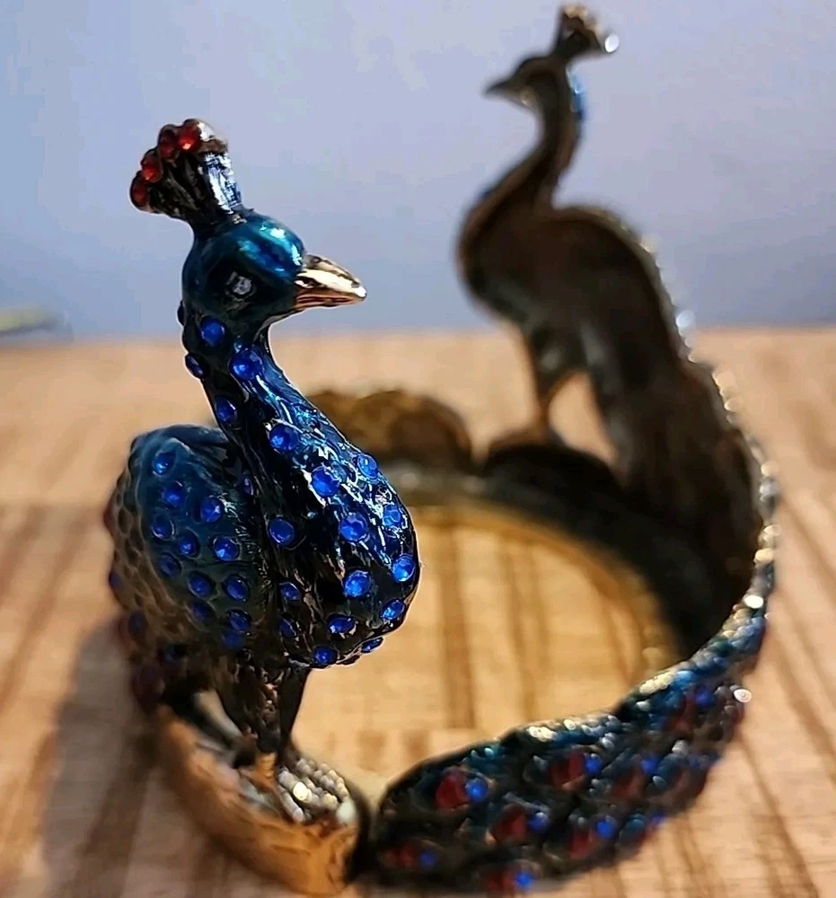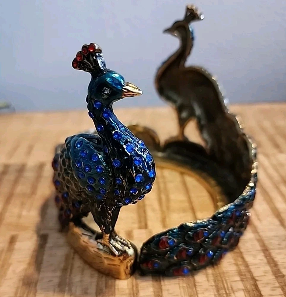 This beautiful candle holder features a unique design of twin peacocks made of solid brass, hand-painted and bejeweled with enamel. The peacocks are depicted in a circular shape, standing at medium size with dimensions of 3.75 inches in length and width, and 4 inches in height. The intricate pattern of peacocks adds a touch of elegance and fantasy to any room, making it suitable for all occasions and adult use. This candle holder from the 1980s has a multicolor finish and is a decorative piece suitable for furniture in any room. All sales are final. Candles not included.