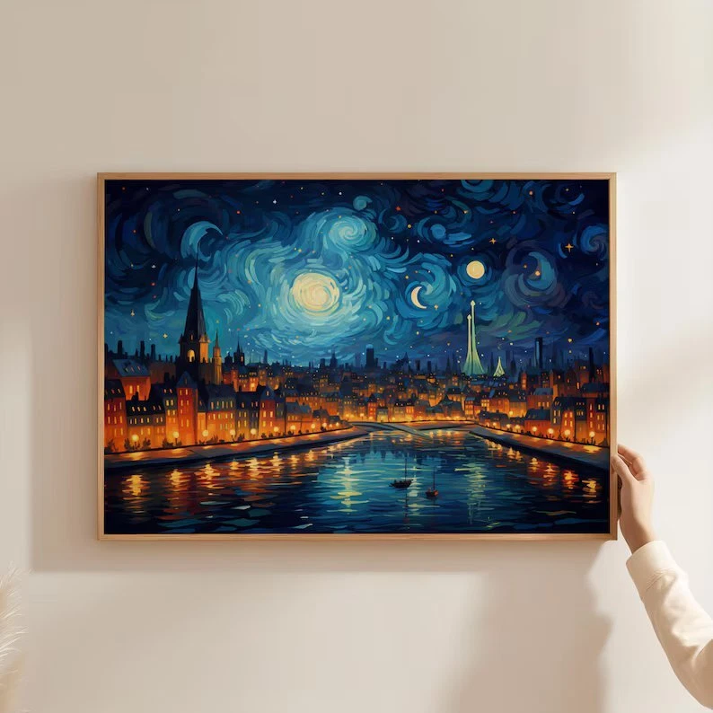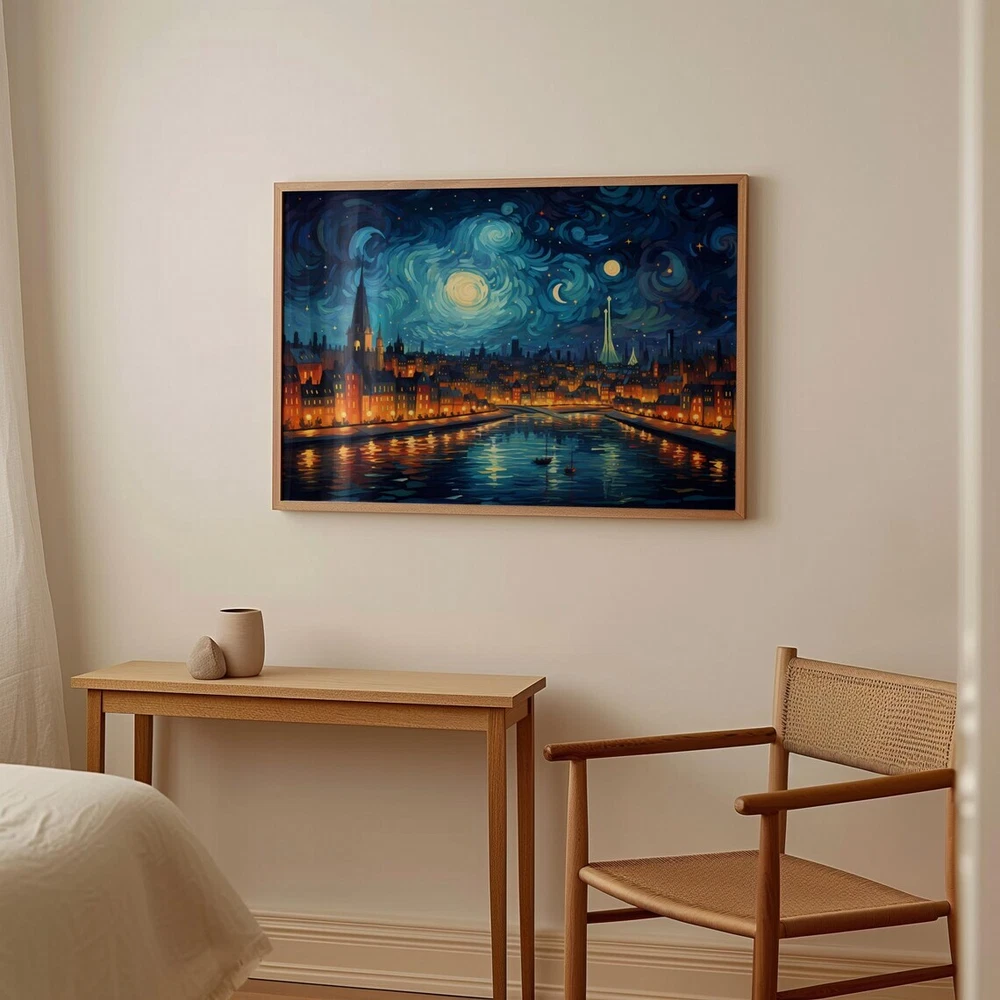 Beautiful City by Lake at Night Painting Poster Premium Quality Choose your Size