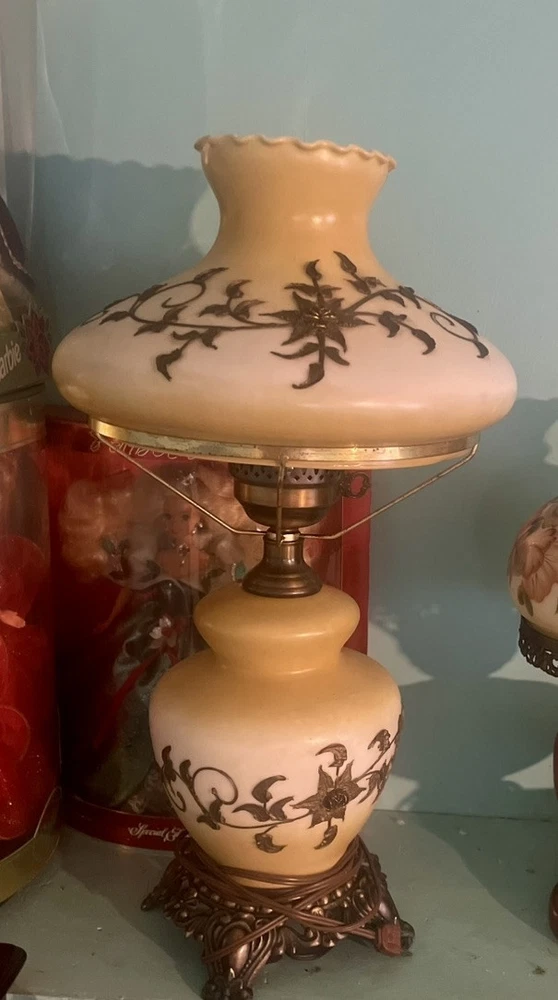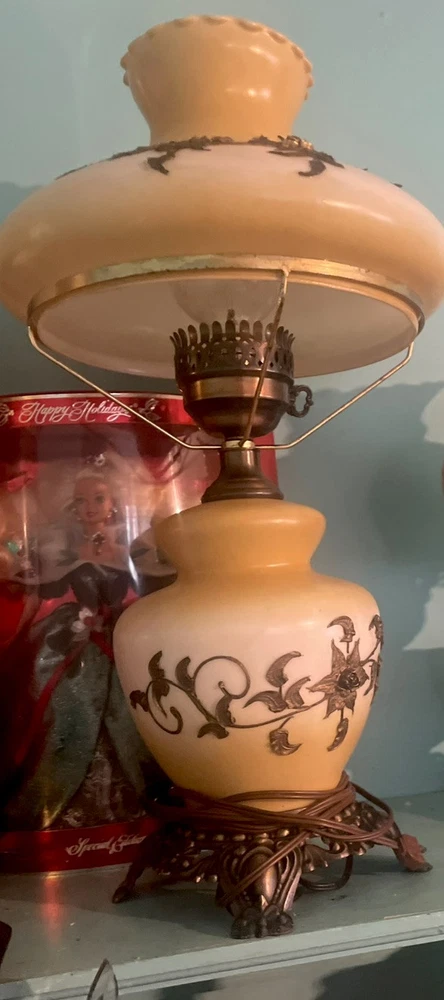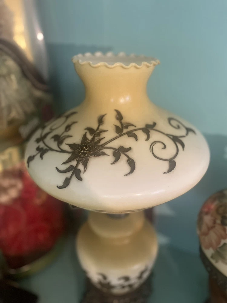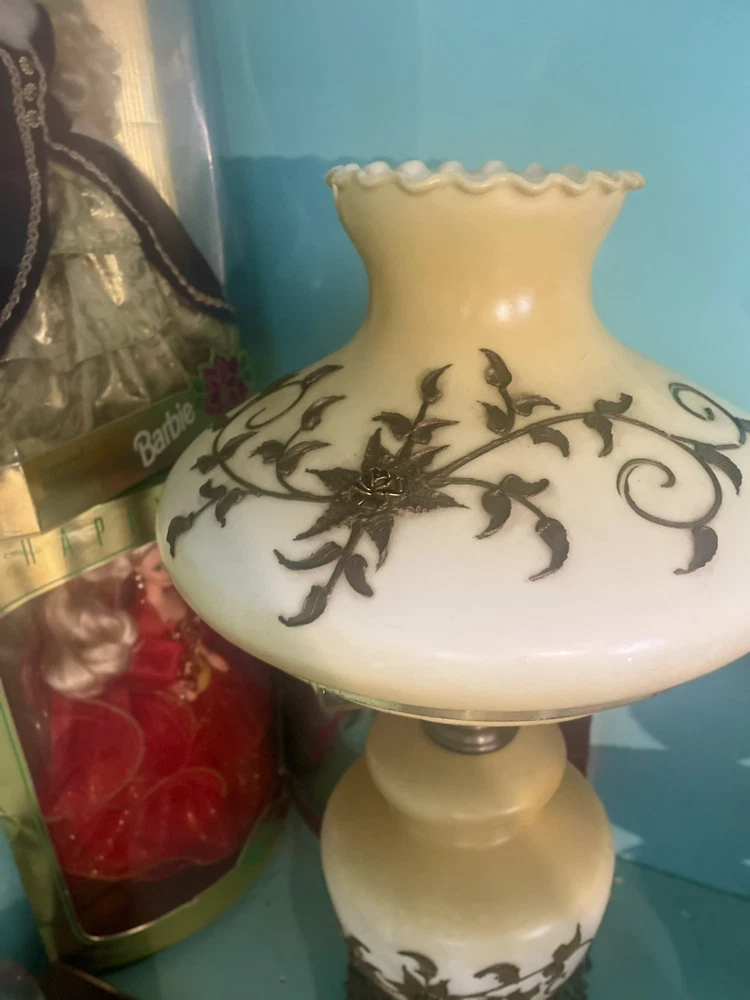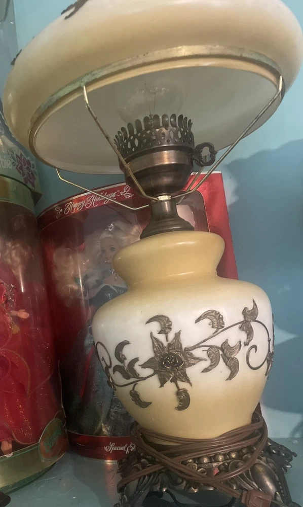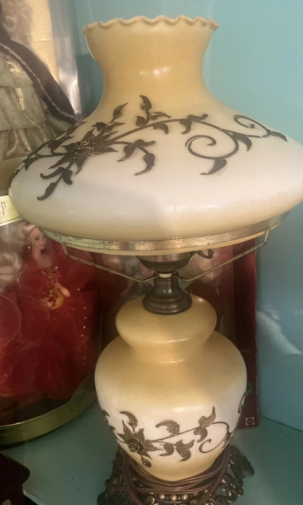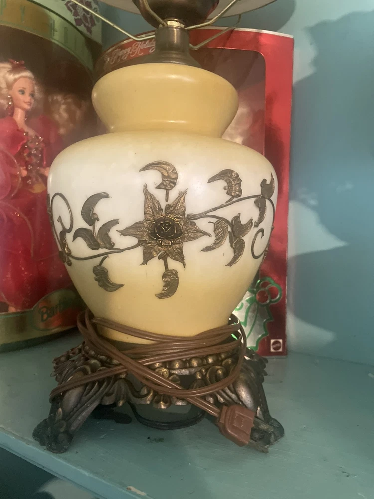 This is a beautiful hand-painted porcelain and brass globe lamp from the 1950s. The lamp features a white and yellow floral design and is corded electric. It measures 20 inches in height and 11 inches in length and width. The lamp has a rotary knob and push button control style and a dimmer feature. It is an original vintage piece and has a shaded design with no shade. The lamp globe is made of porcelain and the base is brass. This lamp is perfect for adding a touch of vintage charm to any room in your home.