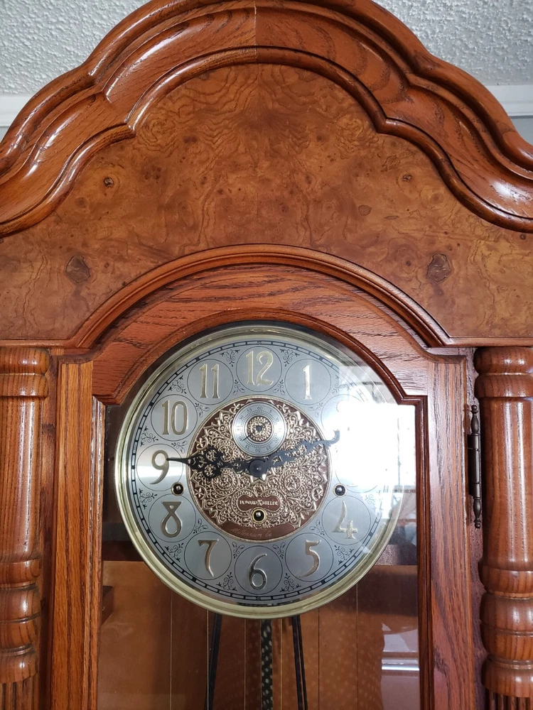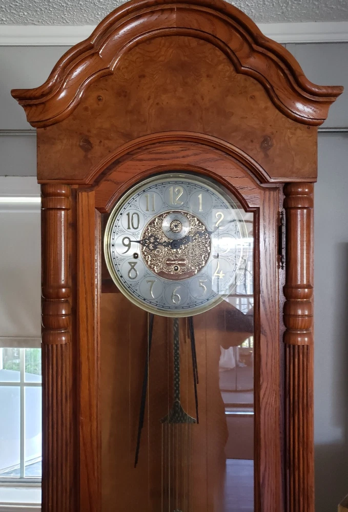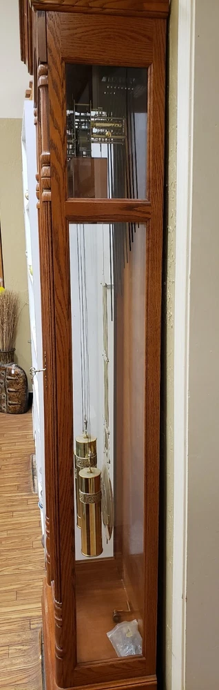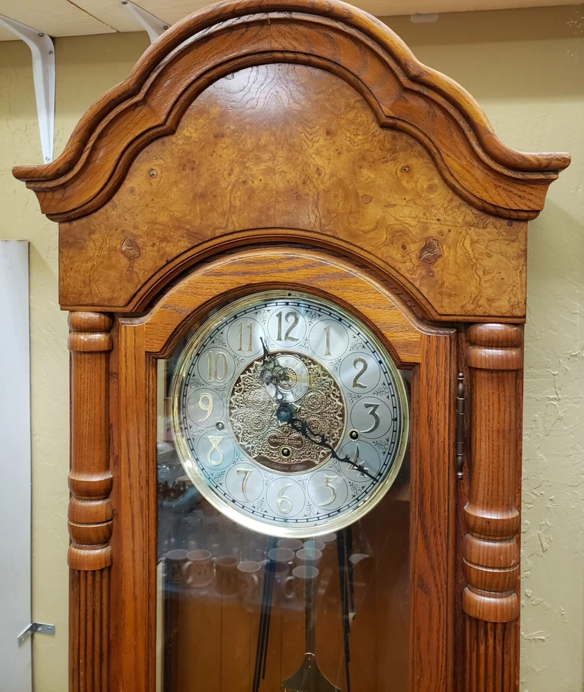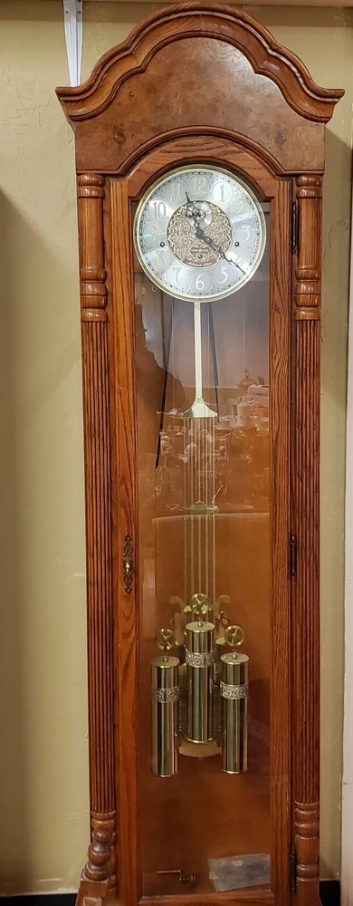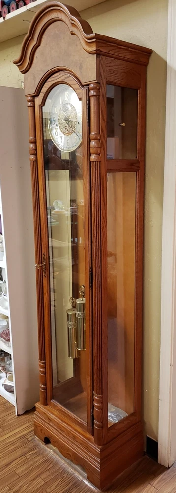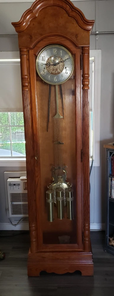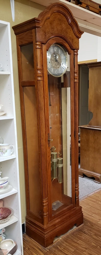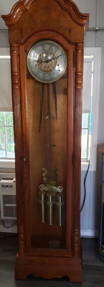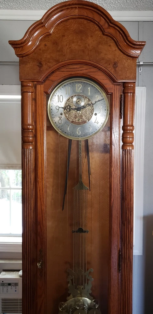 This clock is gorgeous and will be a statement piece in your home. It is 22" wide at its widest part, and 77 inches tall. The case is a warm rich oak with burl at the top adding excellent detail and style. Gold tone weights with tasteful design swing to keep pace on the time, with a pendulum of silver/gold accent. The face design is silver and gold tone, with a rotating second hand within the large face. Keeps perfect time, and announces each hour with lovely toned chimes. The original instruction manual is included. I am estimating $150 to ship the clock, however I have no idea how much until someone purchases it and we calculate how it is shipping and to what location. Ebay will calculate however before shipping we would check locally at UPS etc. The amount is only an estimate and I cannot guarantee it will ship for that amount. If it is more, I will inform you so that you can forward the additional costs. I will search out the most affordable but safe method to transport. OUR PREFERENCE IS you can arrange the shipping and we can work out the details. Local pick up is ideal. We have reduced the price this week, starting out at 1795.00 on the original listing I am downsizing and need to find a home for lots of clothes, handbags, shoes, electronics, collectables, pet products and other assorted things. Please see my other listings and keep watching as I will be continuing to list items. Item comes from a smoke free home. We accept PayPal, and ship nearly every day. Payment is due within 3 days of close of auction. If you have any questions contact me so that I can answer anything that will make your purchase a better one for you. Happy Shopping! Please take a look at our many quality listings. Any extra charges for shipping due to location are to be paid for by the buyer. I will combine shipping for cost savings on multiple purchases. If for an approved reason the item needs to be returned, buyer pays return shipping. I usually quote priority shipping, however if you want me to check other options, I am happy to do so.