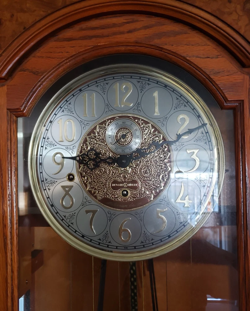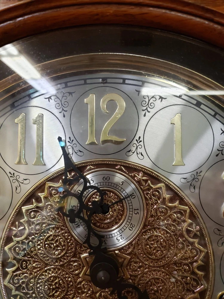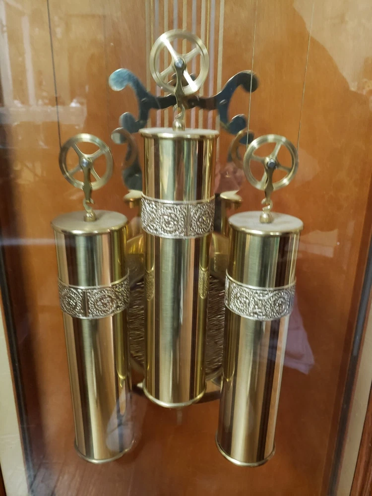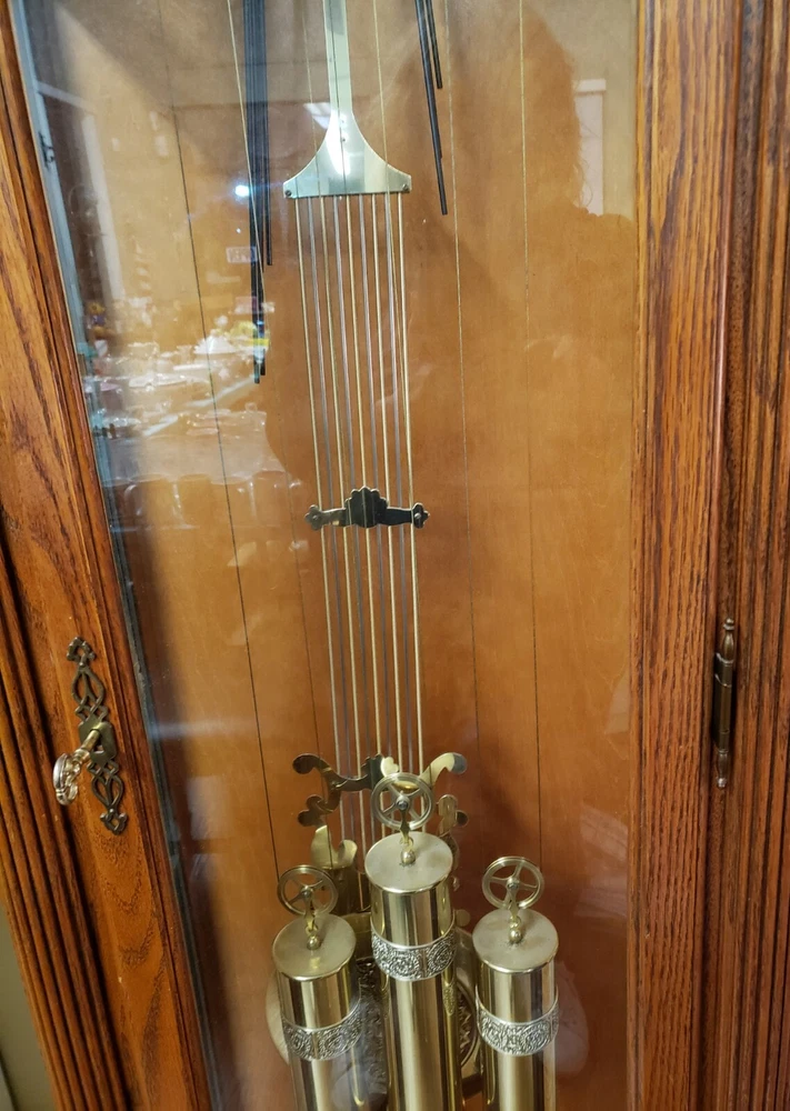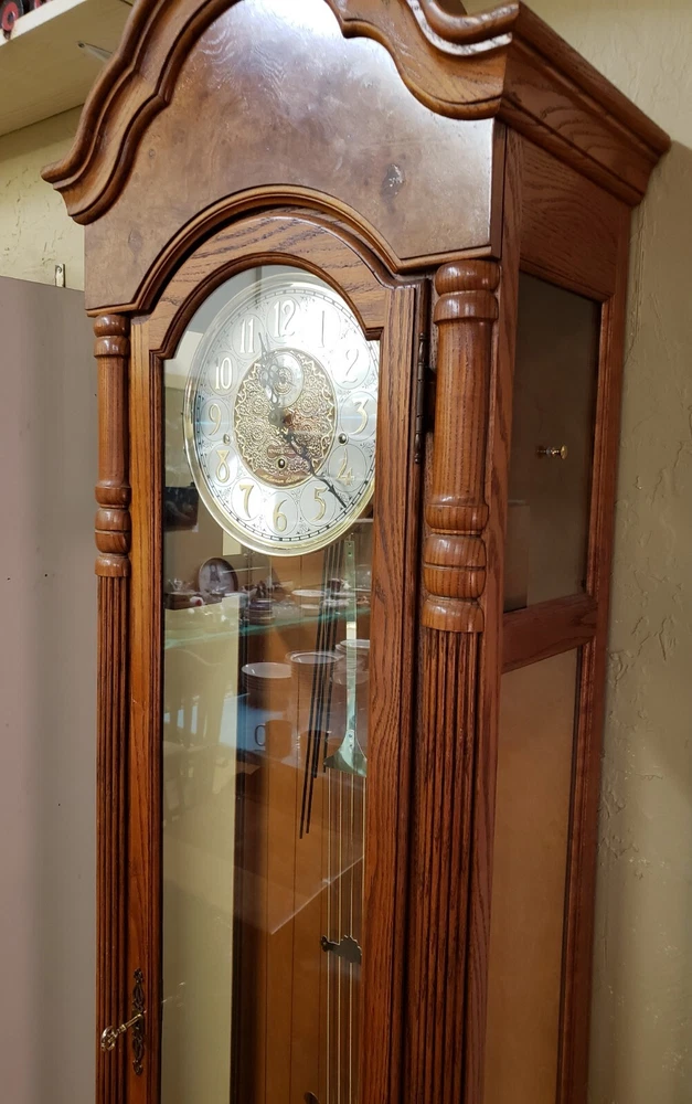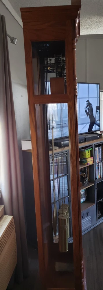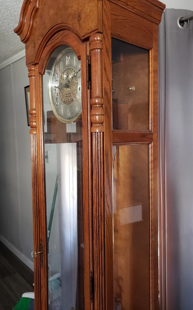This clock is gorgeous and will be a statement piece in your home. It is 22" wide at its widest part, and 77 inches tall. The case is a warm rich oak with burl at the top adding excellent detail and style. Gold tone weights with tasteful design swing to keep pace on the time, with a pendulum of silver/gold accent. The face design is silver and gold tone, with a rotating second hand within the large face. Keeps perfect time, and announces each hour with lovely toned chimes. The original instruction manual is included. I am estimating $150 to ship the clock, however I have no idea how much until someone purchases it and we calculate how it is shipping and to what location. Ebay will calculate however before shipping we would check locally at UPS etc. The amount is only an estimate and I cannot guarantee it will ship for that amount. If it is more, I will inform you so that you can forward the additional costs. I will search out the most affordable but safe method to transport. OUR PREFERENCE IS you can arrange the shipping and we can work out the details. Local pick up is ideal. We have reduced the price this week, starting out at 1795.00 on the original listing I am downsizing and need to find a home for lots of clothes, handbags, shoes, electronics, collectables, pet products and other assorted things. Please see my other listings and keep watching as I will be continuing to list items. Item comes from a smoke free home. We accept PayPal, and ship nearly every day. Payment is due within 3 days of close of auction. If you have any questions contact me so that I can answer anything that will make your purchase a better one for you. Happy Shopping! Please take a look at our many quality listings. Any extra charges for shipping due to location are to be paid for by the buyer. I will combine shipping for cost savings on multiple purchases. If for an approved reason the item needs to be returned, buyer pays return shipping. I usually quote priority shipping, however if you want me to check other options, I am happy to do so.