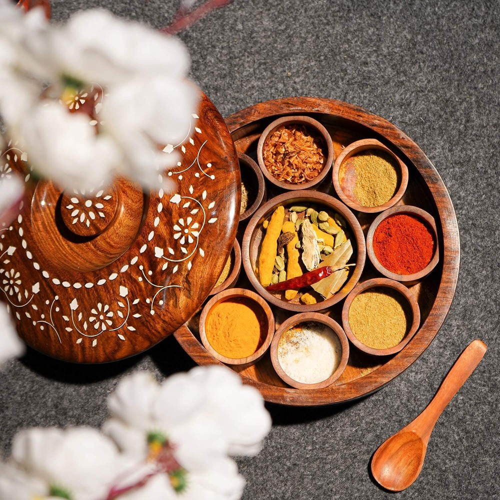 SUPER STRONG AND STURDY BUILT - You will receive a highly durable wooden masala spice box which doesn't break apart easily as we have double nailed each joint for your daily rough & tough usage. MATERIAL AND DESIGN - This sheesham wooden box with 9 sections and a spoon is great to store Indian spices This multipurpose utility box can also be used to store and serve refreshners, dry fruits and keep your knick knacks like jewellery, small items at one place EASY TO USE SPICE BOX - The natural brown color of this multipurpose box enhances it's look and has 9 individually separated compartments. The containers can be used separately to store spices and other uses like for storing dry fruits, keep jewelry, serve fresheners and keep your Nick Knacks. FOOD GRADE WOOD MATERIAL - 100 percent food grade, light weight and easy grip hold. Serve your guests, store leftovers, add beauty to your kitchen and dining area with this wooden handcrafted sheesham wood masala dabba.