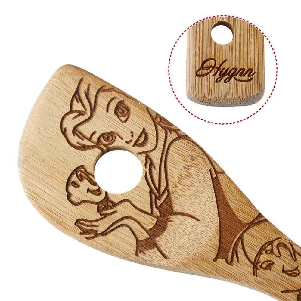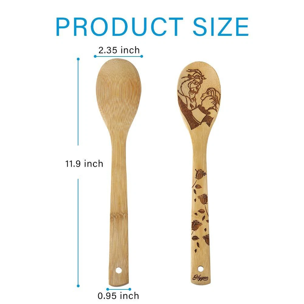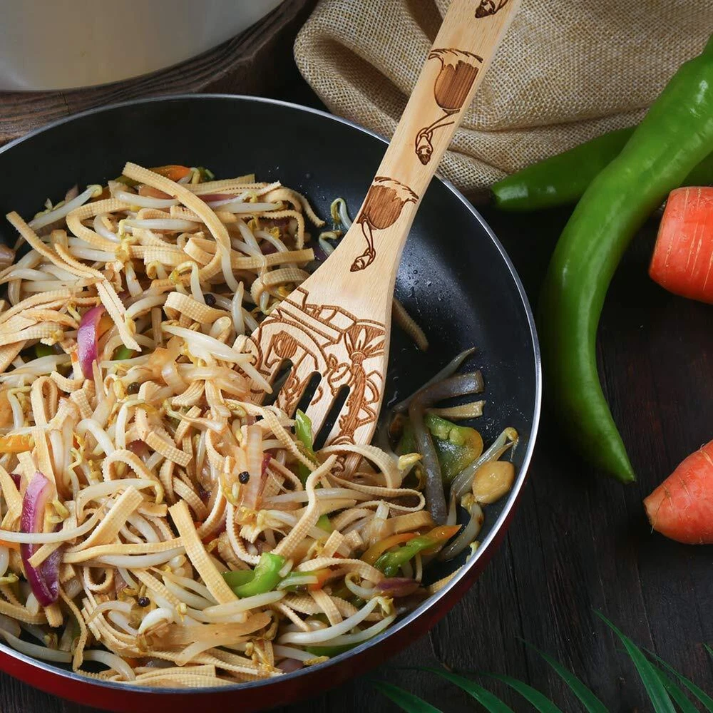 5 Pieces Utensil Sets,Great Gift Product Description Our bamboo cooking utensils don't absorb moisture, they are very hard to stain,they'll generally won't pick up the colors of the food,even like tomato sauces. They are perfect for gifts or you can also gift them as an add-on to a bridal shower. It looks super cute on your kitchen and they’re not just for show,you can actually use them as you any other wooden spoon utensil that you have at home. Take it when you visit your old friend,be present to your parents,it’s best choice for gift when celebration. FSC/FDA Approved, 100% biodegradable and recyclable, Eco-Friendly, Food Grade Natural Lacquer For Added Protection, not color stained, lightweight and comfortable handle for stress free cooking! warm tips: Soak them in olive oil and let them dry for about 2 days before used them. The oil keeps them from staining and absorbing sauces and these will last a lot longer if they are oiled before use. CARE INSTRUCTIONS: This product is not suitable for the dishwasher. To clean, simply wash in warm, soapy water and towel dry. Do not allow bamboo products to soak in water. Never place your wooden utensils in the dishwasher. Package included: 1*solid spoon 1*slotted spoon 1*rounded folk 1*slotted spatula 1*corner spoon GIFT OR DECORATION:Used for your family reunion bake-off,personalized Bake Off spoon.Hostess Gift,House Warming Gift,Mother’s Day Gift,Birthdays,Stocking Stuffers...To anyone who are Kitchen Lovers & Foodies! EASY TO CLEAN AND EASY TO CARE FOR - and safe for non-scratch cookware. Gently hand wash right after use. Do not put in dishwasher VERSATILE USAGE: Add a unique and stylish touch to your home and kitchen with the modern bamboo look, you can use these utensils for high heat sauteing, baking, mixing, flipping, and of course serving your masterpieces literally hundreds of uses in your home and kitchen! Also great for custom art projects for couples! KITCHEN COOKING UTENSILS:Solid spoon,rounded folk,slotted spoon,slotted spatula.Experience artisan-styled craftsmanship with modern rustic appeal when cooking using our kitchen cooking sets. GOOD QUALITY:bamboo utensils are thick, strong and sturdy so it won’t slip out of your hands even stirring the heartiest of meals. The light weight yet superior strength of our bamboo means you don't compromise your recipes with cheap, flimsy cooking alternatives