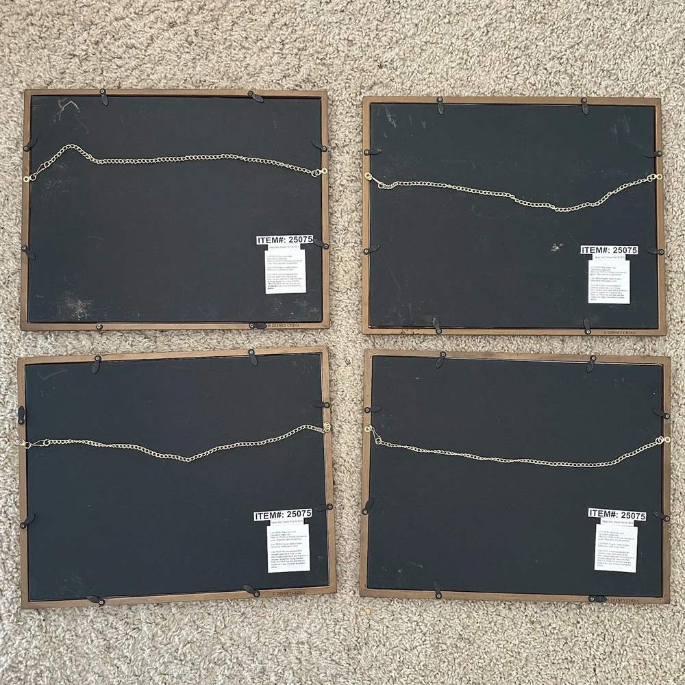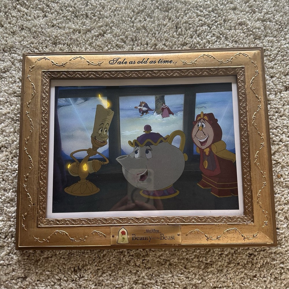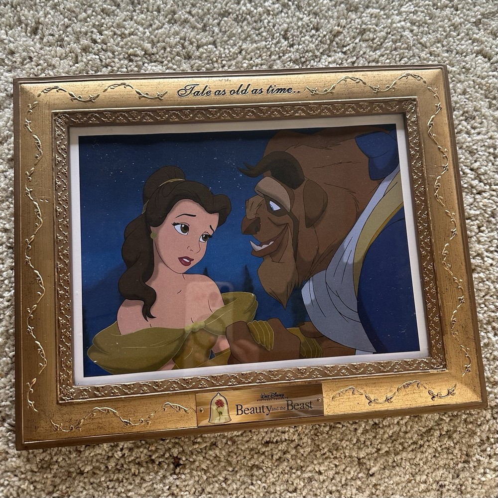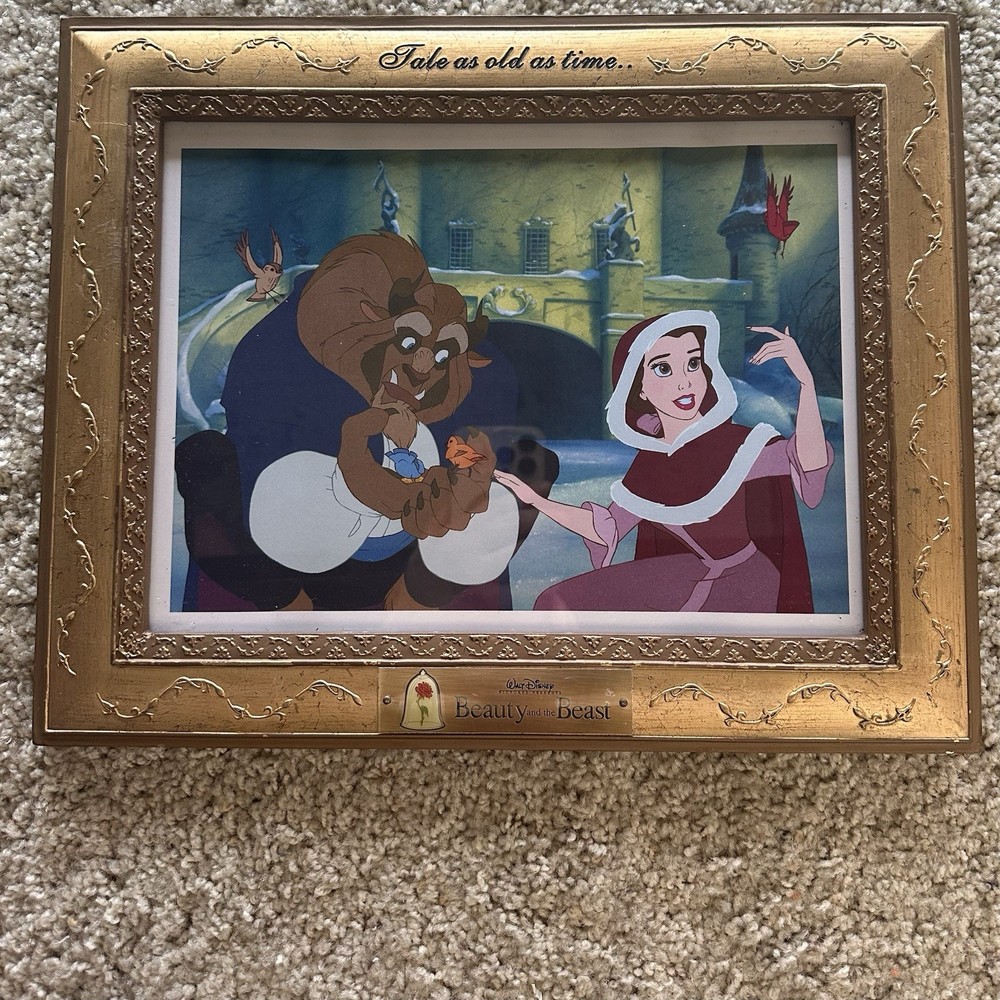 Beauty and the Beast Framed Lithographs Disney Princess Belle Set of 4 Wall Art / Prints Tale As Old As Time each frame measures 11.5" x 14.5" Frames are a nice solid / sturdy gold material with hanging chain solidly attached to back Media Room Art / Nursery Art / 1990s Disney Movie Memorabilia / Classic - smoke free home - packaged with care - offers welcome - i will ship out within 2 business days