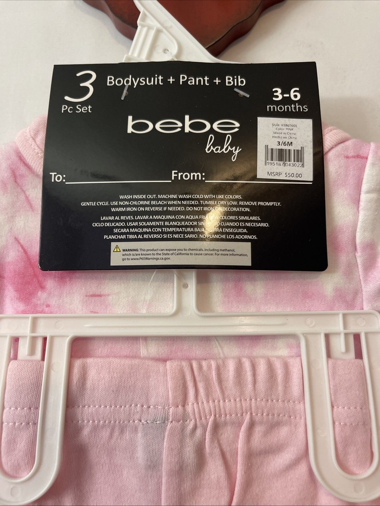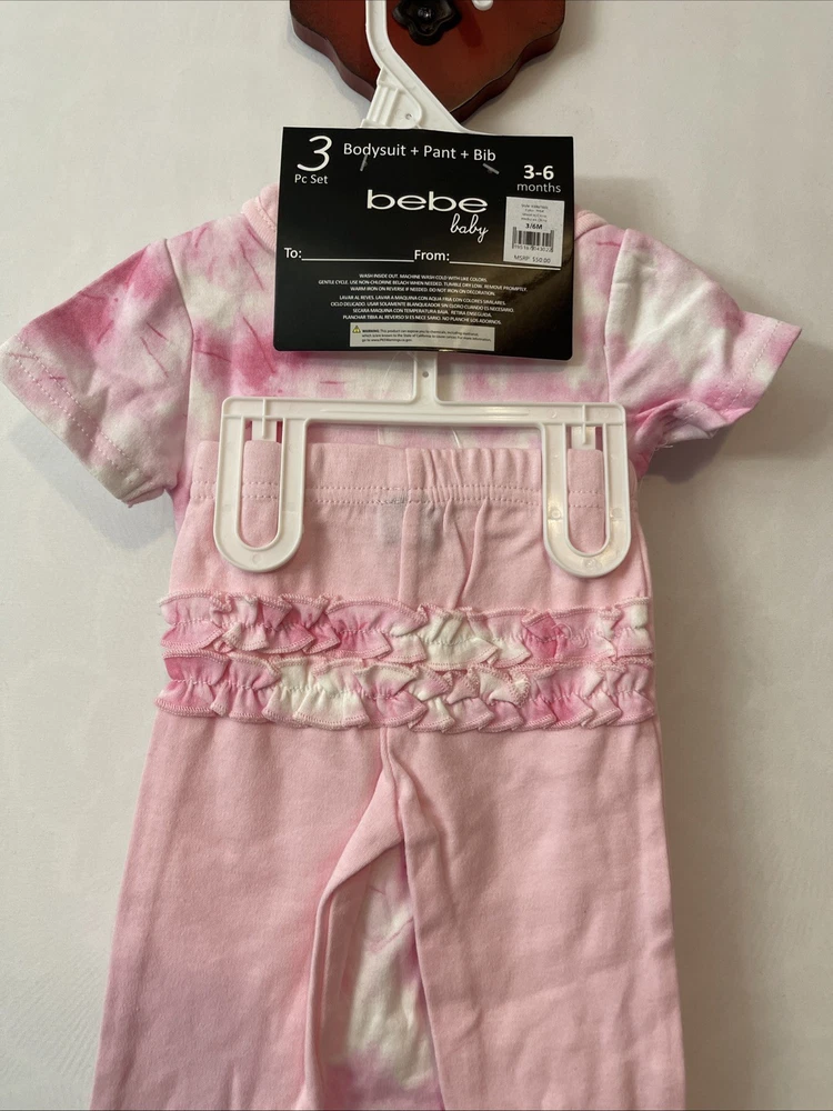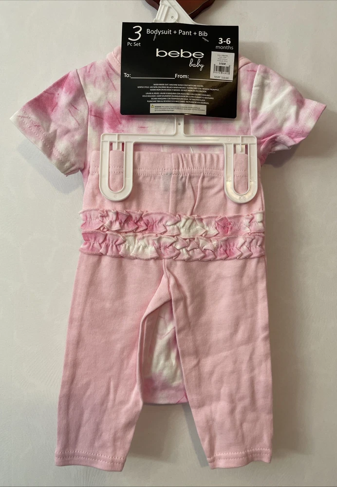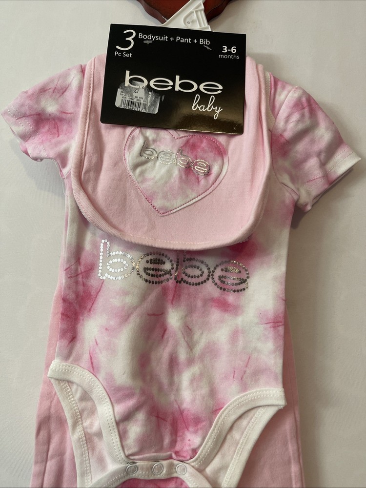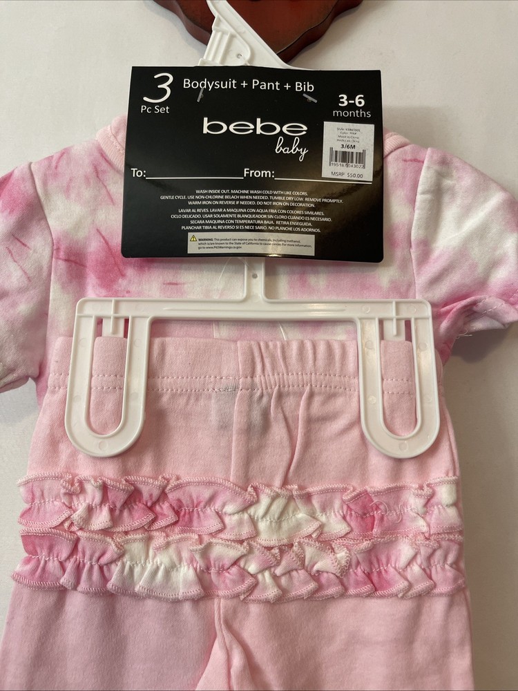 This Bebe Baby Infant Girls 3-6 Months Pink Logo 3-Piece Outfit is a stylish and trendy set perfect for casual occasions. Made from cozy cotton fabric, this outfit includes a pink tie-dye bodysuit with a cute logo accent, accompanying pants, and a bib for convenience. This designer outfit set is ideal for the summer, fall, and spring seasons, making your little one look adorable and comfortable at all times. The brand, bebe, ensures quality and style for your baby girl.