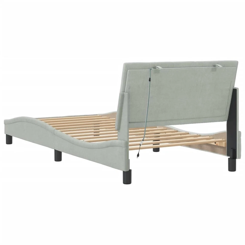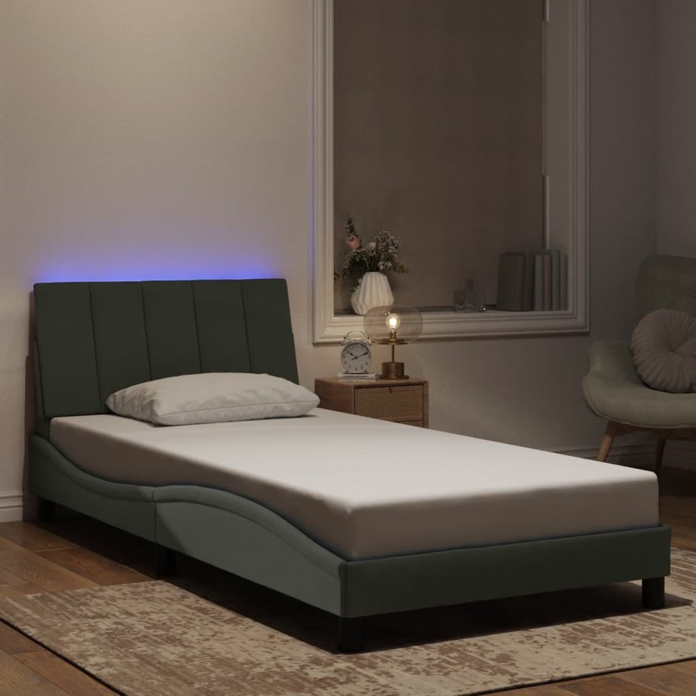 Size: Twin Get a better restful night's sleep from this bed frame with LED lights! It makes a welcoming addition to any bedroom. Soft velvet: Velvet is a soft and comfortable fabric that feels nice against the skin. Plywood slats: The plywood slats provide good weight distribution, ensuring that the mattress stays in place with every twist and turn of your body during sleep. Excellent support: The headboard pillow is stuffed with foam for ultra-soft and optimal comfort, providing you with excellent back support while you're sitting up in bed to read or watch TV. Colorful LED strip: Bring playfulness into darkness with colorful LED lights! The hook and loop fasteners on the back of the headboard cushion can be used to secure the LED lights. Waved side design: The waved look of the bed frame is stylish and sophisticated, adding a modern and elegant touch to your decor, making it the focal point of your bedroom. Good to know: A mattress is not included with this bed. We do offer a various selection of mattresses. You can check our shop for a matching mattress. The product has a USB connector that requires a certified 5V USB power source (not included). Bed frame: Color: Light gray Material: Velvet (100% polyester), metal, solid pine wood, plywood, engineered wood Overall dimensions: 81.9" x 41.3" x 29.3" (L x W x H) Suitable mattress size: 39.4" x 74.8" (W x L) Twin (mattress not included) Headboard cushion: Color: Light gray Material: Velvet (100% polyester) Filling material: Foam Dimensions: 39.4" x 1.2" x 17.7" (L x W x H) LED strip: Length: 21.7" Voltage: DC 5 V USB cable length: 55.1" Power cable length: 11.8" IP rating: IP65 Range name: Hanko Delivery contains: 1 x Bed frame 1 x Headboard cushion 1 x LED strip California Proposition 65