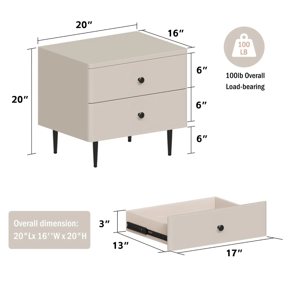 Bedroom Nightstand 2 Drawers Storage Cabinet Living Room Vintage Side Tables Features Modern Design with Great Material: Classic and modern design, the main frame was made of MDF pine wood, and wrapped by medium-soft fiber leather on both sides to prevent getting hurt during accidental collisions in daily life, 4 legs can provide great stability. Storage with Safety: Include 2 drawers to provide good storage, each drawer has a metal handle and silent slides. Installation: Simply and easy installation,only need to install 4 legs Detail: Size:20"x20"x16" Weight:26 lbs Color:Beige Number of drawer:2 Material: Solid wood material+surface leather Package:1 x bedside table nightstand Payment Delivery details Return Contact us About us Payment 1.We accept PayPal,G Pay Credit Card,Visa ,etc. payment. 2. Please make payment within 4 days after placing an order, or eBay will automatically open an unpaid case on the fourth day. 3. You can contact us for sure if you want to cancel the order to avoid the unpaid case. Delivery details Your goods will be shipped within our handling time after your full payment. Pls note that we don't ship to Alaska, Hawaii and Puerto Rico.APO/FPO’s address. Return We accept return within 30 days, but we are not responsible for human damage.The return shipping cost is the buyer's responsibilities and try to keep it in your original package. Contact us If you have any questions please contact us through "Ask seller a question" link. We will respond within 2 business day or less. About us We are committed to providing you with a comfortable home and by functional and beautiful ceiling fans and lighting fixtures. As a professional modern lighiting fixture supplier, our team has more than 15 years Ceiling fan and lighting production experience. We are not only committed to produce high-tech, stylish, safe and high quality LED products, but also provide our professional and efficient after-sales service, making your lighting experience more pleasant and comfortable.