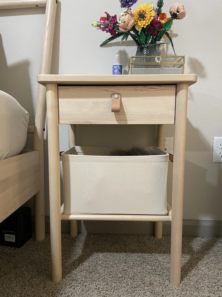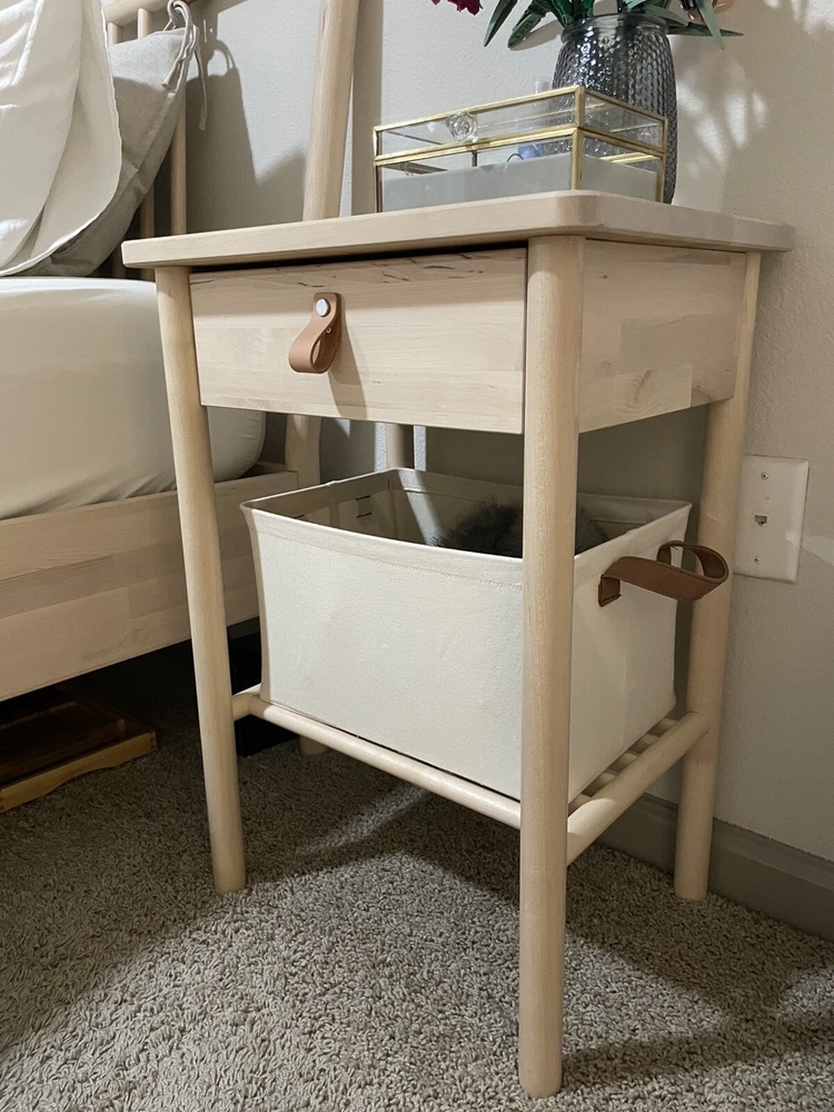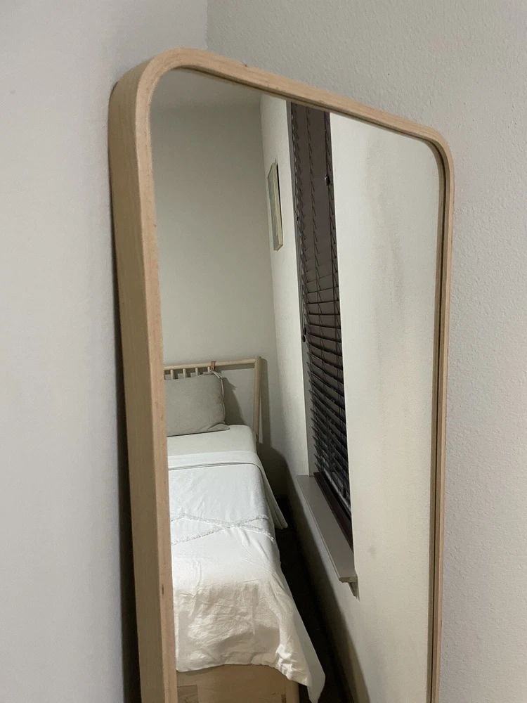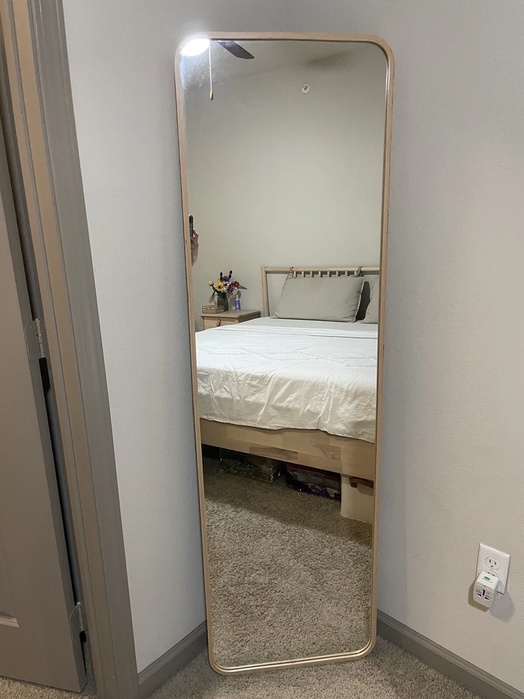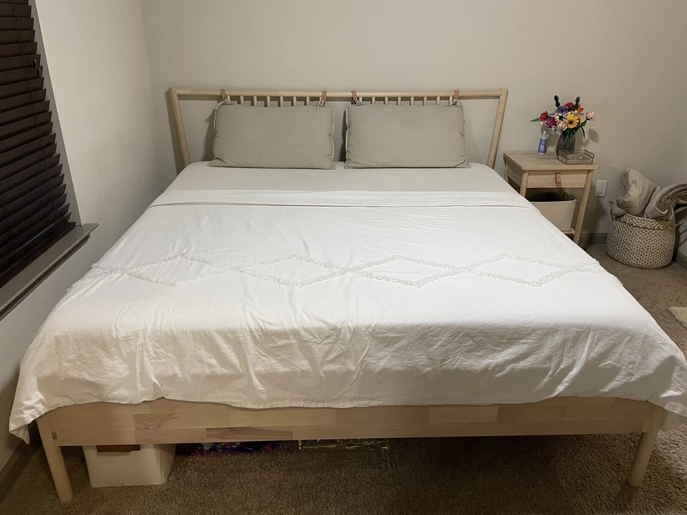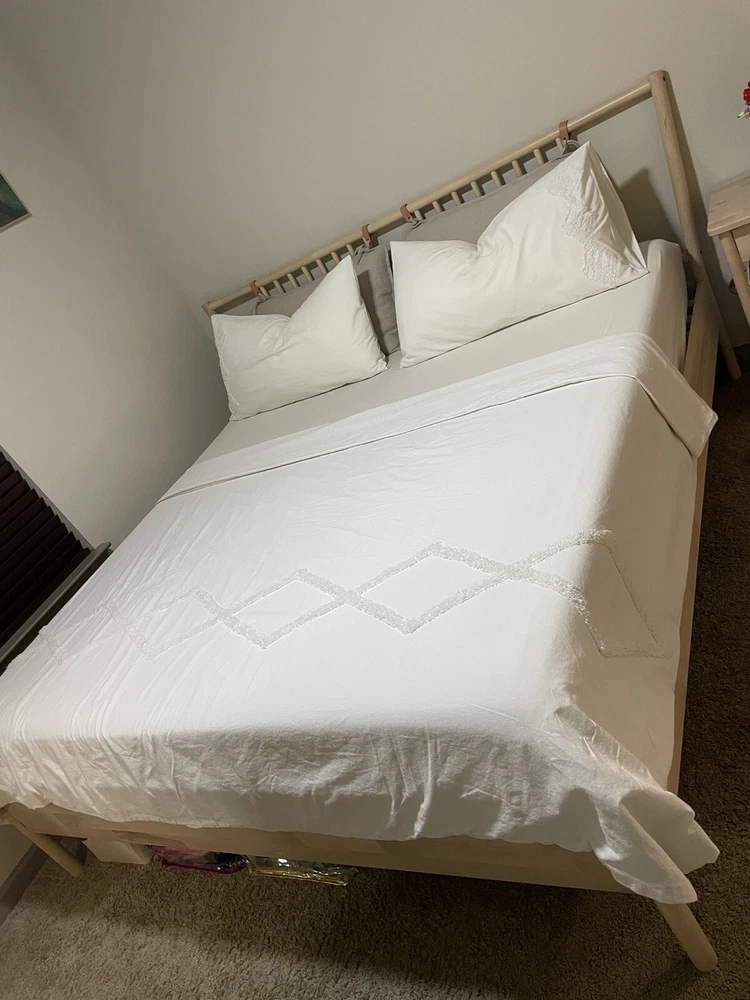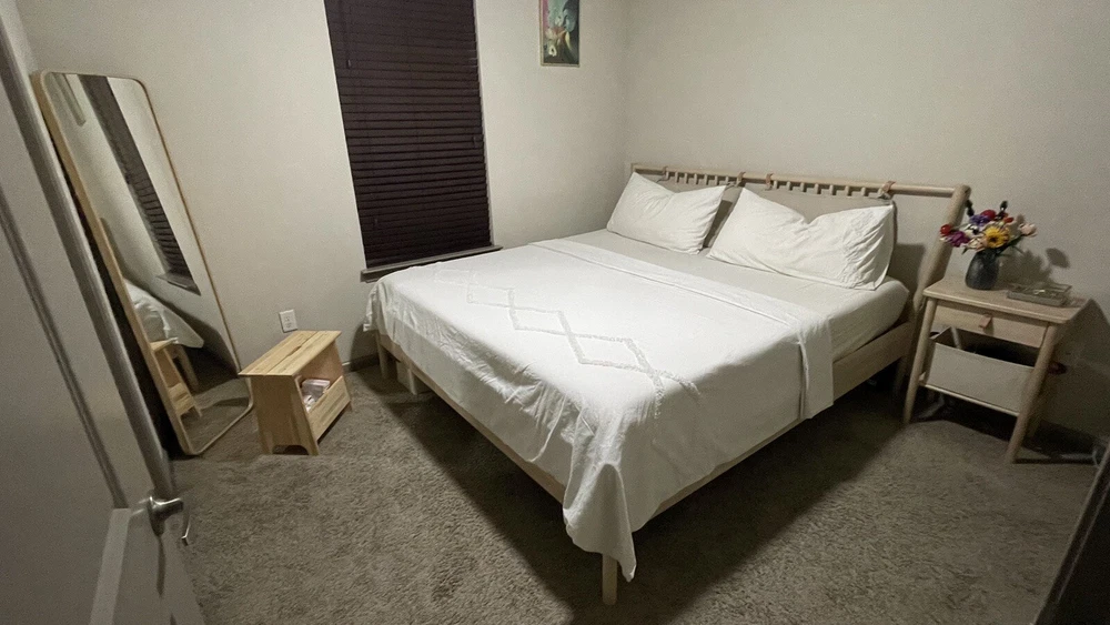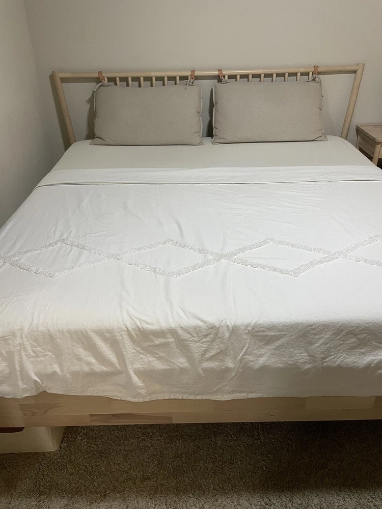 Entire Bedroom Set from IKEA in as good as NEW condition. Set Includes King Size Bed, a Night Stand, Full Height Mirror with stand, a small Stool Table from IKEA, Mattress from Purple and Pillows as shown in the photo.