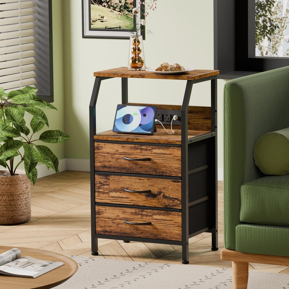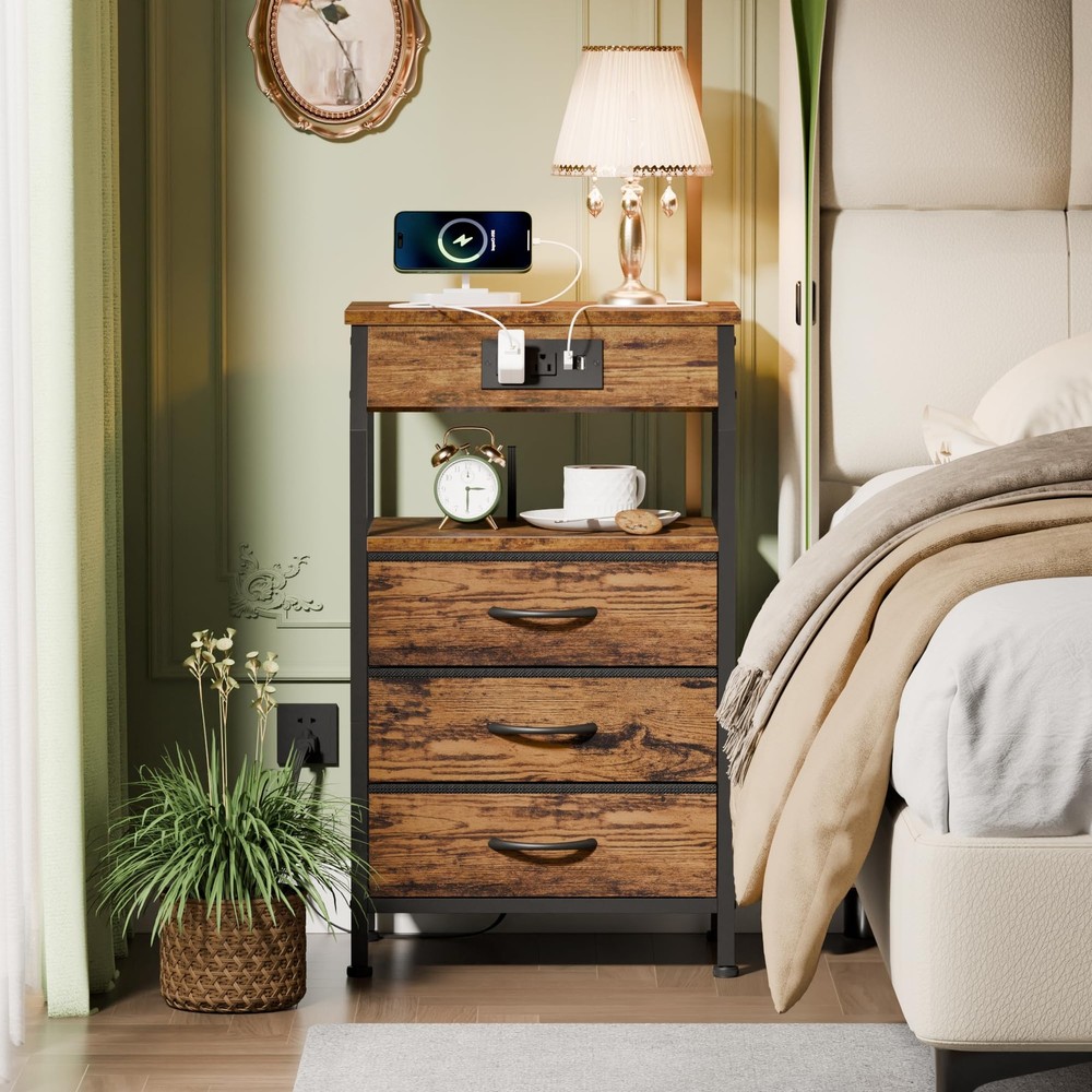 Night Stand with Charging Station, USB Ports and Outlets, 28.3 Inch Tall Bedside Table with Wood Shelf, 3 Fabric Drawers Side Table for Bedroom, 3 Ways to Use, Rustic Brown 【3 WAYS TO USE】We have pre-drilled holes on both the front and back of the corresponding positions of the metal frame. You can install the charging station on the front, back or not according to your needs. 3 ways to use, unique DIY design, give you more choices and better use experience. 【UPGRADE CHARGING STATION】Equipped with 2 USB ports and 2 AC outlets, this nightstand allows you to effortlessly charge your phones, iPads, speaker box, lamps or other devices in your bedroom or living room. 【MULTIPLE USE OCCASIONS】The sleek outlook design makes this side table easily immerse into any home room. You can put it in your bedroom as a nightstand, in the living room as a side table, in the study to stationery, in the playroom to toys, and by the shoe bench for socks and other items. 【STURDY AND SAFE】Crafted with metal frame and particle board, this nightstand dresser ensures durability and longevity. 4 adjustable feet ensure stability on uneven ground. Anti-toppling device is provided to prevent it from falling down and aimed at providing stability and preventing shaking. This reflects our emphasis on safety. 【FABRIC DRAWER & OPEN SHELF】The fabric drawers offer capacious space for socks, underwear, makeup products, craft storage, and more. Foldable drawer, lightweight and durable, and won't pinch hands, also safe for family members to use. 2-tier open shelf with wood top provides hard surface is ideal for desk lamp, mobile , books, tote etc. 【EASY TO ASSEMBLE】The storage drawer unit easy to assemble with tools included in the package, you can refer to the Installation instructions. Perfect gift with functional and decorative characters. Our perfect after-sales service will solve all customer problems for you within 24 hours. In addition to the charging station, this nightstand also offers three fabric drawers, providing plenty of storage space for your personal belongings. Use these drawers to clothing items, accessories, or even extra bedding. The fabric material adds a touch of elegance and softness to the overall design, while ensuring easy access to your stored items. What sets this nightstand apart from others is its versatility. It can be used in three different ways - as a traditional bedside table, a side table in your living room or office, or as a small storage unit in your closet. This makes it a practical choice for those who are looking for a multifunctional piece of furniture that can adapt to various needs and spaces. The nightstand adds a warm and inviting feel to any room decor. It effortlessly blends in with both modern and traditional interior styles, making it a great addition to any home. Overall, the Night Stand with Charging Station is a stylish and practical choice for anyone in need of a compact yet functional bedside table. With its wood shelf, charging capabilities, fabric drawers, and multiple usage options, this nightstand offers convenience, organization, and style all in one. Shipping We offer FREE shipping on all orders! We ship within Three business days of payment, usually sooner. We use a selection of shipping services such as UPS, FedEx, USPS etc. We only ship to the lower 48 states, no APO/FPO addresses or PO Boxes allowed. Local pickups and combined shipping options are not provided at this time. Return You can return a product for up to 30 days from the date you purchased it. Any product you return must be in the same condition you received it and in the original packaging. Please keep the receipt. Payment We accept payment by any of the following methods: PayPal Please pay as soon as possible after winning an auction, as that will allow us to post your item to you sooner! Feedback Customer satisfaction is very important to us. If you have any problem with your order, please contact us and we will do our best to make you satisfied. Contact Us If you have any queries, please contact us via ebay. We usually respond within 24 hours on weekdays. Please visit our eBay store to check out other items for sale! Thank you for shopping at our store.
