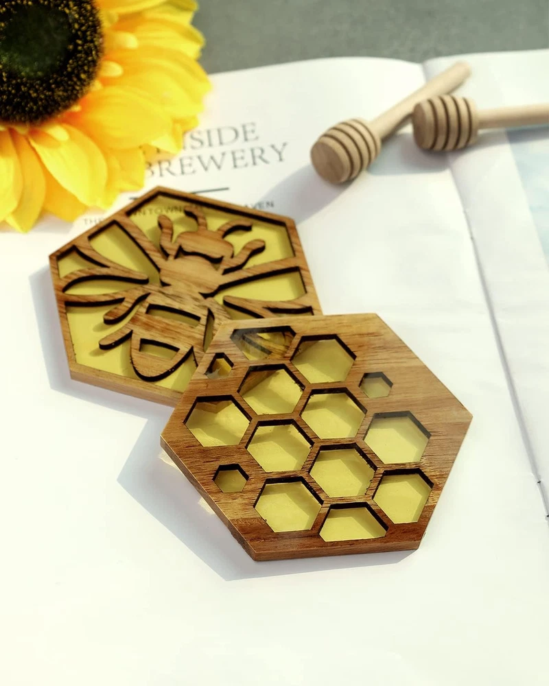 Bee Resin Wood Coaster Set of 6 Honeycomb Wooden Epoxy Resin Drink Coasters for Cold Drinks Wine Glasses Beverage Mugs Bee Themed Cup Mats for Kitchen Dining Coffe Table Gift for Her/Him Unique Honeycomb Bee Coaster - You will receive 6pcs bee resin wood hexagonal coasters in 6 different styles. Design with a honeycomb and bee engraved pattern cut into the wood and filled with yellow resin giving a fantastic look to the coasters. Resin-filled Handicrafts - Each piece is laser cut and filled with colored epoxy resin that resembles real honey. Resin-filled coasters will take several additional days to fully cure. Then we manually polish and seal each coaster, striving to make a quality cup mat that will please you. Handmade with Care - Made of quality acacia wood. Due to every piece of solid wood having its own unique grain and tone, it is possible your coasters may look slightly different from the one shown. As each piece is handmade and filled, there are a few bubbles and dyeing. Keep Your Tabletop Clean - Each coaster is about 3.9" wide by 3.3" tall with 0.6" thickness. They are sturdy, durable, and cold/heat-resistant enough for any table surface. Enjoy your favorite drink while keeping the table dry and free of spills. Bee Kitchen Gifts - Perfect gift idea for any occasion such as Housewarming, Wedding, Graduation, Birthday, Mother's Day, Father's Day, or Christmas. Cut with the honeycomb or honeybee shape to allow light to pass through the resin, creating some amazing results. Product Description Item Thickness 6 Millimeters Number of Items 6 Color Yellow Material vinyl, fabric, glass, wood, Resin Is Dishwasher Safe No Item Weight 11.3 ounces Shape Hexagonal Product Dimensions 3.9"L x 3.9"W Product Care Instructions Hand Wash Only 3.9 "w x 3.9 "w. Weight: 11.3 oz Shipping from the USA All of our products are shipped from the USA, ensuring quick delivery to your destination. Payment We offer the following payment methods: PayPal, credit card, bank transfer, and eBay's secure payment system. Free Shipping & Free Returns Shipping within the USA is FREE. Additionally, any return is absolutely free for you. Risk-Free Purchase You have the option to return an item within 30 days without any justification. We cover the return shipping costs! Fast Shipping We ship immediately upon receipt of payment. Generally, the package is delivered within 2-3 days in the USA. If it takes longer, we will contact you. Quality and Costs Made in Europe, USA, China No customs fees or additional charges Total satisfaction guarantee Invoice with declared VAT available upon request in .pdf format Feedback Your feedback is very important to us. After you pay for your purchase, you will automatically receive positive feedback from us.