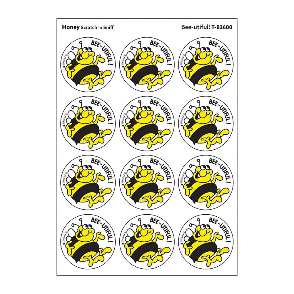Get a whiff of this Bee-utiful!, honey-scented sticker! Scratch 'n Sniff Stinky Stickers from the '80s are BACK! Fun to collect, trade, and celebrate accomplishments and special occasions. Collectors will be happy to spot the star symbol to distinguish Stinky Stickers from those printed in the 1980s. Each pack includes 24 stickers on 2 sheets. Sold as 6 packs for a total of 244 stickers. Scratching the surface releases nostalgic aromas loved by and kidults of all ages. Art projects, costumes, invitations, letters, party favors, and postcards get extra-sensory appeal! Stickers are easy to peel from their backer sheet. They're acid-free, nontoxic, and photo-safe. Measures 1-1/4" diameter. Ages 3 and up. Made in the USA. 2 sheets/24 stickers per pack, sold as 6 packs, 144 stickers total