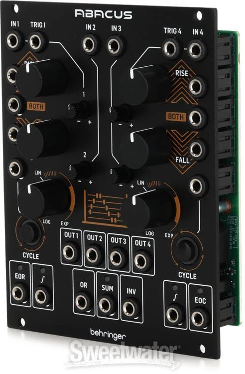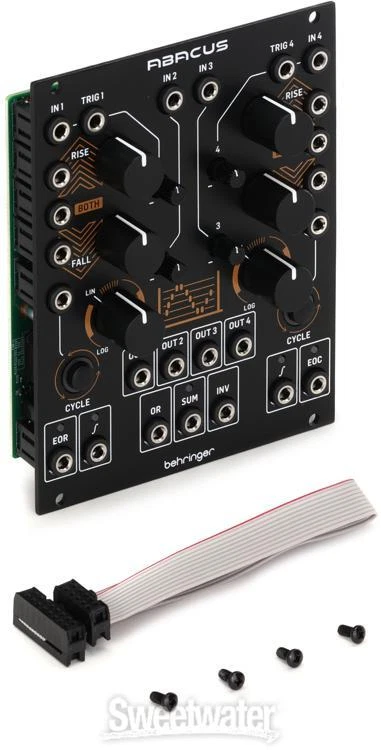 Equip Your Eurorack with Complex, Computational Functionality The Behringer Abacus Eurorack module is exactly what it sounds like: a mathematical analog processor designed to create unique, algebraic functions. Inspired by familiar, renowned models of the 1960s, the Abacus’ interface is jam-packed with linear, logarithmic, and exponential triggered or continuous function possibilities. Four CV inputs with modulation depth and direction control expand the limits of envelope creativity, allowing you to amplify, integrate, or invert multiple functions for complex lag, slew, or portamento effects. Similarly, generated LFO signals onboard the Abacus can reach 25 minutes in length with speeds up to 1kHz for a wide range of modulation choices — this includes the possibility of backward modulation and tempo manipulation within your system! Topped off with its standard 20HP build and included hardware, it’s no wonder so many Sweetwater synth fanatics have chosen to integrate an Abacus module into their Eurorack setup.Behringer Sweetwater is an Authorized Behringer Dealer Genuine New Item Sweetwater's 2-year warranty Behringer Abacus Music Computer Eurorack Module 20HP Eurorack Function Generator Module with 4 CV Inputs, LED Activity Indicators, and Envelope and LFO Functionality Equip Your Eurorack with Complex, Computational Functionality The Behringer Abacus Eurorack module is exactly what it sounds like: a mathematical analog processor designed to create unique, algebraic functions. Inspired by familiar, renowned models of the 1960s, the Abacus’ interface is jam-packed with linear, logarithmic, and exponential triggered or continuous function possibilities. Four CV inputs with modulation depth and direction control expand the limits of envelope creativity, allowing you to amplify, integrate, or invert multiple functions for complex lag, slew, or portamento effects. Similarly, generated LFO signals onboard the Abacus can reach 25 minutes in length with speeds up to 1kHz for a wide range of modulation choices — this includes the possibility of backward modulation and tempo manipulation within your system! Topped off with its standard 20HP build and included hardware, it’s no wonder so many Sweetwater synth fanatics have chosen to integrate an Abacus module into their Eurorack setup. Behringer Abacus Eurorack Module Features: 20HP mathematical sound processor inspired by popular models of the 1960s Easily amplify, integrate, or invert pre-existing audio signals for simple and expansive sound creations Create and manipulate a wide variety of linear, logarithmic, or exponential triggered/continuous functions Combine up to 4 CV inputs for expansive envelope creativity LFO signals are capable of reaching up to 25 minutes with rates as fast as 1kHz Control modulation depth and direction for a personalized sound character Note division and flam capabilities Fits seamlessly into most standard-size Eurorack setups LED activity indicators help you keep a close eye on module performance Specification Detail Type Function Generator Module Analog/Digital Analog Controls Rise, Fall, Response, Attenuverter, Cycled Analog Inputs 4 x CV, 4 x Trig, Rise (1, 4), Fall (1, 4) Analog Outputs 1 x 1/8", 4 x CV, Other I/O OR, SUM, INV f (1,4), 1 EOR, 4EOC Depth 0.94" (2.4mm) HP Size 20HP Power Usage +12V/60mA, -12V/50mA Power Supply Requires Eurorack case and power supply Weight 6.74 oz (191g) RETURN INFORMATION We want you to be completely happy with your purchase from Sweetwater. If you are not satisfied with your product, you may return it for a refund of the purchase price within 30 days. If your purchase was eligible for Free Shipping, the shipping cost will be deducted from your credit or refund. Returns must be in the complete and original packaging with all accessories and complete documentation (Owner's Manual, warranty card, quick start guides, etc.), show no signs of wear or use, and include a Return Authorization number or be subject to a restocking fee.