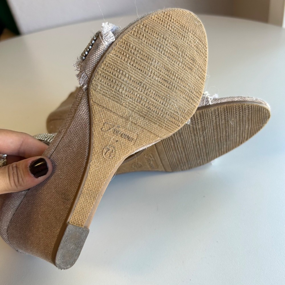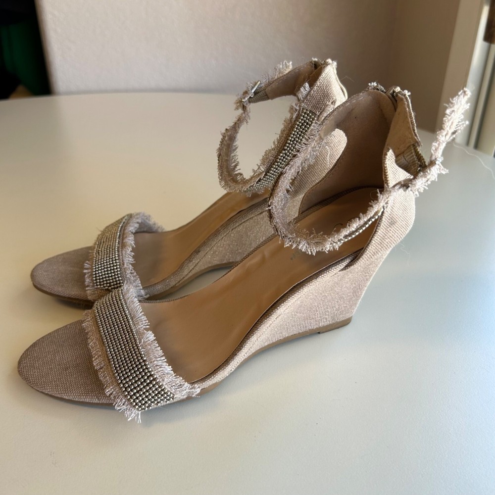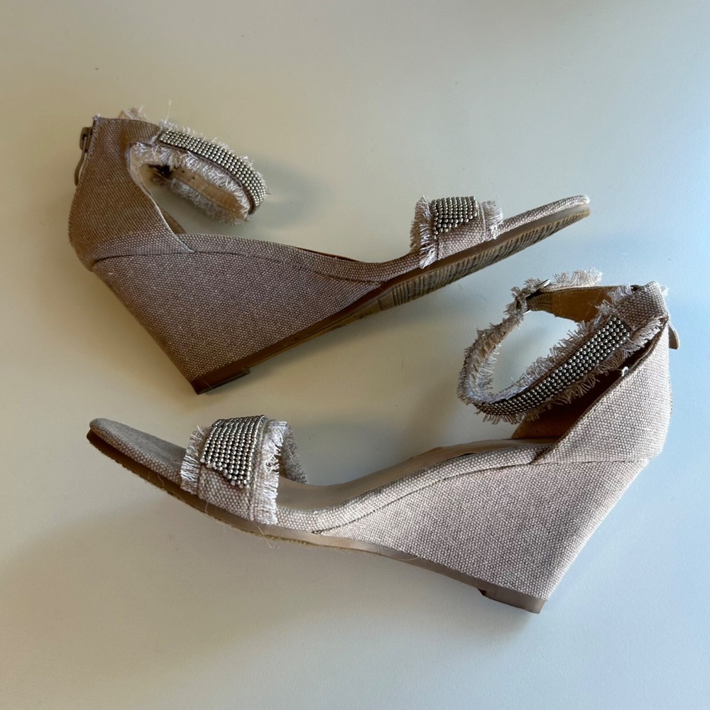 These sandals are a dream—comfy yet stylish with the perfect wedge height. The rhinestone strap adds a touch of glam, while the frayed details give them a trendy, boho vibe. The ankle strap keeps them secure, and the zipper makes them easy to slip on. Love how they dress up jeans or a summer dress! Great pre-owned condition, too.