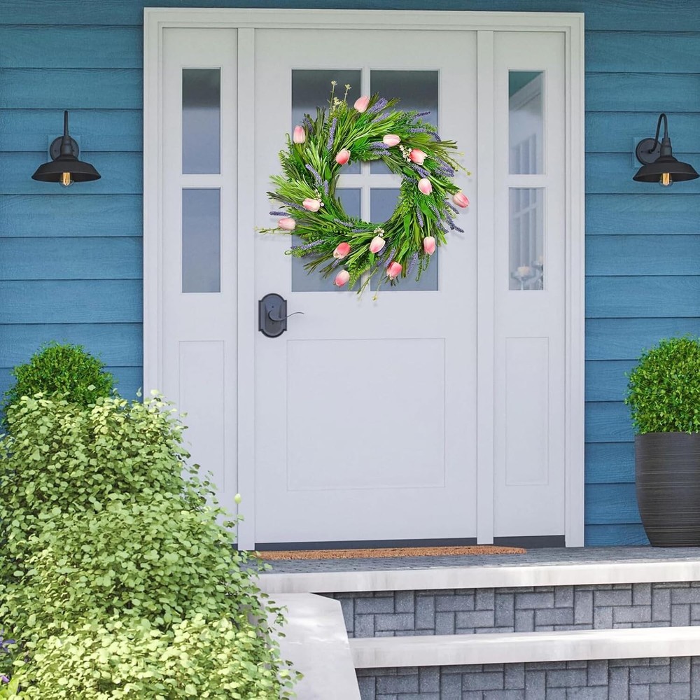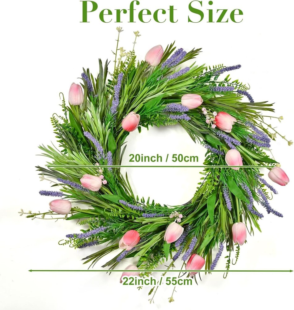 Beinhome 22 Inch Spring Floral Wreath with Pink Tulips & Lavender - Front Door Decor for Valentine's Day, Summer Wedding, Indoor Outdoor Artificial Arrangement with Green Leaves 【Wonderful Handmade Tulips and Lavender Decor】This Spring wreath showcases a stunning array of artificial tulips and are delicately adorned with realistic lavender.Carefully hand-tied to a sturdy rattan wreath frame to ensure durability and lasting beauty. 【Perfect Size for Versatility】The Spring wreath is 22 inch in diameter, a unique, beautiful and elegant size that adds a touch of beauty whether it is placed on a front door, fence, window or table. 【Giftable & Ideal for All Seasons】Our Spring Summer wreath is bright in color, perfect gift for a birthday, anniversary, wedding, Valentines Day, Easter, Mother’s Day, Father’s Day or housewarming Christmas, Thanksgiving, and all other holidays. 【Versatile Usage】: These Spring wreath adroned with Tulips and Lavender can be applied to decorate homes, family gatherings, birthdays, wedding or other occasions, and can be placed on living rooms, bedrooms,offices, desks, windowsills wall or other places to create a warm and loving environment. 【Long-Lasting Decor】Spring Wreath not just for spring but for all seasons home decor.Sophisticated color matching wreath not both on flowers and the leaves makes this spring wreath not just for spring but for summer, fall season.And the color trend design for most types home designes.