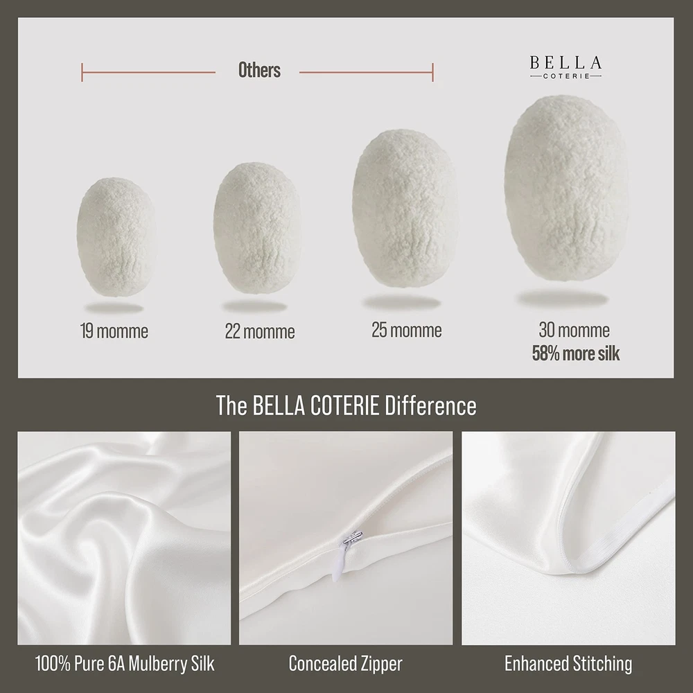 FAREWELL FACIAL CREASES-Your skin will glide effortlessly across the ultratight 30 momme weave of our luxurious silk pillowcase, fighting wrinkles while you sleep. DITCH THE DRY SKIN-Skip cotton or satin covers that steal moisture. Our superiorly soft silk pillowcase helps you retain moisture for the secret to glamorous, glowing skin. BYE BYE BREAKOUTS-Fight acne while you snooze with the natural amino acids found in pure mulberry silk. Our ultra soft pillowcases, made of natural fibers, won't irritate skin or clog pores. Hello beauty sleep! NO MORE KNOTTING-Sleek hair starts with your sleep! Proteins in 100% organic silk threads keep your hair moisturized, while the super smooth finish prevents knotting and breakage for effortlessly luscious locks. THE BC GUARANTEE-Here at BELLA COTERIE we're on a mission to level up your beauty sleep. Treat yourself to our silk pillowcases risk-free for 30 days with our 100% customer satisfaction guarantee. Once you sleep in the lap of luxury, you'll never go back!