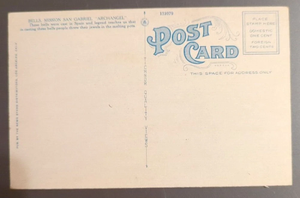 VTG Souvenir Postcard Bells of Mission San Gabriel "Archangel" California. There may be wear on the edges or a bent or torn corner, staining or writing on the card, creasing, or the card may have a cancellation mark. Most of the postcards I sell are 50 to 100+ years old and will never be perfect. Please examine the photos carefully for condition information. All postcards with a value of less than $20 are shipped via eBay Standard Envelope with a 2 mm postcard sleeve and a piece of cardstock on either side, taped closed with masking tape and placed in a heavy cardboard mailer. Postcards with a value of more than $20 are sent Ground Advantage in a 2 mm postcard sleeve, sandwiched between cardboard and shipped in a padded polybag. Both methods are provided with tracking.