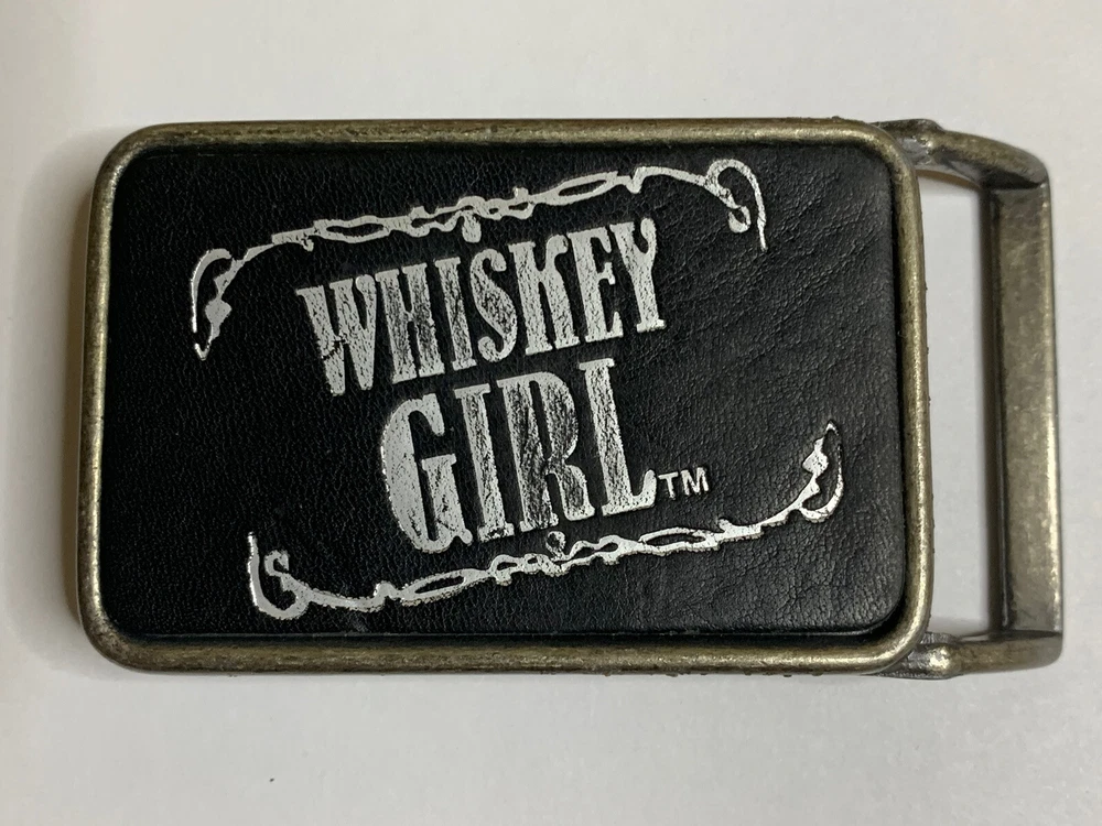 Vintage Whiskey Girl Belt Buckle Black Leather & Silver Buckle Western 2”x3.5”. Made in Canada