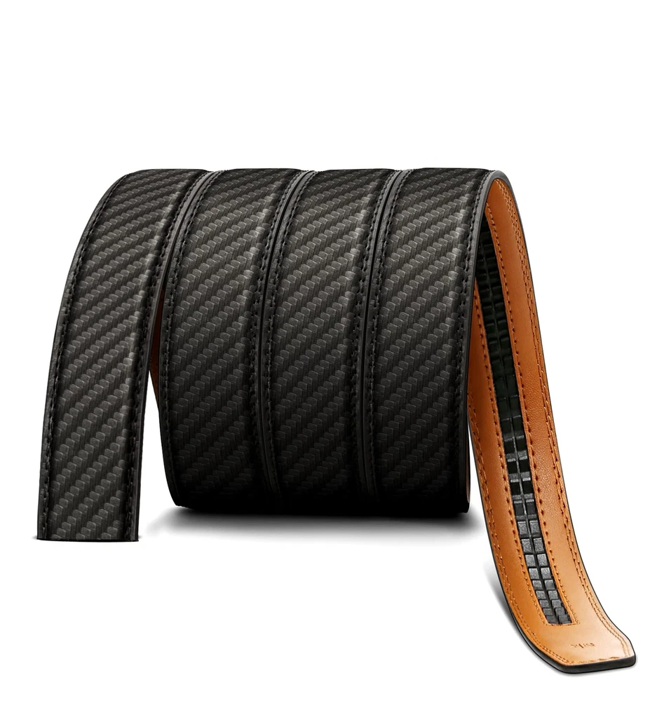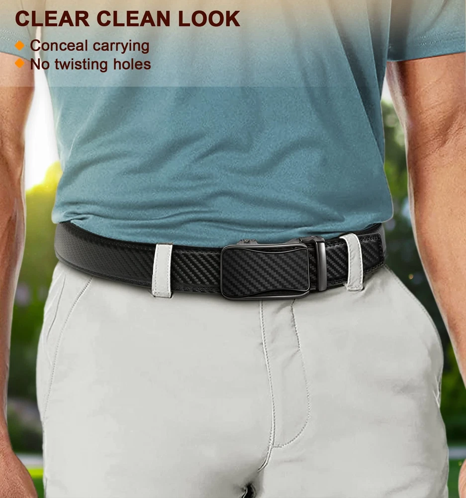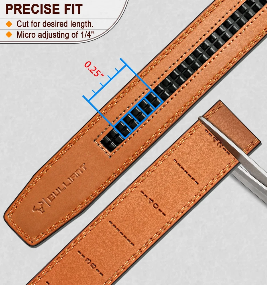 For ratchet belt width 1 3/8; CUT FOR FIT--One Size with waist range 28"-52" by cut for fit,there are size marks in the back of strap for your desired size,easy to cut and never wrong size; MATERIAL--Two layers spilit leather without any mid-refiiling,reiforced flat edge with solid stitching makes it strong. It enable a pulling force up to 60Pounds for daiy use by fat guys; USER FRIENDLY--Feeling soft and friendly in hand,warm but firm delicated coating will always hold your pant on and keep it clean; STYLISH--Multi colors for selection,easy matching for dress,casual or jeans.