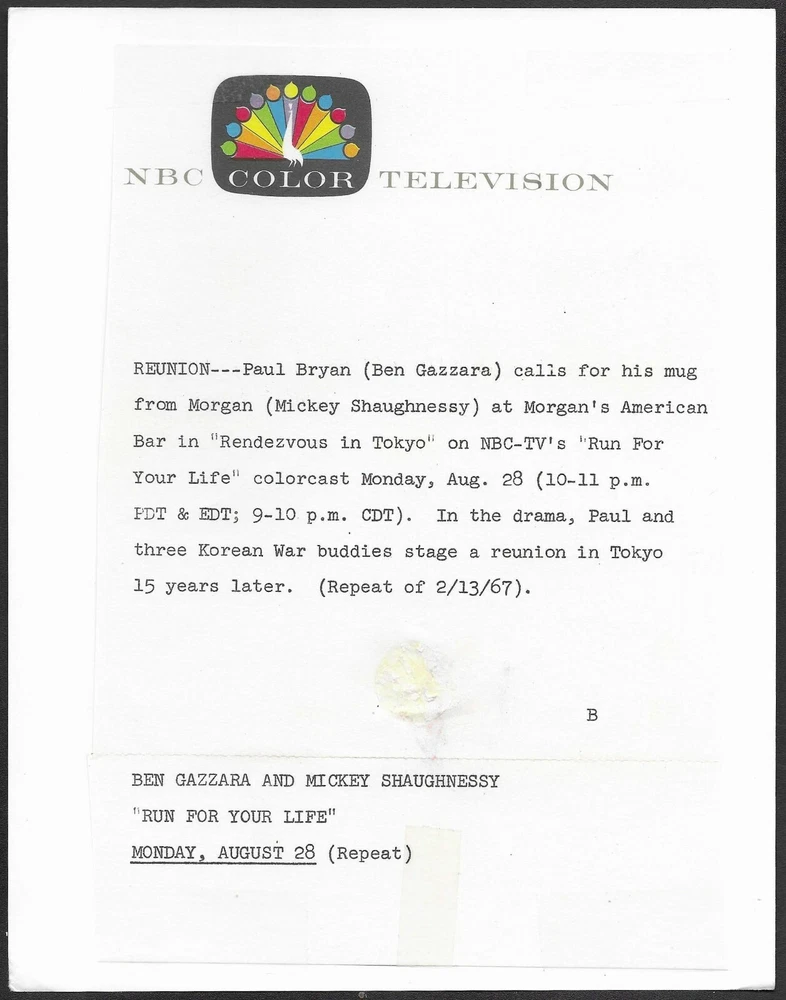 ~ Ben Gazzara Run For Your Life Original 1970s NBC TV Promo Photo 82989 Item Original TV Promo Photo Featured Ben Gazzara ~ Mickey Shaughnessy Title Run For Your Life Issued by NBC Year Printed/Issued 1967 Photo Stock glossy Size 7x9 (inches) Condition excellent ~ the dark spot at the bottom right corner is not a photo flaw, but part of the image ~ Please use the "zoom" feature to see the condition of the photo in minute detail. The photo shown is the exact photo you will receive. Many of the photos offered by Starlight were actually used for theater display or publication, giving them added value, significance and validity. Notes ~ original slightly trimmed NBC logo caption sheet on back of photo Guarantee This is the real thing--a rare, original promotional photo/still. "Original" means this is the actual item that was printed in the year cited above and distributed by a movie studio, television network or agency to theaters and/or the media for promotion. It is not a reprint. Most of our photos are so rare that you may rarely if ever see them on eBay again. Promo photos are limited editions as only a small number were printed to promote the artist or production. To be truly collectible a photo must be an original. When you buy from us you can be assured that you are buying a genuine, professionally authenticated, original still photo. We have over 30 years of experience authenticating entertainment memorabilia and review each item to make sure it is an original. In addition to their value as collectibles and investments, original photos make unique gifts which can be tailored to a specific interest. They also make great wall décor for your home, office or media room. Photos are guaranteed authentic for the life of the photo. As collectors ourselves we understand the importance of receiving an item promptly, in the condition stated and securely packaged. We stand behind our products and service 100%, and offer an unconditional money-back return policy on our items. We combine shipping on items purchased within a 14-day period. Please check our other auction and store items. Thanks for your business and come back often. Own a Rare Piece of Hollywood History! Original Vintage Movie, Music and TV Memorabilia Authenticity Guaranteed for the Life of the Item We Combine Shipping Please Check Our Auctions and Store Items