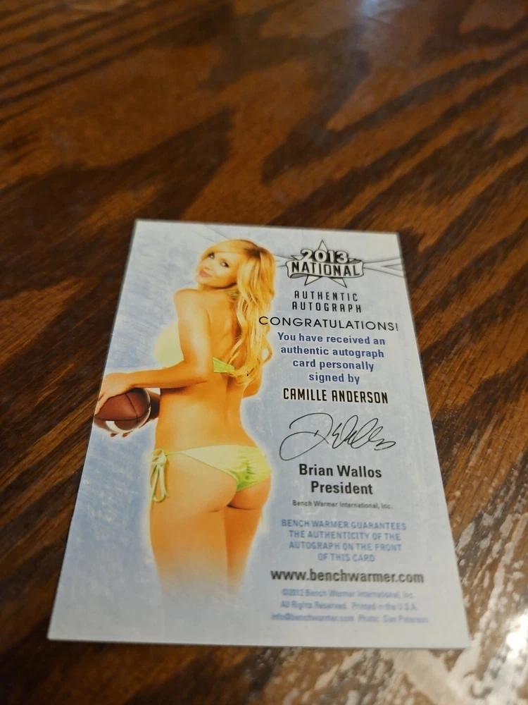 Benchwarmer 2013 Camille Anderson National Autograph Gold Foil Card Auto Playboy Camille Anderson, remember that name. She's already broken into the mainstream world of ultra-popular magazines such as the cover of Stuff, Loaded (UK top 100 girls for 2006,) FHM, Maxim, Marie Claire, Razor, American Health & Fitness, Men's Edge, OnFitness, Steppin' Out, Femme Fatale and Ralph (Top 200 Women in the World 2007.) In her biggest role yet, Anderson can be seen in Wedding Crashers, with Vince Vaughn and Owen Wilson. The highly anticipated blockbuster was the #1 comedy across the globe. And if you're a fan of Las Vegas on NBC, stay tuned! Her character is always returning for more episodes! She recently played Josh Duhamel's love interest and then tried to poison Tom Sellick's character! Camille loves comedy and it shows. You can catch her on HBO's Sketch Pad, cracking jokes and acting in all sorts of zany skits ala SNL. If you tune your TV to Mark Cuban's new channel HD Net, you'll see Camille sky-diving in Australia and bungee jumping in New Zealand. She's the new host and of "Get Out," an adventure travel show which takes her to exotic destinations around the world. Anderson was raised in Dallas, Texas where she thrived as an adolescent. After graduating from the University of Texas at Austin with a dual degree in broadcast journalism and acting, Camille already had "Dateline Associate Producer" under her belt. And Camille is on the move. She has bungee jumped in exotic locations such as Africa, New Zealand and Australia. When she's not on an adventure, her hobbies include cooking, hiking, snow skiing, and water skiing. In fact, she dreams of one day hosting her own cooking show! Please, look at all the pictures. Please check out my other eBay accounts... https://www.ebay.com/usr/kimmyrael https://www.ebay.com/usr/matlac99 https://www.ebay.com/usr/lacr6837 https://www.ebay.com/usr/malac9440 https://www.ebay.com/usr/lacr_3567 https://www.ebay.com/usr/lacroki8 https://www.ebay.com/usr/lacroki9 Shipping only to the continental US unless you contact me first. Will combine shipping!!!