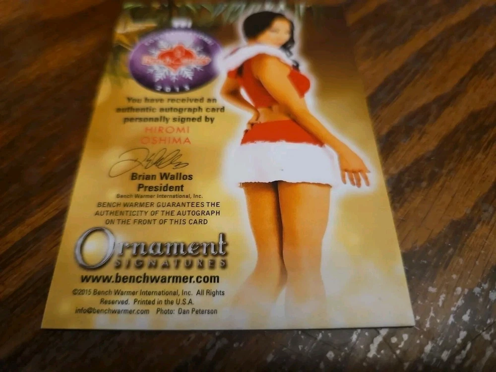 Benchwarmer 2015 Hiromi Oshima Happy Holidays Ornament Signatures Autograph Card Playboy Playmate Deliciously lithe, busty, and enticing brunette knockout Hiromi Oshima was born on January 6, 1980 in Tokyo, Japan. Oshima has a B.A. in communications and speaks fluent English, Spanish, and Japanese. She eventually moved to Miami Beach, Florida and first tried out for "Playboy" magazine scouts for the 50th Anniversary Playmate Hunt. After posing for a couple of newsstand special editions and being featured in a pictorial in the December, 2003 issue of the famous men's magazine, Hiromi was chosen to be the Playmate of the Month for June, 2004. Oshima has the distinction of being the first Japanese woman to be a Playmate. She went on to pose for a few more newsstand special editions and has appeared in several "Playboy" videos. Moreover, Hiromi was the January girl in the 2005 "Playmates at Play at the Playboy Mansion" swimsuit calendar. Outside of modeling, Oshima has also worked as a photo production coordinator, stylist, and producer for a number of magazine covers and photo shoots. She appeared as herself both in the comedy film "The House Bunny" and on the realty TV series "The Girls Next Door." Hiromi is featured in the music video for "Shake Ya Tailfeather" by Nelly, Sean "P. Diddy" Combs, and Murphy Lee. She has small roles in the movies "Batchelor Party 2: The Last Temptation" and "Race to Witch Mountain." Please, look at all the pictures. Please check out my other eBay accounts... https://www.ebay.com/usr/kimmyrael https://www.ebay.com/usr/matlac99 https://www.ebay.com/usr/lacr6837 https://www.ebay.com/usr/malac9440 https://www.ebay.com/usr/lacr_3567 https://www.ebay.com/usr/lacroki8 https://www.ebay.com/usr/lacroki9 Shipping only to the continental US unless you contact me first. Will combine shipping!!!