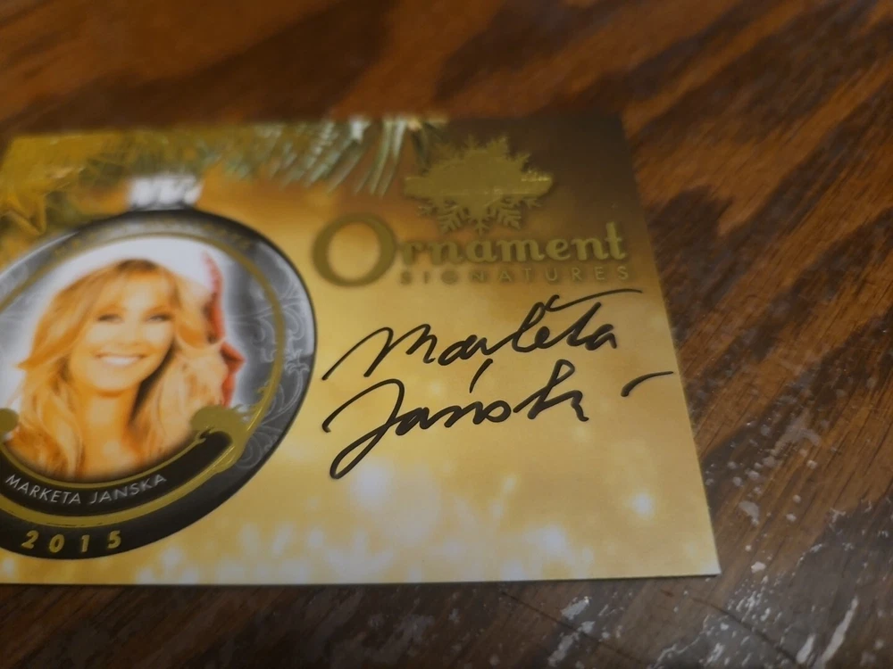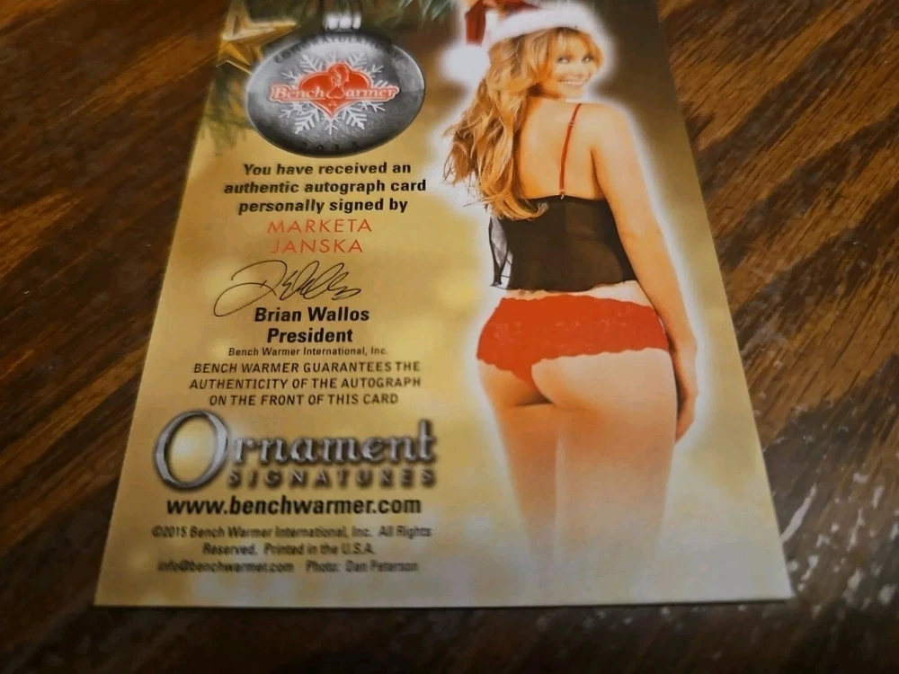 Benchwarmer 2015 Marketa Janska Happy Holidays Ornament Signatures Autograph Card Playboy Playmate Marketa Janska, born in the Czech Republic, is an actress, singer, and songwriter currently living in Los Angeles. She began her career as a model, living throughout Europe, and eventually moved to Los Angeles to pursue her true passions: music and theater. Marketa is a lyrical soprano, and has recorded one EP to date, entitled "How to Stay True". Her songs have been featured in independent films. She appears in various television commercials and films. She enjoys hiking and yoga, which are her two main sources of inspiration. P layboy Playmate of the Month July 2003. Please, look at all the pictures. Please check out my other eBay accounts... https://www.ebay.com/usr/kimmyrael https://www.ebay.com/usr/matlac99 https://www.ebay.com/usr/lacr6837 https://www.ebay.com/usr/malac9440 https://www.ebay.com/usr/lacr_3567 https://www.ebay.com/usr/lacroki8 https://www.ebay.com/usr/lacroki9 Shipping only to the continental US unless you contact me first. Will combine shipping!!!