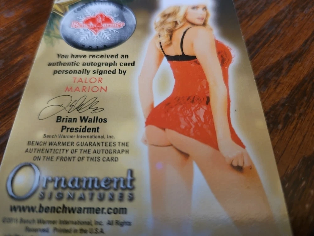 Benchwarmer 2015 Talor Marion Happy Holidays Ornament Signatures Autograph Card Playboy Playmate Please, look at all the pictures. Please check out my other eBay accounts... https://www.ebay.com/usr/kimmyrael https://www.ebay.com/usr/matlac99 https://www.ebay.com/usr/lacr6837 https://www.ebay.com/usr/malac9440 https://www.ebay.com/usr/lacr_3567 https://www.ebay.com/usr/lacroki8 https://www.ebay.com/usr/lacroki9 Shipping only to the continental US unless you contact me first. Will combine shipping!!!