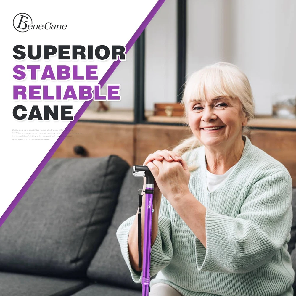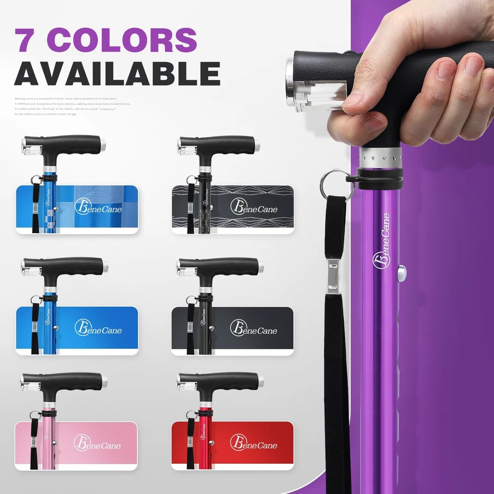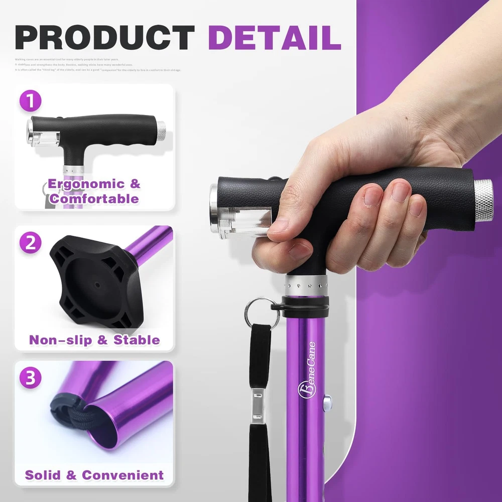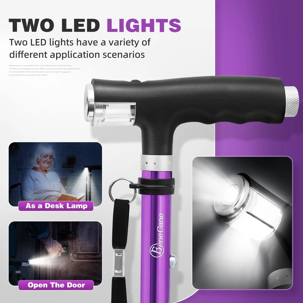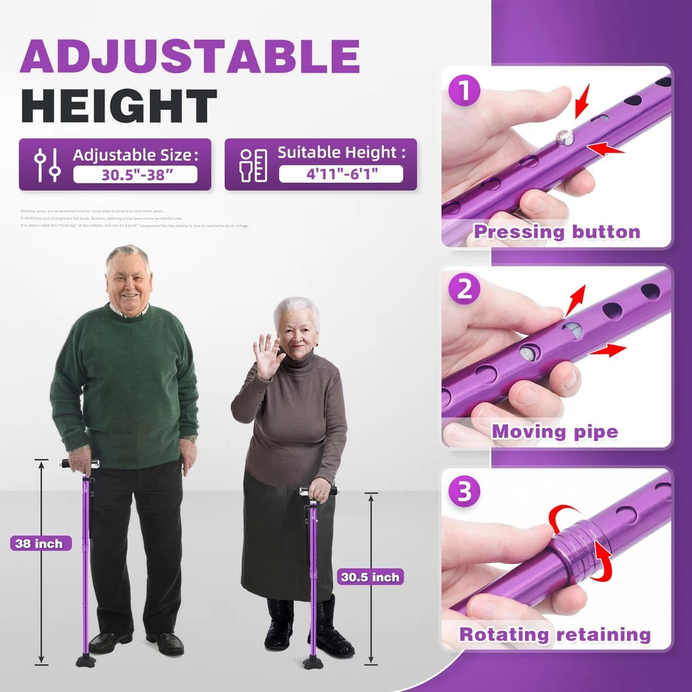 Aluminum Walking Cane with Light:it has 2 led lights.Different lights for different uses,headlight use for smooth road and down light uses for stairs,steps etc.battery is 2*AA(AA battery don’t include). Folding Cane:It’s a great walking sticks for women and men,the size is 17”X6.3”X4” after folded,fits anywhere especially in travel. Quad Cane:tube thickness is 1.2mm,1.5 times than other,The metal is silent when walking.The bottom is just large enough to make balance it,but not large enough to make it heavy. Canes for men with some added stability without taking up too much space. Adjustable Cane:Adjust size from 31” to 38”,suitable people height 4’8”-6’2”,it’s a very good Walking sticks for seniors Lightweight Cane:it just 0.99lb,It not only ensures the quality of the product, but also makes it light in weight,no matter cane for men or cane for women,it’s a better choice. Packing Detail:1*walking cane+1*nylon bag Packing Size:17.3*6*4.3inch Gross Weight:0.9lb