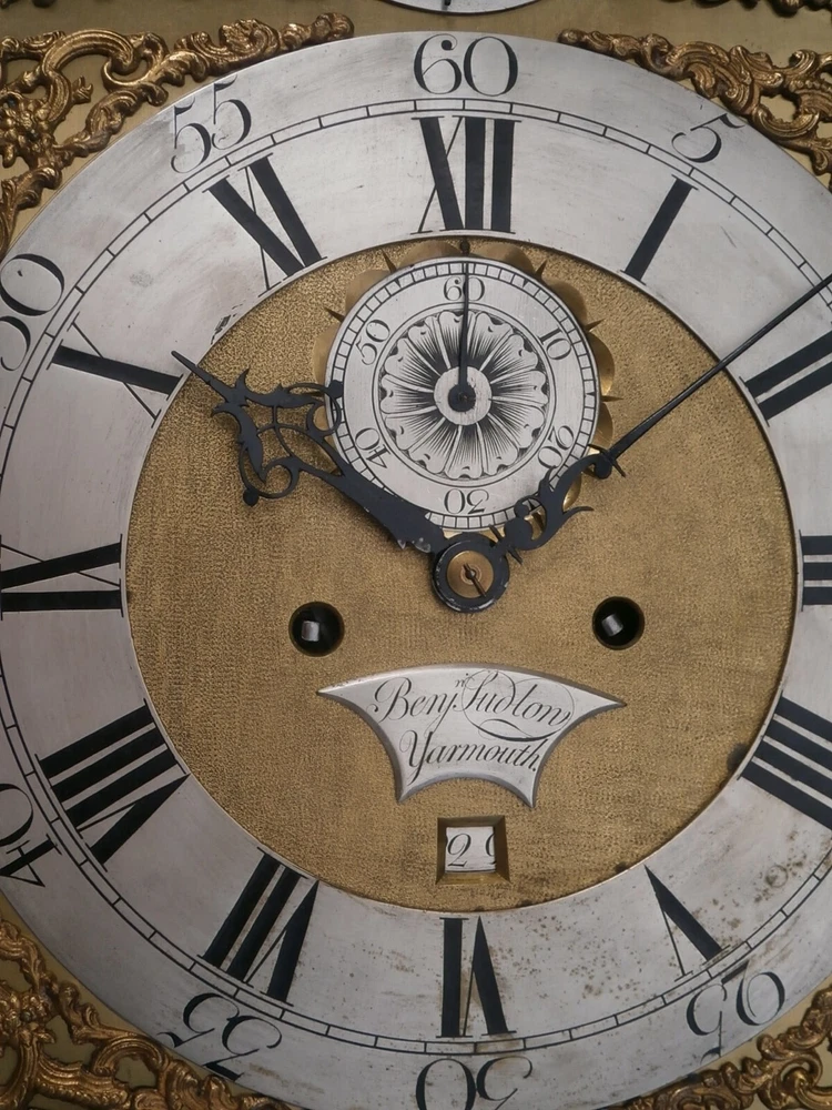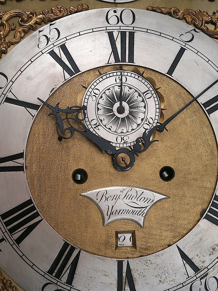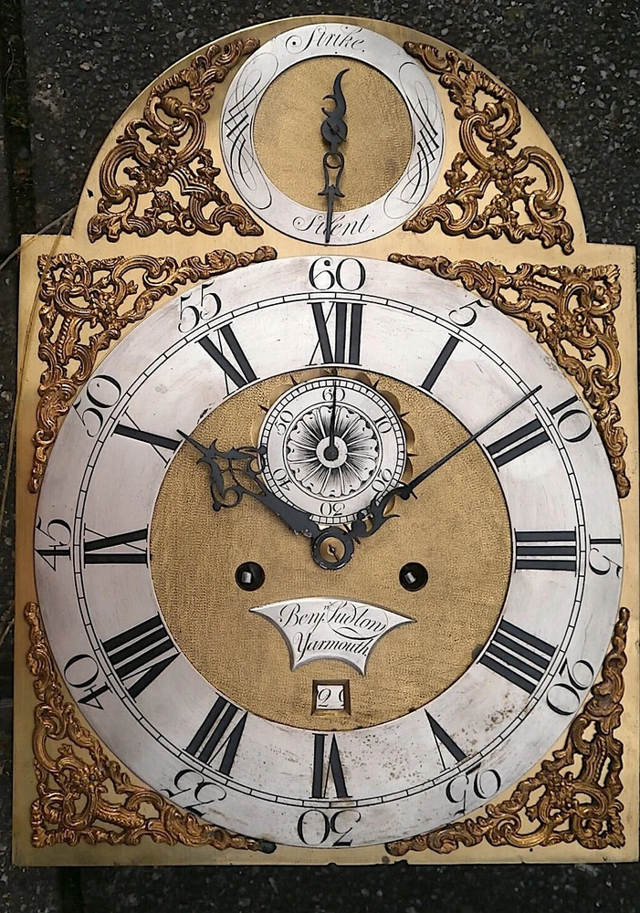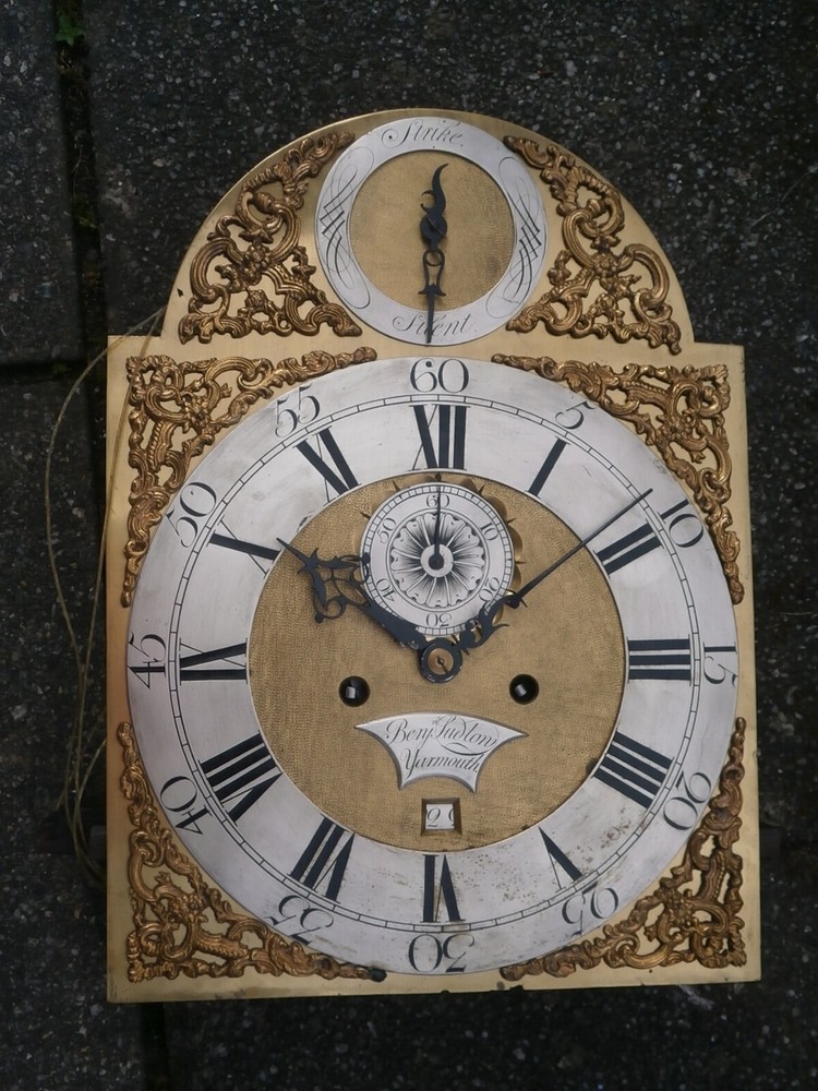 Benjamin Ludlow Yarmouth 8 day LONGCASE " CLOCK DIAL+movent 12X16+1/4 inch C1750 LONGCASE GRANDFATHER CLOCK DIAL+movement 12X16+1/4 inch sold as is in the photos in need or restoration as you see it in the photos PLEASE SEE PHOTOS TICKS AND STRIKES WITH PRESSURE ON THE GREAT WHEELS 8 day 12 X16 1/4 INCH dial + movement ALL ORIGIANL TO EACH OTHER GOOD ITS BEEING SOLD FOR SPARES OR REPAIR ' POST UK 20 GBP USA AND EUROPE 95 GBP