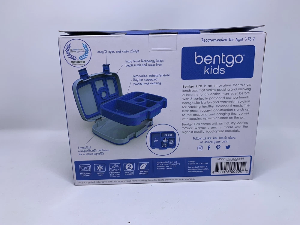Pattern: Solid Model: BGOKIDS-B Style: Modern Brand: Bentgo Type: Lunch Box Item Width: 8.5 in X 6.5 in Set Includes: Insert Country/Region of Manufacture: China Personalize: No Number of Compartments: 5 Features: Dishwasher Safe Material: BPA-Free Plastic Character: Blue Capacity: 16 oz gtin13: 853975005002 MPN: BGOKIDS-B UPC: 853975005002 Item Height: 2 in Table To Top Color: Blue Department: Kids Shape: Rectangular Custom Bundle: No Theme: Food & Drink Lid Type: Snap Lid Number of Items in Set: 2 Item Diameter: 2 in