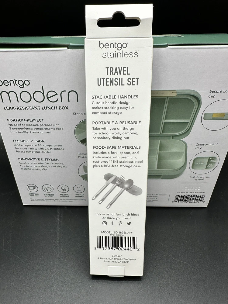 Both items are brand new and never opened This includes the lunchbox and the travel utensil set The utensil set is stainless steel
