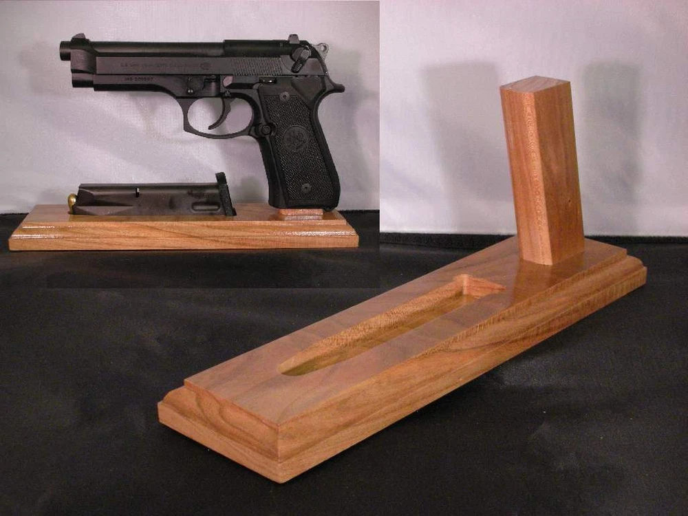 Cherry Pistol Stand specially made for Beretta M9 Family 9mm Double Stacked Why are my stands better? All Display Stands are made with the finest quality hand selected American Cherry clear heart wood cut and milled in the Shenandoah Valley of Virginia I work hard to get the barrels horizontal so every piece in your collection looks great when displayed together. Every piece is completely hand crafted in the USA. The Cherry is not stained to preserve the natural color. Five coats of durable polyurethane clear coat create a water free barrier to protect your piece. Felt feet protect your furniture. Serving collectors like yourself since 1996. Usually I get your order out within a few days, but if I am out of stock, I have to build the stand and that usually takes 1 to 2 week. Model with magazine slot:: 2.75 x 10.25 x 3/4 inches. Model without magazine slot: 2.75 x 7.25 x 3/4 inches Height: 5 inches We also do custom stands PISTOL NOT INCLUDED.