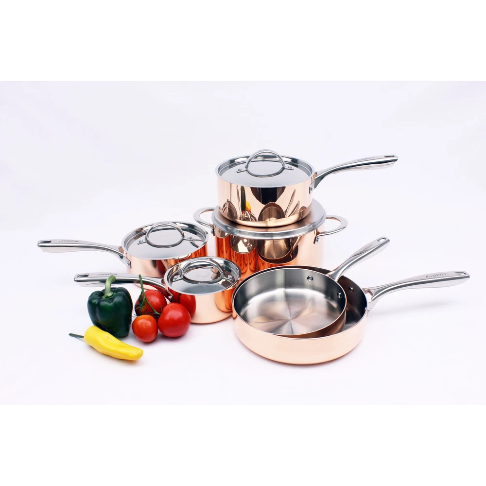Vintage 10pc polished tri-ply copper cookware set, a true masterpiece that will undoubtedly become the centerpiece of your kitchen. Made with durable polished copper exterior with aluminum alloy core & surgical grade stainless steel interior. The tri-ply construction of this cookware ensures even heat distribution, making it perfect for all your culinary creations. The ergonomic, comfort-grip handles make it easy to maneuver the pots and pans, while the polished design adds a touch of elegance to your kitchen decor. Whether you are a professional chef or a passionate home cook, this copper cookware set is a must-have for those who appreciate both style and functionality in their kitchen. Elevate your cooking experience and impress your guests with this exceptional cookware set that Free Shipping Over $49.99* Details BergHOFF Vintage 10pc Tri-Ply Copper Cookware Set with Lids, Polished Product Description: Vintage 10pc polished tri-ply copper cookware set, a true masterpiece that will undoubtedly become the centerpiece of your kitchen. Made with durable polished copper exterior with aluminum alloy core & surgical grade stainless steel interior. The tri-ply construction of this cookware ensures even heat distribution, making it perfect for all your culinary creations. The ergonomic, comfort-grip handles make it easy to maneuver the pots and pans, while the polished design adds a touch of elegance to your kitchen decor. Whether you are a professional chef or a passionate home cook, this copper cookware set is a must-have for those who appreciate both style and functionality in their kitchen. Elevate your cooking experience and impress your guests with this exceptional cookware set that combines artistry and performance seamlessly. Whether you're sautéing, simmering, or searing, this versatile cookware set has you covered, suitable for Electric, Gas, Halogen, and Vitro-ceramic. Oven safe 450°F. Hand wash recommended. Set includes 5.5" saucepan 1qt., 7" sauce pan 2qt., 8" sauce pan 3qt., 9.5" stockpot 5.75qt., 8" & 9.5" deep skillet with 4x lids. Set includes 5.5" saucepan 1qt., 7" saucepan 2qt., 8" saucepan 3qt., 9.5" stockpot 5.75qt., 8" & 9.5" deep skillet, crafted with tri-ply material, layered with 18/10 Stainless steel, aluminum core and copper exterior and equipped with ergonomic, comfort-grip handles. Includes 4x matching lids. Polished design. Featuring a tri-ply body that provides even heat distribution and retention, ensuring that your meals will cook thoroughly and evenly. Non-toxic and healthy, this material is PFAS-free and PTFE-free with a resistance to rust, corrosion and staining for long-lasting performance. Featuring a vapor seal lid, designed without a vent, that maintains the retention of foods' nutrients and taste by preventing moisture and juices from escaping and ensures your dishes remain flavorful and tender. This eliminates the need for excess water, as the foods are self-basted for an energy-efficient cooking process. No need to worry about under or overcooked meals thanks to this cookware's tri-ply construction, guaranteeing your food will be cooked evenly and thoroughly. Compatible with a wide range of cooktops including Electric, Gas, Halogen, and Vitro-ceramic. Ensure the longevity of your cookware with proper careallow to cool before washing, use a sponge or nylon scrubbing pad to remove food residue and stains, wash with warm water and mild soap, and avoid abrasive materials or harsh detergents.