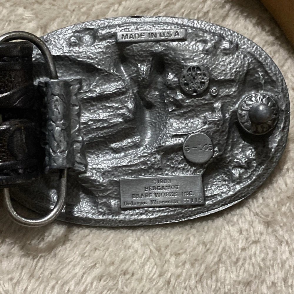 This is a vintage Bergamot Brass Works belt buckle made in 1983. The buckle features a pewter deer theme with enamel accents. This belt buckle is a great addition to any collection and is perfect for men who love hunting or the outdoors. Along with the buckle is a size 42 vintage hand tooled genuine full grain leather black belt in like new condition. Made in USA. No stress to any of the buckle holes. Excellent vintage condition.