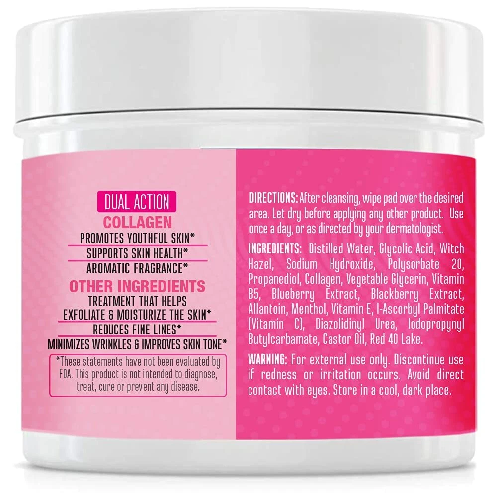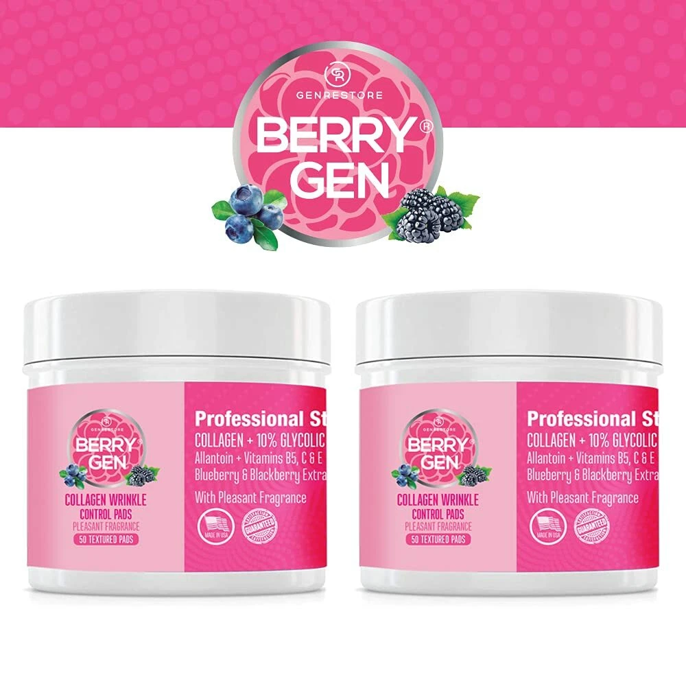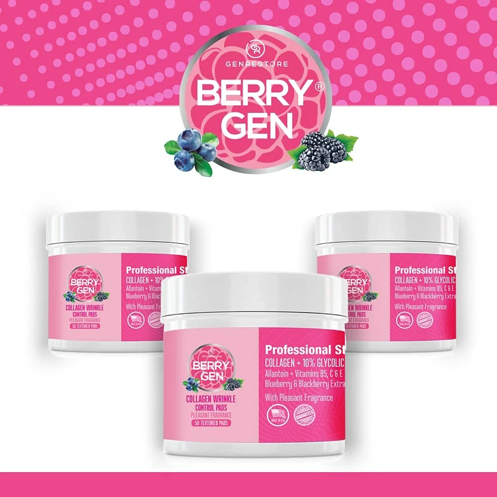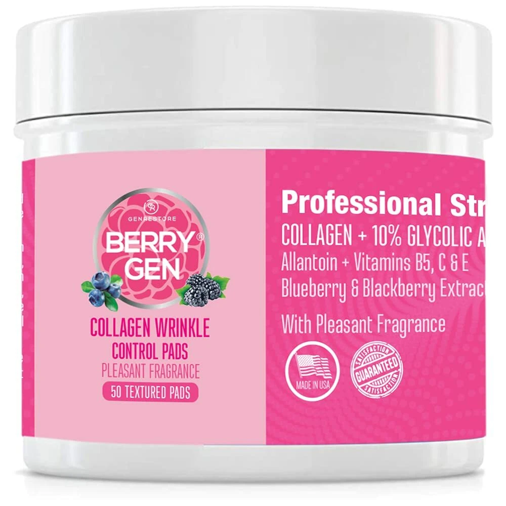 Berry Gen Wrinkle Control Pads for Face & Body with Ultra-Pure Glycolic Acid 10% | Allantoin | Vitamins B5, C & E | Visibly Reduce Under Eye Bags, Dark Circles, Fine Lines & Crow's Feet | 50 Count 🧴 WORKS GREAT FOR BOTH MEN AND WOMEN - Allantoin goes on clear so nobody will know you are using it. Both men and women nationwide are happy with their youthful-looking skin and younger appearance. 🧴 PRODUCTS ARE MADE IN THE USA in a GMP-certified and FDA-registered facility. We only use professional-grade ingredients and never any silicone or parabens. 🧴 BOOSTED WITH VITAMINS B5, C & E - Powerful antioxidants that will leave your skin fully hydrated and that will help repair photo-damage from UV rays. 🧴 WRINKLE CONTROL PADS - These pads come fully saturated with a solution containing 10% of pure Glycolic Acid. They exfoliate the skin and help prevent wrinkles and irregularities, maintaining the skin feeling softer and smoother. 🧴 PROFESSIONAL TEXTURED PADS - Each jar comes with 50 professional-grade textured pads with a convenient finger notch for easy application Product description Size: 3 Berry Gen Collagen Wrinkle Control Pads with Ultra-Pure glycolic acid 10%, allantoin, vitamins B5, C & E conveniently provide a gentle yet effective treatment that exfoliates and moisturizes the skin. ✔ Helps with fine lines and minimizes wrinkles. ✔ They visibly improve skin tone without irritation. Each jar contains 50 pads made of soft material with a waffle-shaped textured surface that will gently cleanse and exfoliate the skin without irritation. The pads feature a convenient finger notch that makes it easier to pick from the jar and they come fully saturated with a solution so that even the last pad in the jar will never be dry. Benefits of daily use: Exfoliate the skin and reduce the appearance of fine lines and wrinkles Encourage the generation of collagen responsible for skin cell turnover Improve skin hydration Leave the skin looking younger and more radiant Caution: ①For external use only, avoid contact with the eyes and damaged skin. ② In case of sensitive skin, please perform a skin allergy test on the inside of the arm before use. ③ Discontinue use if any allergies or discomfort occur. Keep out of reach of children. We stand behind all our products here in GenRestore so you can purchase and use our products with confidence. If you are not satisfied with any of our products, we will refund your purchase. Ingredients Distilled Water, Glycolic Acid, Witch Hazel, Sodium Hydroxide, Polysorbate20, Propanediol, Collagen, Vegetable Glycerin, Vitamin B5, Blueberry Extract, Blackberry Extract, Allantoin, Menthol, Vitamin E, l-Ascorbul Palmitate [Vitamin C), Diazolidinyl Urea, lodopropynyl Butyl carbamate, Castor Oil, Red 40 Lake. Legal Disclaimer For external use only. Discontinue use if redness or irritation occurs. Avoid direct contact with eyes. Store in a cool, dark place. Listing and template services provided by inkFrog
