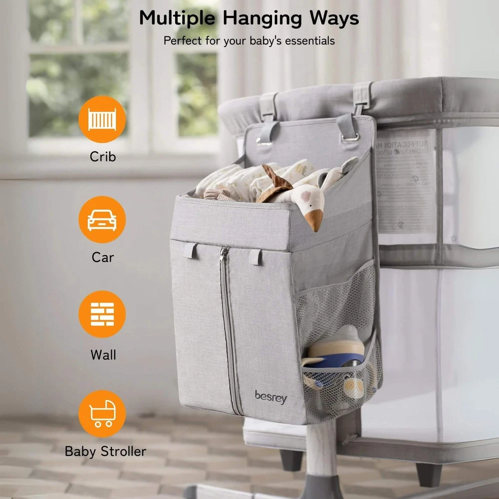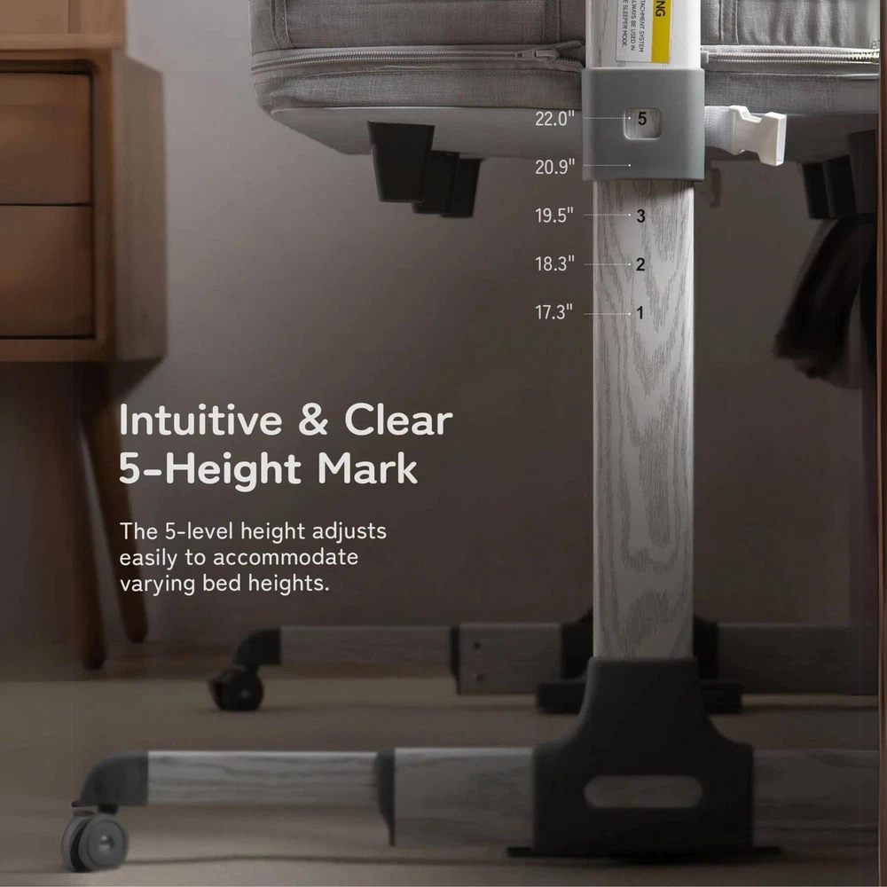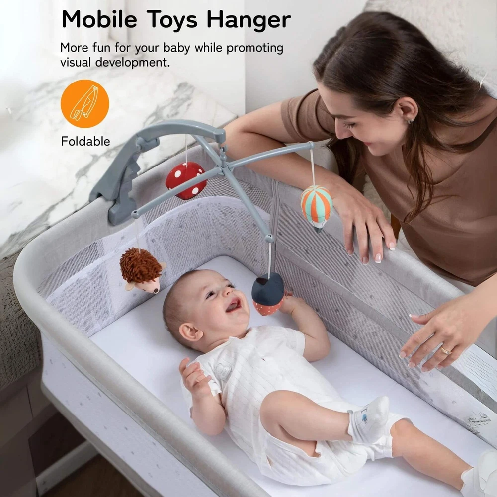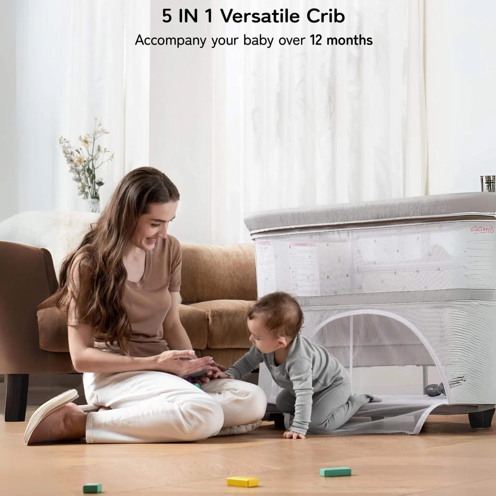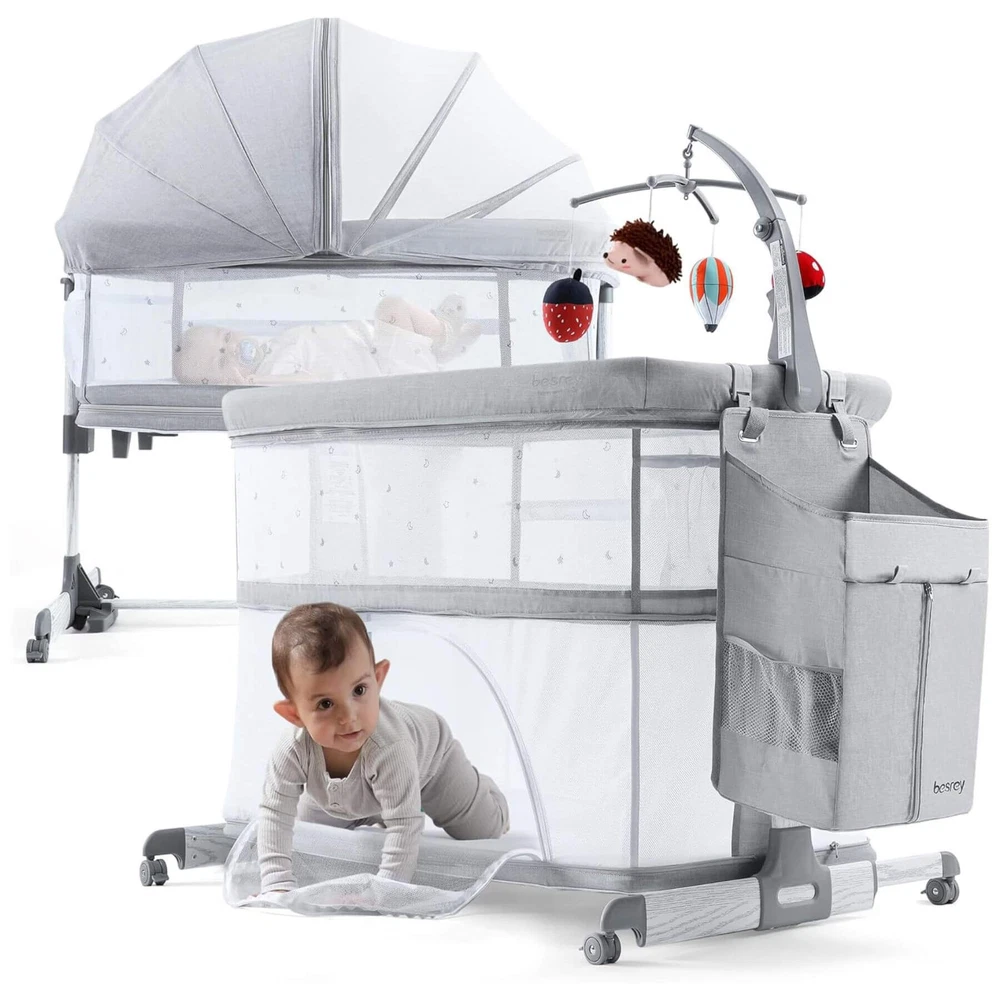 Besrey 5-in-1 Baby Bassinet Bedside Sleeper with Playpen, Mobile Toy Hanger, Hanging Diaper Bag, and Mattress DESCRIPTIONS The Besrey 5-in-1 Baby Bassinet Bedside Sleeper is the ultimate solution that grows with your baby. The crib seamlessly trasitions from a cozy bassinet to a fun playard. From peaceful sleeping environments to engaging playtime, this crib has it all, accompanying your baby from birth to over 1 year old. FEATURES 5 IN 1 Baby Bassinet: Standalone Bassinet (0-6M), Bedside Crib (0-6M), Baby Cradle (0-6M), Portable Crib (6-12M), and even Portable Playard (12-18M) in one Easy Transition: Very easy and quick to transition from the bassinets to the playard/mini crib, suitable up to 18 months 360° Breathable Mesh: Breathable mesh on the top and sides promotes breathability and visibility, allowing your baby to breathe better 5 Adjustable Heights: Adjustable to heights between 29.13" and 33.46" measured from floor to top of bassinet, it’s suitable for varying bed heights 360° Swivel Wheels with Brakes: This bedside sleeper for baby is seated on 4 universal casters each with its own sturdy brake Foldable Mobile Toy Hanger: designed with a mobile toy hanger, providing a source of entertainment for infants and supporting their developmental growth Hanging Diaper Bag: Come with a spacious hanging diaper bag with 4 pockets, 1 large compartment, and 1 shelf, perfect for your baby's essentials Spine Protective Mattress: A spacious shape memory mattress made of skin-friendly 3D vertical cotton is specifically designed for infants (0-6 months) Removable Zippered Mosquito Net: Provides extra protection from mosquito bites both outdoors and indoors Tool-free Assembly: Quick and easy assembly with no tools needed in 1 Min, solving your baby's sleep problems in unfamiliar surroundings or outside home Safety Ensured: The besrey bassinets bedside sleeper is fully compliant with ASTM, CPSIA, and CCPSA standards, keeping your baby safe SPECIFICATIONS Product Dimensions: 37.4"L x 27.6"W x 33.5"H Product Weight: 28 lbs Color: Elegant Grey Materials: Metal, Fabric Includes: Bassinet, Mattress, Mosquito Net, Detachable Sheet, Travel Bag, Storage Basket Manufacture SKU# BRBD003102AMXX Assembly Required: Yes Warranty: 2-year limited manufacture warranty Weight Capacity: 50 lbs Product Care: Hand Wash Only. ABOUT BESREY Besrey, established in 1998, are dedicated to providing parents with thoughtfully designed products built to the highest standards. Our mission is to ensure your baby's safe and healthy growth while easing the stress of being a new parent. We rigorously test our products and use only the best materials to meet the strictest safety criteria. Founded by product engineer and mom, Mirabelle, Besrey was created to address the flaws in existing baby products. Today, Besrey offers a wide range of safe, reliable, and comfortable baby products in over 130 countries, helping parents worldwide solve their parenting challenges with love and care. Besrey 5-in-1 Baby Bassinet Bedside Sleeper with Playpen, Mobile Toy Hanger, Hanging Diaper Bag, and Mattress DESCRIPTIONS The Besrey 5-in-1 Baby Bassinet Bedside Sleeper is the ultimate solution that grows with your baby. The crib seamlessly trasitions from a cozy bassinet to a fun playard. From peaceful sleeping environments to engaging playtime, this crib has it all, accompanying your baby from birth to over 1 year old. FEATURES 5 IN 1 Baby Bassinet: Standalone Bassinet (0-6M), Bedside Crib (0-6M), Baby Cradle (0-6M), Portable Crib (6-12M), and even Portable Playard (12-18M) in one Easy Transition : Very easy and quick to transition from the bassinets to the playard/mini crib, suitable up to 18 months 360° Breathable Mesh : Breathable mesh on the top and sides promotes breathability and visibility, allowing your baby to breathe better 5 Adjustable Heights: Adjustable to heights between 29.13" and 33.46" measured from floor to top of bassinet, it’s suitable for varying bed heights 360° Swivel Wheels with Brakes: This bedside sleeper for baby is seated on 4 universal casters each with its own sturdy brake Foldable Mobile Toy Hanger: designed with a mobile toy hanger, providing a source of entertainment for infants and supporting their developmental growth Hanging Diaper Bag: Come with a spacious hanging diaper bag with 4 pockets, 1 large compartment, and 1 shelf, perfect for your baby's essentials Spine Protective Mattress: A spacious shape memory mattress made of skin-friendly 3D vertical cotton is specifically designed for infants (0-6 months) Removable Zippered Mosquito Net : Provides extra protection from mosquito bites both outdoors and indoors Tool-free Assembly: Quick and easy assembly with no tools needed in 1 Min, solving your baby's sleep problems in unfamiliar surroundings or outside home Safety Ensured: The besrey bassinets bedside sleeper is fully compliant with ASTM, CPSIA, and CCPSA standards, keeping your baby safe SPECIFICATIONS Product Dimensions: 37.4"L x 27.6"W x 33.5"H Product Weight: 28 lbs Color: Elegant Grey Materials: Metal, Fabric Includes: Bassinet, Mattress, Mosquito Net, Detachable Sheet, Travel Bag, Storage Basket Manufacture SKU# BRBD003102AMXX Assembly Required: Yes Warranty: 2-year limited manufacture warranty Weight Capacity: 50 lbs Product Care: Hand Wash Only. ABOUT BESREY Besrey, established in 1998, are dedicated to providing parents with thoughtfully designed products built to the highest standards. Our mission is to ensure your baby's safe and healthy growth while easing the stress of being a new parent. We rigorously test our products and use only the best materials to meet the strictest safety criteria. Founded by product engineer and mom, Mirabelle, Besrey was created to address the flaws in existing baby products. Today, Besrey offers a wide range of safe, reliable, and comfortable baby products in over 130 countries, helping parents worldwide solve their parenting challenges with love and care. × × 