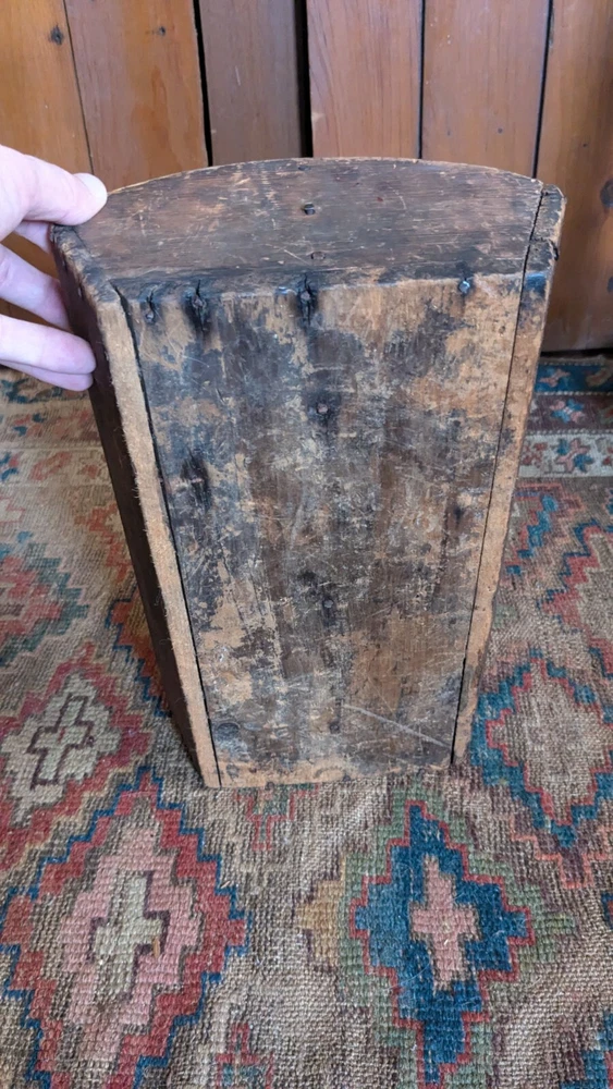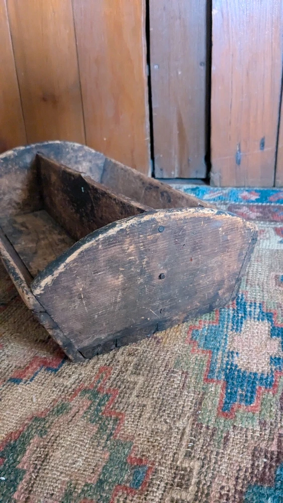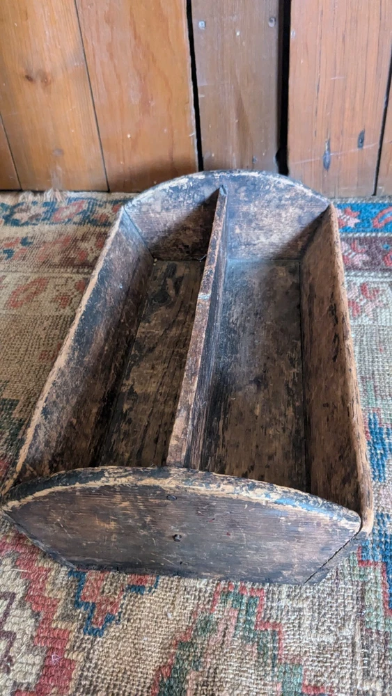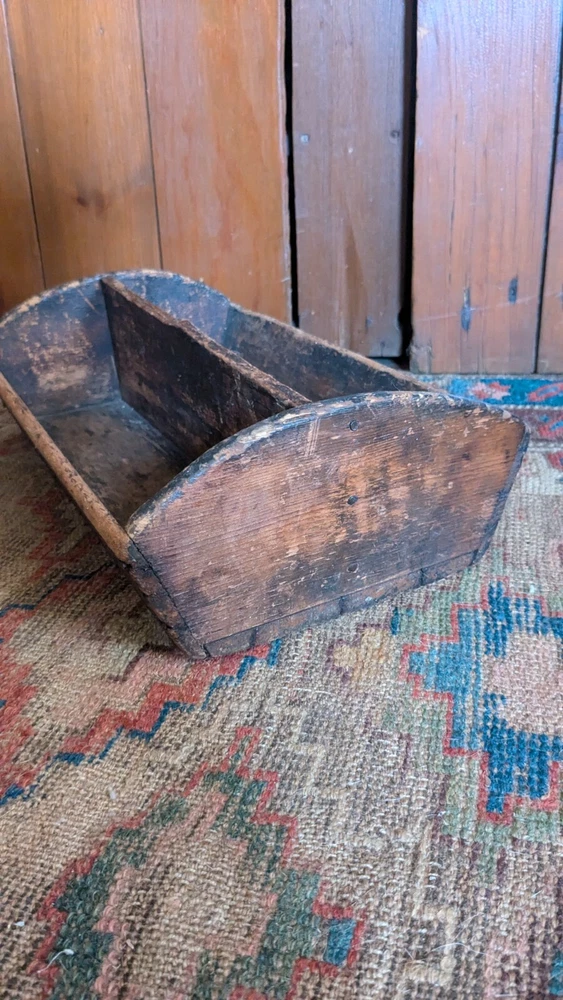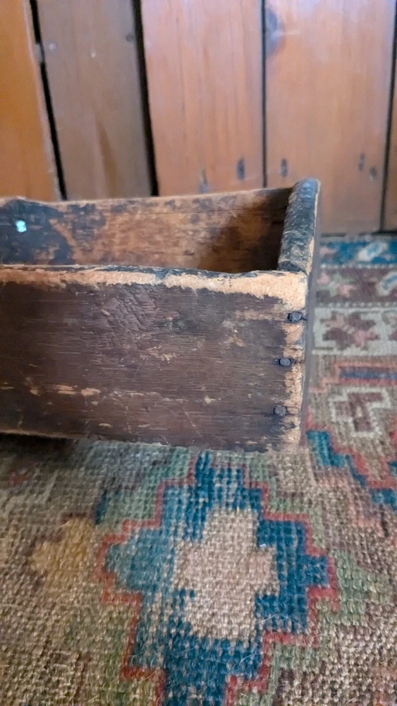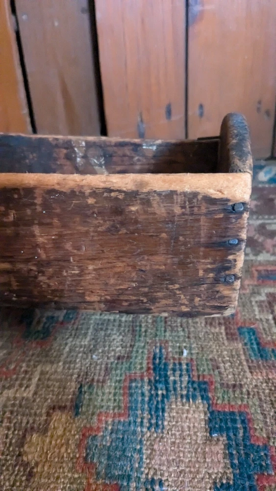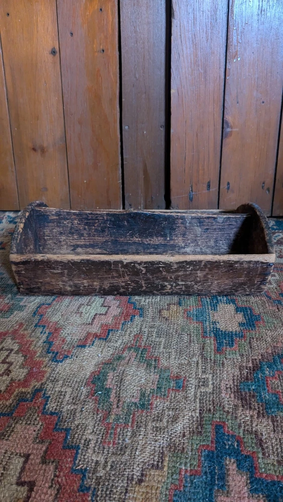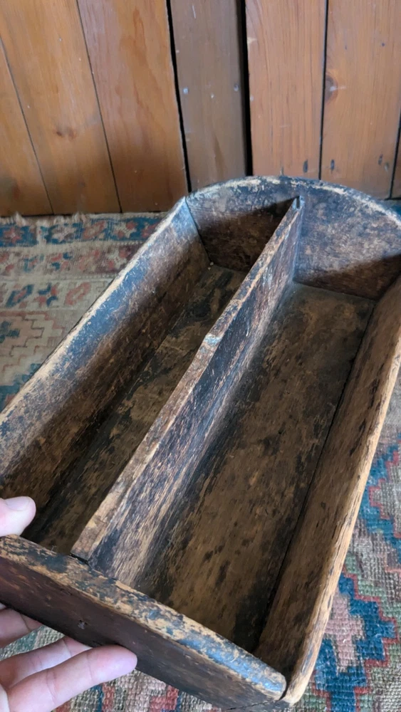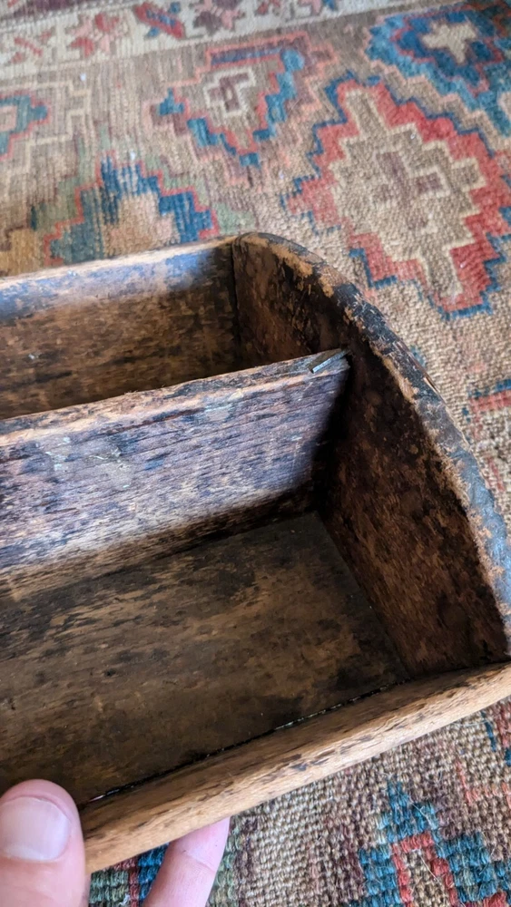 Offering this antique wood handmade cutlery. Measures 14 x 8.5 x 4.5" T. This tote has the best surface that pics truly don't justify. Has a wear and character we all desire to have on a piece. Constructed with square nails. One sticks out a little bit nothing major nor anything loose. Has a divider but missing handle. Beautiful piece to display many different ways and items. Expect imperfections consistent with age and use. Thanks for looking