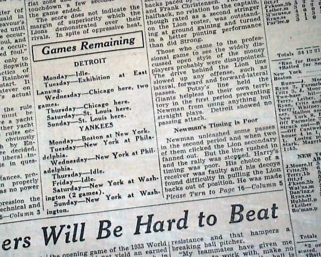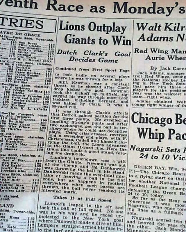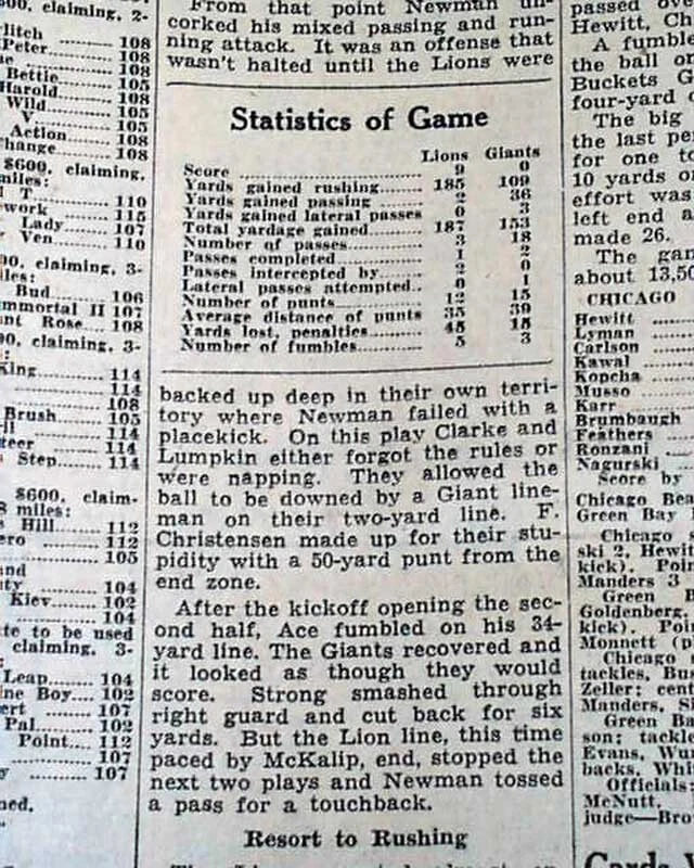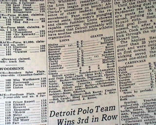 Best DETROIT LIONS Very 1st NFL Football Game Franchise History 1934 Newspaper Offered is an original, collectible newspaper (NOT a copy/reproduction): THE DETROIT FREE PRESS, Sept. 24, 1934 * Detroit Lions very 1st football game * NFL - National Football League * In a Detroit publication (very rare) The front page of the sport's section (pg. 13) has a four column heading: "Lions Defeat Giants in Opener, 9-0" with subheads and related photo. (see images) Also includes stats and lineups. First report coverage continues on page 20 with lineups. Some spine wear causes some text loss here. A related photo is at the top of page 18. Great to have this this Detroit publication. I suspect this to be an extremely rare item because their was really no reason to save it at the time. Twenty pages, some heavy margin wear and chipping, especially along the right margin but doesn't affect the Lions reporting, should be handled with care. wikipedia notes: The 1934 Detroit Lions season was the fifth in franchise history and the first in Detroit; the franchise had previously played as the Portsmouth Spartans in Portsmouth, Ohio, a city with a population of approximately 40,000. Under head coach Potsy Clark, the Lions won their first ten games (of which the first seven were shutouts) then lost three straight in an eight-day span to end the season at 10–3. They finished in second place in the NFL Western Division, three games behind the undefeated Chicago Bears. Please Note: All of our offerings are 100% authentic! We do not offer reprints or reproductions of any kind. They are guaranteed to be original! Links to Archival Storage Options & Certificates of Authenticity Are Below! Historical reports may be beautiful or ugly, but they are always informative. While we rejoice in the beautiful (heroic, discovery, amazing feats, etc.), we at History's Newsstand also offer "the ugly" for we are determined to learn from the wrongs of the past - understanding, to do so, we must be willing to look these wrongs directly in the face and shout "NO MORE!". It is for this reason many Black Americans collect historic slave ads, Jews collect reports regarding the Holocaust, women collect coverage of the Women's Suffrage Movement, etc.. If you find any to be offensive, we agree! Hopefully this is an indication we are moving in the right direction. Domestic Shipping Policy... For this specific item, A U.S. winner pays $10.00 S&H. If multiple items are purchased and paid for simultaneously , the S&H will be calculated by using the highest item's S&H as the base cost , and then adding a small amount for each additional newspaper. The per-item additional cost for newspapers, folders, portfolios, and presentation cases vary according to size and weight. All U.S. orders include in-house insurance at no additional cost to the buyer and include delivery confirmation. All orders include tracking & delivery confirmation. Orders ship within 24 business hours of receiving payment. Some small items may be shipped 1st Class. We will still provide tracking and insure them at our expense. Combined Shipping Notice If the automated eBay checkout process does not properly combine shipping, we will refund overages automatically. If you prefer, contact us prior to payment to obtain a revised invoice. International S&H Policy... If the S&H to your location is not given, international buyers/winners should contact us for an invoice which includes S&H . Import duties, taxes, VAT. etc. are not included in our quoted S&H. These charges are the buyer’s responsibility. Note: We will not falsify customs declarations or mark an item as a "gift" in order to avoid customs fees. If insurance is desired, be in touch for a quote. All insured orders are subject to customs, duties, & taxes for the amount insured and are the buyer's responsibility. International purchasers are encouraged to take advantage of our combined shipping policy to lower the cost per item S&H. If you wish to take advantage of combined shipping, please do not pay for any until you are finished - and then contact us for a combined invoice. If You Are Unhappy With Your Order We make every effort to provide the best possible buying experience. If we fall short of your expectations in any way, please contact us so we can try to make things right for you. Archival Storage... ...is available for an additional $15.00, plus an appropriate adjustment to S&H (see above Shipping Policy). If desired, purchase this directly (through eBay) at: archival storage folder . Again, to insure you will receive the appropriately sized folder for your item, please select the $15.00 folder option. Certificate of Authenticity... A certificate of authenticity is also available for an additional $3.00, which includes both the issue date and title, and certifies, by Timothy Hughes Rare & Early Newspapers, the issue to be authentic & original. If desired, purchase this directly (through eBay) at: certificate of authenticity . About Us... Contact Information... We have been both collectors and dealers in rare newspapers since 1975, serve as consultants to multiple museums, and are members of both the Ephemera Society of America and the American Antiquarian Society. Bid & Buy with confidence knowing every item we offer is guaranteed to be authentic. Timothy Hughes Rare Newspapers P.O. Box 3636 Williamsport, PA 17701-8636 Hours: M-F, 7:30-4:00 EST View our additional ebay offerings "...desiring to conduct ourselves honorably in all things." Heb. 13:18 In an effort to honor eBay's policies and our loyal customers who watch our listings, we do not end auction items early. We hope you understand! " Were it left to me to decide whether we should have a government without newspapers, or newspapers without a government, I should not hesitate a moment to prefer the latter." Thomas Jefferson