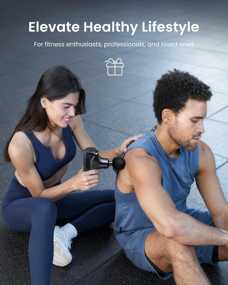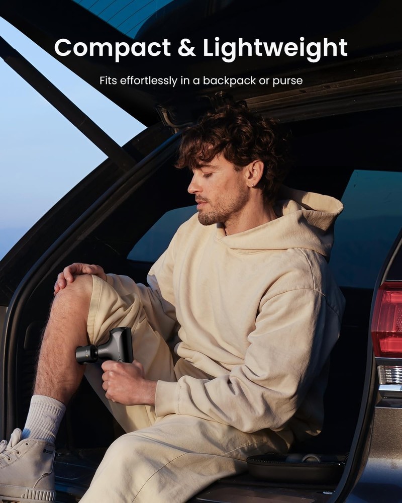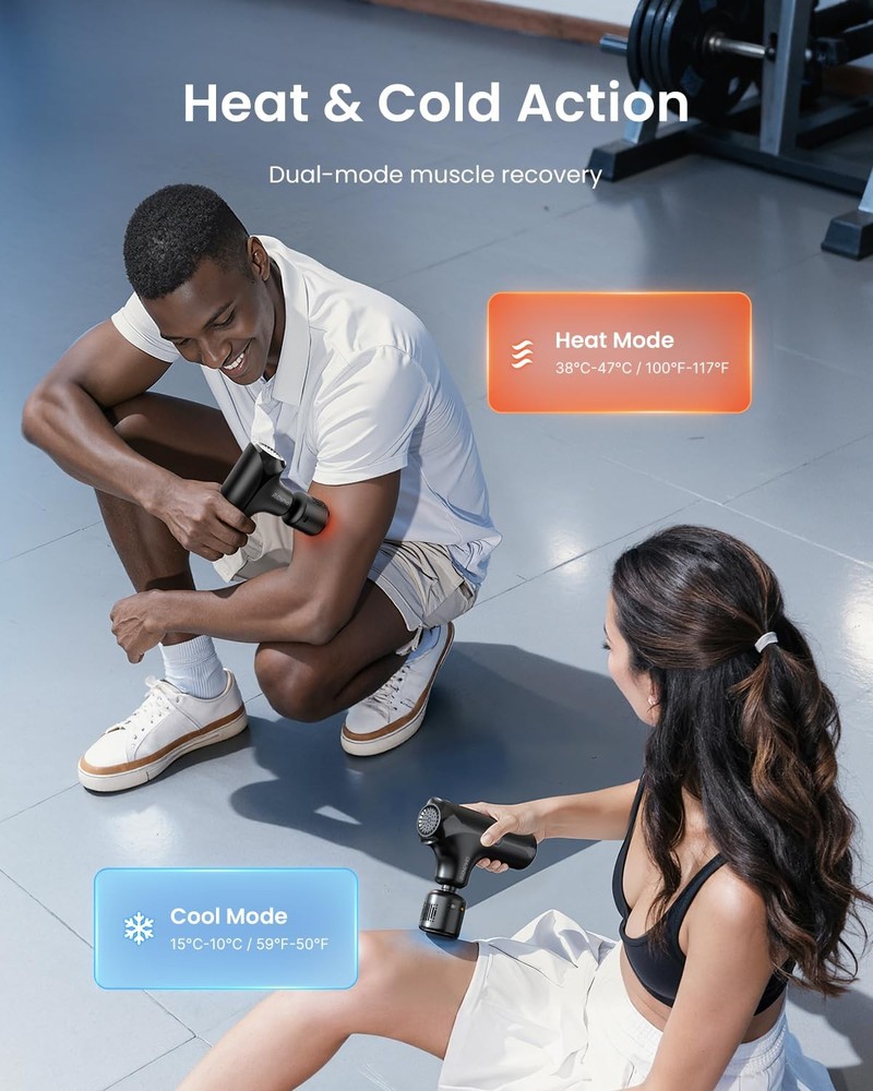 Mini Massage Gun Instant Thermal Comfort : Switch from heat to ease stiff muscles to cold for reducing post-workout swelling. With 4 precise temperature settings, the mini massage gun delivers personalized comfort for any need Relief On The Move: This massage gun is lightweight and mini-sized. It comes with 4 interchangeable massage heads to target different muscle groups, along with a portable storage pouch for convenient use Targeted Deep-Tissue Massage: Featuring a premium brushless motor with 5 adjustable speed settings (1800–3000 strokes per minute) and a 7mm amplitude, this muscle massage gun delivers professional-grade recovery after intense workouts or long days Quiet & Rapid Recharge: Supports fast charging and reaches full charge in just 2 hours, with quiet 45 dB operation that lets you unwind and enjoy powerful relief packed into a small massage gun without disturbing a soul Power That Lasts: Equipped with 3x 2600mAh lithium batteries to deliver extended massages without frequent recharging. This ideal massage gun with heat allows you to enjoy deep relief anytime, whether you're at home, the gym, or on the go