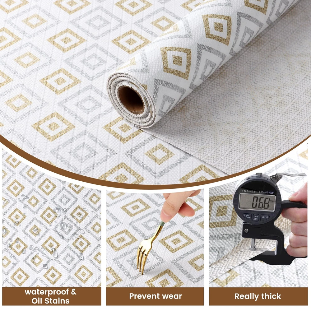 Shelf Liners for Kitchen Cabinets Non-Adhesive, Cabinet Liners for Shelves, Drawer Liners for Kitchen Cabinets,10" X 120" Strong Grip Waterproof Thick Washable Mat For Cupboard Bathroom Dresser Pantry, Gold Geometry Transform your shelves with this elegant gold and silver geometric pattern. Keep your precious items safe from scratches, stains, and spills while adding a touch of style to your space. Say goodbye to messy cabinets with these non-slip liners that provide a strong grip for all your pots, pans, and dishes. Keep everything in place and protect your cabinets from damage effortlessly. Give your drawers a makeover with these washable mats that are easy to clean and maintain. Enjoy organized and neat drawers without the hassle of constantly rearranging items. Upgrade your cupboards, bathroom cabinets, shelves, dresser, or pantry with these waterproof liners that offer durable protection against moisture and dirt. Keep your storage spaces looking fresh and new for longer. Save time and effort by simply washing away any spills or stains on these thick liners. Enjoy a low-maintenance solution to keeping your drawers and shelves clean and beautiful at all times. Shelf Protector liner : The thick shelf liner is made of top quality PVC material, BPA FREE, durable to protect the surfaces from scratches, spills, and general wear and tear, order in your living spaces. Ease of Cutting and Installation: shelf liners for kitchen cabinets non-adhesive, Can be cut into desired shapes and size, easy to use and install. The cabinet shelf liner perfect solution for organizing your shelve, drawer, cupboard, refrigerator, countertops,closet. Double-Sided Non Slip Design: Strong Grip kitchen Shelf Liner enhances the friction between shelf liners and other items. Keeps items in your kitchen cabinets,kitchen drawer,shelving,bedroom dresser drawer,toolbox drawer,bathroom,fridge,shoes shelf in place. Non-Adhesive & No Edge Curling: shelf and drawer liners non adhesive, Allowed you to easily position and reposition the liner without leaving any sticky residue on your cherished furniture surfaces. non adhesive shelf liners has non-curling edges to ensure a neat and attractive finish for any surface. Waterproof & Ease of Cleaning: Kitchen cabinets liner waterproof,Oil proof. Waterproof shelf liner providing the ultimate protection for furniture against stains.Removable and washable,easy to wipe down, keep shelves and cabinets clean and dry.
