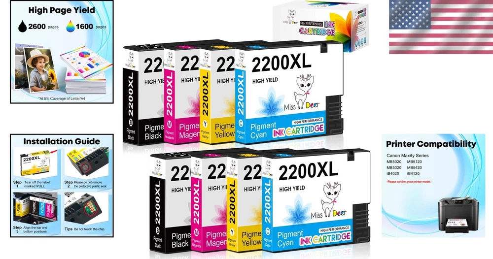 Best Value High Yield PGI-2200XL Ink Cartridges for Canon Maxify - 2600 Pages ‹ › ‹ › ‹ › ‹ › ‹ › ‹ › ‹ › ‹ › ‹ › High Yield PGI-2200XL Ink Cartridges for Canon Maxify Experience superior printing performance with our Best Value High Yield PGI-2200XL Ink Cartridges, designed specifically for Canon Maxify printers. Offering an impressive page yield and exceptional quality, these cartridges ensure that your documents make a lasting impact. Package Includes: 2 Black Cartridges 2 Cyan Cartridges 2 Magenta Cartridges 2 Yellow Cartridges Total of 8 Pack Compatibility: 100% compatible with Canon Maxify Models: MB5420 MB5320 MB5120 MB5020 IB4120 IB4020 High Page Yield: Approx. 2600 pages per PGI-2200 XL (Black) Approx. 1600 pages per 2200XL (Cyan) Approx. 1600 pages per 2200XL (Magenta) Approx. 1600 pages per 2200XL (Yellow) Page yield based on 5% coverage of A4 paper. Advantages: Save both time and money with high-capacity cartridges. Innovative dual ink technology for vibrant color and durable prints. Ensures your satisfaction with every print. Why Choose Our Ink Cartridges? Don’t settle for less when it comes to your printing needs. Our PGI-2200XL Ink Cartridges utilize a cutting-edge dual ink technology that combines the richness of dye-based color inks with the permanence of pigment-based black inks. This unique blend captures intricate details and delivers vibrant colors on plain paper. Please confirm your printer and cartridge model before placing your order to ensure compatibility. Upgrade your printing experience with our high-yield ink cartridges today! Shipping Free & Fast Shipping - We offer free shipping to most of the USA with a normal delivery time of 3-7 days. However, due to the current situation, additional delivery time (up to 3 weeks) may be required for some items. Alternative Carriers - We may use alternative carriers (e.g. USPS, FedEx, UPS, etc.) to ensure your package arrives safely and on time. Due to the use of multiple carriers, we are unable to provide a tracking number automatically. Handling Time - Orders are processed and shipped within 1-2 business days of receiving cleared payment. Shipping Restrictions - Shipping to Alaska, Hawaii, Puerto Rico, Guam, and other US territories may incur shipping charges or delivery restrictions. Please contact us before ordering, or your order can be refunded/cancelled. State Restrictions - There may be restrictions based on your state of purchase. For example, certain items may not be shipped to California due to state regulations. Contact for Tracking Updates - If you require tracking updates or have any concerns about the delivery of your order, please feel free to contact us, and we will be happy to assist you. Return 30-Day Hassle-Free Returns - We want you to be completely satisfied with your purchase. If you are not, you can return the item within 30 days of receiving it for a full refund or exchange. Easy Return Process - To start a return, simply contact us and we will provide you with a prepaid return shipping label and detailed instructions. Restocking Fee - There are no restocking fees for returns. However, the buyer is responsible for return shipping costs if the return is not due to a seller's error. Refund Processing Time - Refunds will be processed within 5 business days of receiving the returned item in its original condition. Payment We accept all major credit cards, PayPal, and Apple Pay for your convenience. Your payment information is secure and encrypted to ensure a safe and seamless transaction. Please complete your payment within 3 days of purchase to avoid any delays in shipping. Feedback Your feedback is extremely important to us. We strive to provide the best products and customer service possible. If you are satisfied with your purchase, please take a moment to leave us a positive review. If you have any concerns or issues with your order, please contact us before leaving negative feedback. We are committed to resolving any problems and ensuring your satisfaction. Contact Us If you have any questions or concerns, please feel free to reach out to our customer support team. You can contact us through the eBay messaging system. We are available Monday to Friday, 9:00 am to 5:00 pm EST, and we will do our best to respond to your inquiry within 24 hours. Buy it now and enjoy a pleasant shopping experience! UPC: Not Set Unit Quantity: 1 Expiration Date: 2025-12-31 Item Height: Not Set Item Length: Not Set Item Width: Not Set Color: Black,Cyan,Magenta,Multicolor,Yellow Compatible Brand: For Canon Compatible Model: For Canon MAXIFY MB5020,For Canon MAXIFY MB5420,For Canon MAXIFY MB5320,For Canon MAXIFY MB5120,For Canon iB4120,For Canon iB4020 Print Technology: Inkjet Brand: Unbranded Type: Compatible Model: PGI-2200XL MPN: Not Set Unit Type: lb Country/Region of Manufacture: Not Set Manufacturer Warranty: Not Set