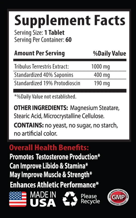 TRIBULUS TERRESTRIS EXTRACT 1000 mg TESTOSTERONE BOOSTER MUSCLE ENHANCEMENT NATURAL FORMULA Manufactured For Health Solution Prime 2 Bottles 12 0 Tablets Made in USA Benefits of Tribulus Terrestris: Elevates Testosterone level Encourages muscle development Maintains energy levels Contributes to: Fertility and better sexual function Healthier Libido and satisfaction Prostate health Weight loss Better sleep Tribulus terrestris appears to raise/turn on natural testosterone production in men via the activation of hormone secretion and estradiol. Clinical studies in Bulgaria have shown Tribulus terrestris to increase the sex hormones LH (luteinizing hormone) level by 72% and the body's own free testosterone level by 41% in healthy adult males in only five days. LH regulates the testosterone production in the testes and high levels of LH coincide with high testosterone levels. Tribulus has become increasingly popular among athletes because it reportedly increases strength and stamina. Studies on Tribulus use are ongoing. The extract contains alkaloids, saponins, resins and nitrates and is popularly used as a sports nutrient in USA. The extract of the plant is recognized as an organic supplement. It has anti-oxidant and hypolipedemic activities. Tribulus Terrestris extract was effectively used for nonspecific men's sexual problems and aging. It has been popularized as a natural product to enhance libido and fertility in both men and women. Tribulus terrestris is a traditional herb used to enhance sexual function, increase muscle mass and improve sperm motility. It is also touted in the care of other conditions such as urinary problems and skin conditions. Mixtures of different compounds found in the fruits, stems and roots of tribulus terrestris provide its medicinal properties. According to the EmedTV website, early research suggests that tribulus terrestris may increase the levels of hormones such as tetstosterone and dehydroepiandrosterone, or DHEA. Based on these results, this herb is used by individuals assuming it will increase their hormone levels and improve their sexual functions, increase the levels of Testosteronee, also sex drive and performance. The rise in Testosteronee level reduces the time for the muscles to recover, and enhances protein synthesis, or the process that living cells manufacture proteins from their constituent amino acids, based on the genetic information carried in the DNA of the chromosomes. It also promotes positive nitrogen balance. The combination of these actions all help to strengthen and increase muscle mass. Active components and benefits: Active components are plant steroids, flavonoids, alkaloids, and glycosides. For men's health issues, Tribulus has been shown in at least one study to increase levels of natural Testosterone, luteinizing hormone, follicle stimulating hormone, and steroids without any harmful side effects. Some may find increased stamina, which is beneficial for developing muscle size and strength. For women's health issues, it increases libido, improves ovulation effect, decreases vasomotor symptoms accompanying menopause. It also has been used to improve fertility naturally. Other positive changes observed in a number of cases include a reduction of cholesterol and positive psychological effects such as improved mood and increased self-confidence. This herb may also help with cardiovascular conditions beyond cholesterol as well including angina, high blood pressure, and poor circulation. It is also believed to be helpful with some digestive problems, food poisoning, and overeating. Administration of Tribulus had a mild diuretic effect in several cases in the human trials. It has also been found to fight infections and play a role in curing urinary tract infections. It also is credited with helping maintain energy levels, promote better sleep and stabilize mood. All in all, when we look at all of the reasons listed above, we find that the Tribulus terrestris can help you in different ways, whether you need something to enhance your mood, rev up your libido, increase your physical strength and energy or help with high cholesterol. But really, the key main benefit of this herb is its Testosterone-boosting properties. If you’re suffering from low-T or andropause, Tribulus may be the solution you’re looking for. Improved muscle growth and strength is a nice perk, too. SUPPLEMENT FACTS: Serving size: One tablet Serving per container: 60 Tribulus Terrestris Extract 1000 mg Standartized 40% Saponins 400 mg Standartized 19% Protodioscin 190 mg Daily Value: not established. OTHER Ingredients: Magnesium Stearate, Steric Acid, Discalcium Phosphate, Mycrocrystalline Cellulose. Best enhanced pills - TRIBULUS TERRESTRIS EXTRACT body help - 2 Bottles 120 t. PREMIUM QUALITY PRODUCT At Health Solution Prime, We provide the best experience with only premium ingredients