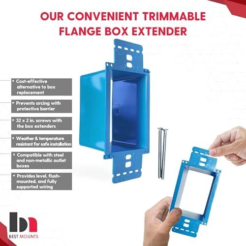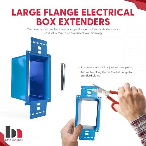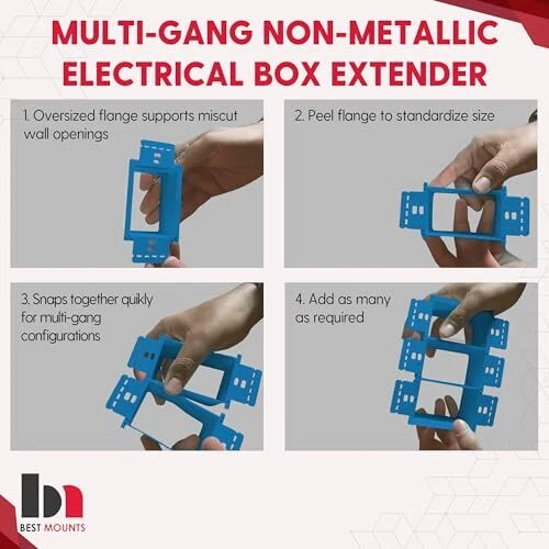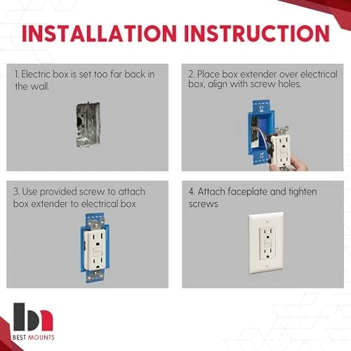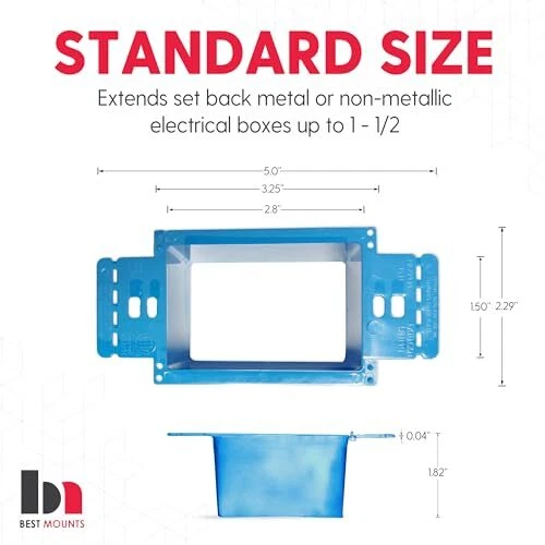 Return Policy Fast Delivery Trusted seller BestMounts - 2 Pack Electrical Power Outlet Box Extender Kit – Single Gang Box Extender - Single Receptacle Heavy Duty Plastic (Blue) Product Description High-quality electrical box extender suitable for a variety of applications: Our electrical box extender is designed to provide a solution for extending electrical boxes plastic to accommodate new or existing electrical wiring Compliant with industry safety standards for a safe and secure installation: Unlike the other outlet spacers for electrical boxes BestMounts electric outlet box extender is compliant with industry safety standards and certifications, ensuring a safe and secure installation Designed to fit easily and securely in single, dual, and triple gang electrical boxes: even with heavy equipment or electrical wiring inside,1 Gang extending electrical boxes, used for extending electrical boxes up to 1-1/2-inchesBestMounts electrical outlet box extender will remain secure and stable in a variety of electrical boxes Durable construction for long-lasting performance: install it in a commercial, industrial, or residential setting, our single-gang electrical box is built with high-quality materials to withstand the test of time and provide reliable performance for years to come Innovative Gap Bridging & Soundproofing: Innovative extenders seamlessly bridge gaps and effectively soundproof spaces. Extending fully creates a robust barrier, minimizing sound transmission through walls. Versatile and practical, these extenders offer an effective solution for reducing unwanted noise in any living or working space. Shipping Returns Payment Shipping Shipping is FREE to all addresses other than APO/PO boxes in the lower 48 states. All our stock ships from US-based warehouses. Shipped via USPS or UPS (depending on location and package weight) Unless stated otherwise, all orders will ship within 24-72 hours of your payment being processed. Check our feedback to see the great reviews of FAST shipping we offer. Returns Seller does not accept returns Payment We currently accept payment via eBay managed payments only. Once payment is cleared, we will dispatch your shipment within 1-3 business days. Please refer to the "Shipping" tab for more information regarding shipping speed to your destination.