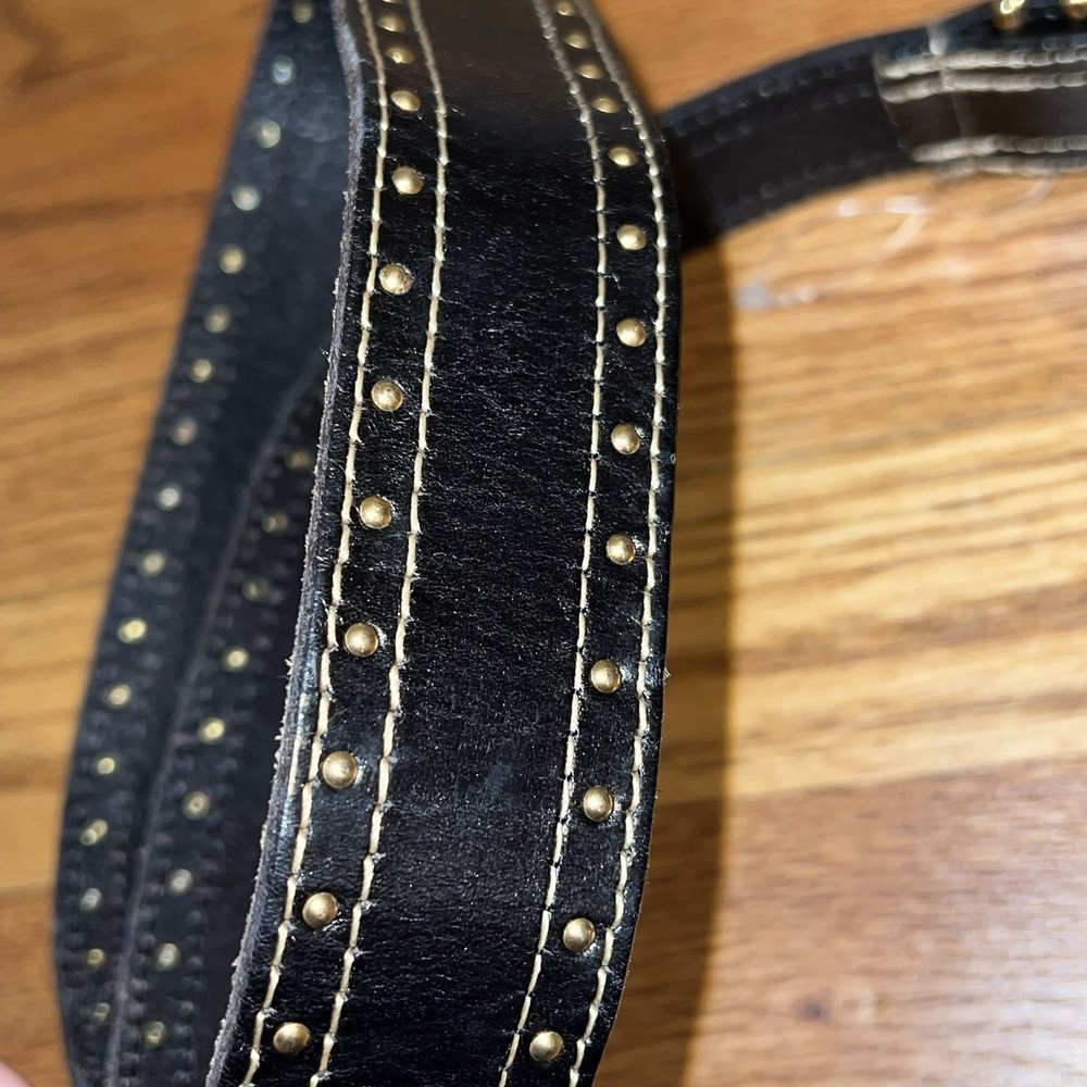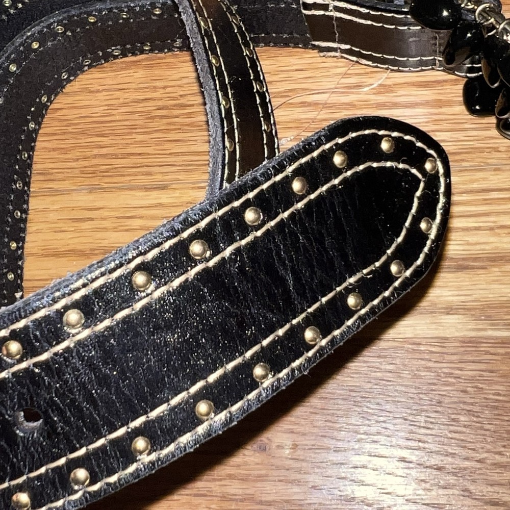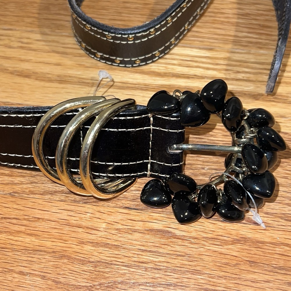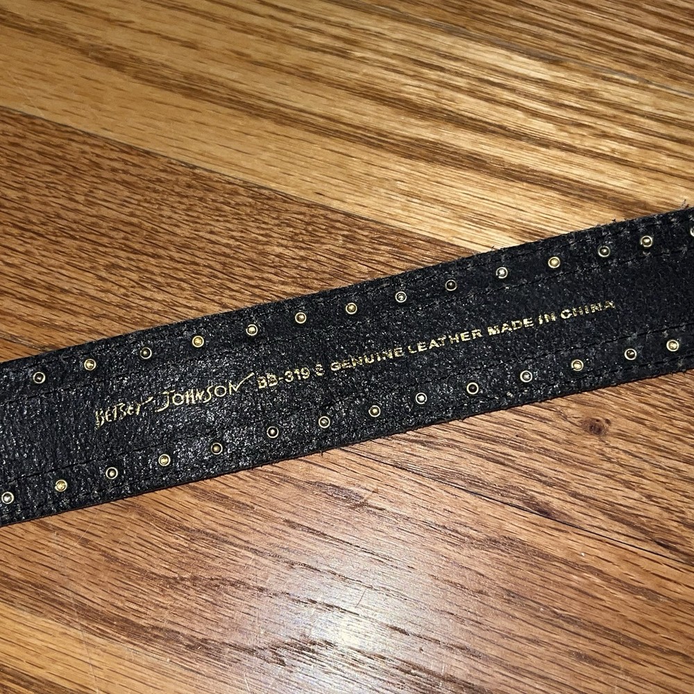 Betsey Johnson Genuine Leather Black Leather Belt with Gold Accents and Heart Size S Elegant black leather belt featuring stylish gold accents. Perfect for adding a touch of sophistication to any outtit. Genuine leather belt in black with gold color tone studded accents and tan stitching Gold tone hardware buckle with heart shaped beads or charms Size Women's Small Style BB-319 Western, maximalist, large buckle, Southern, cowgirl, cowboy, biker, sophisticated, rocker, rock, punk, grunge, emu, goth, hardcore, classic edgy city