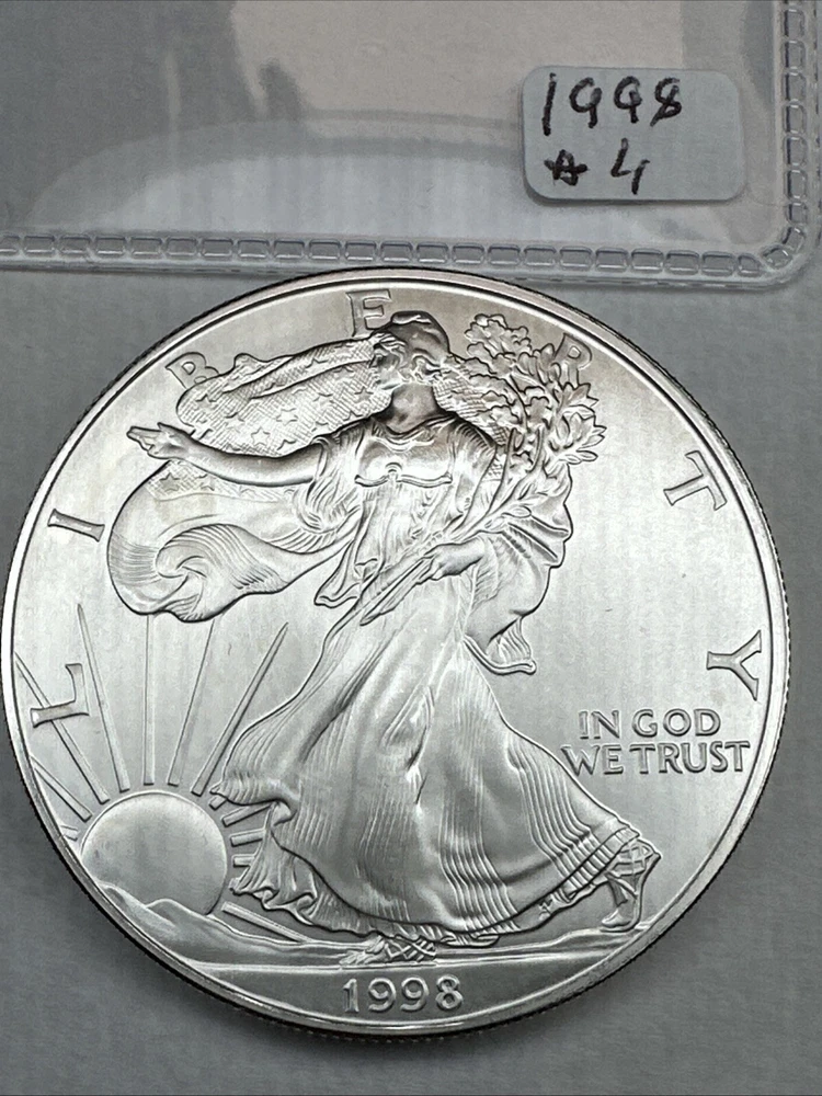 Fineness: 0.999 Strike Type: Business Circulated/Uncirculated: Uncirculated Coin: American Eagle Year: 1998 Denomination: $1 Composition: Silver Total Precious Metal Content: 1oz Grade: Ungraded Precious Metal Content per Unit: 1 oz Country/Region of Manufacture: United States Brand/Mint: U.S. Mint Certification: Uncertified Mint Location: Philadelphia