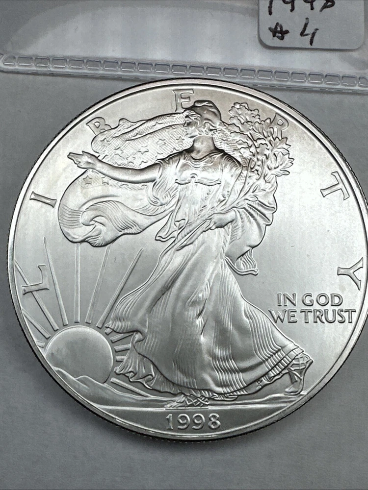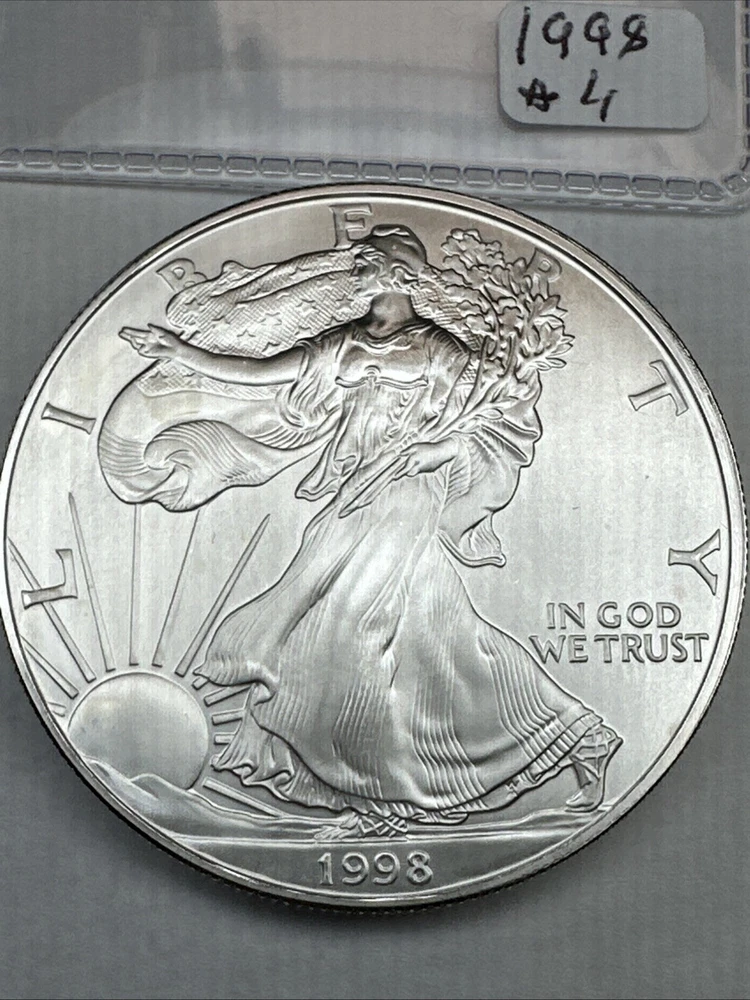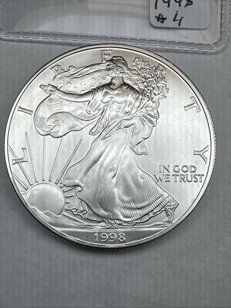 This is a 1998 American Silver Eagle coin, minted by the U.S. Mint in Philadelphia. It contains 1 troy ounce of .999 fine silver and has a denomination of $1. The coin is uncirculated and has not been certified. This particular date is considered a better date for collectors.